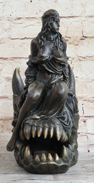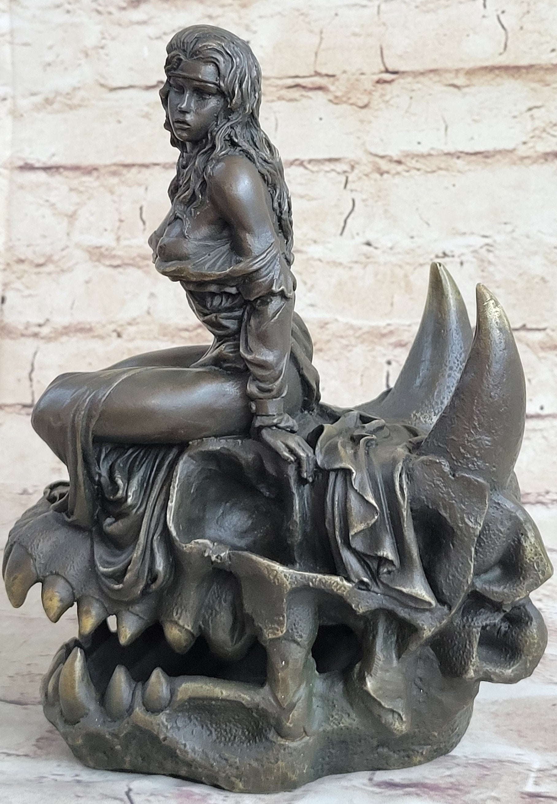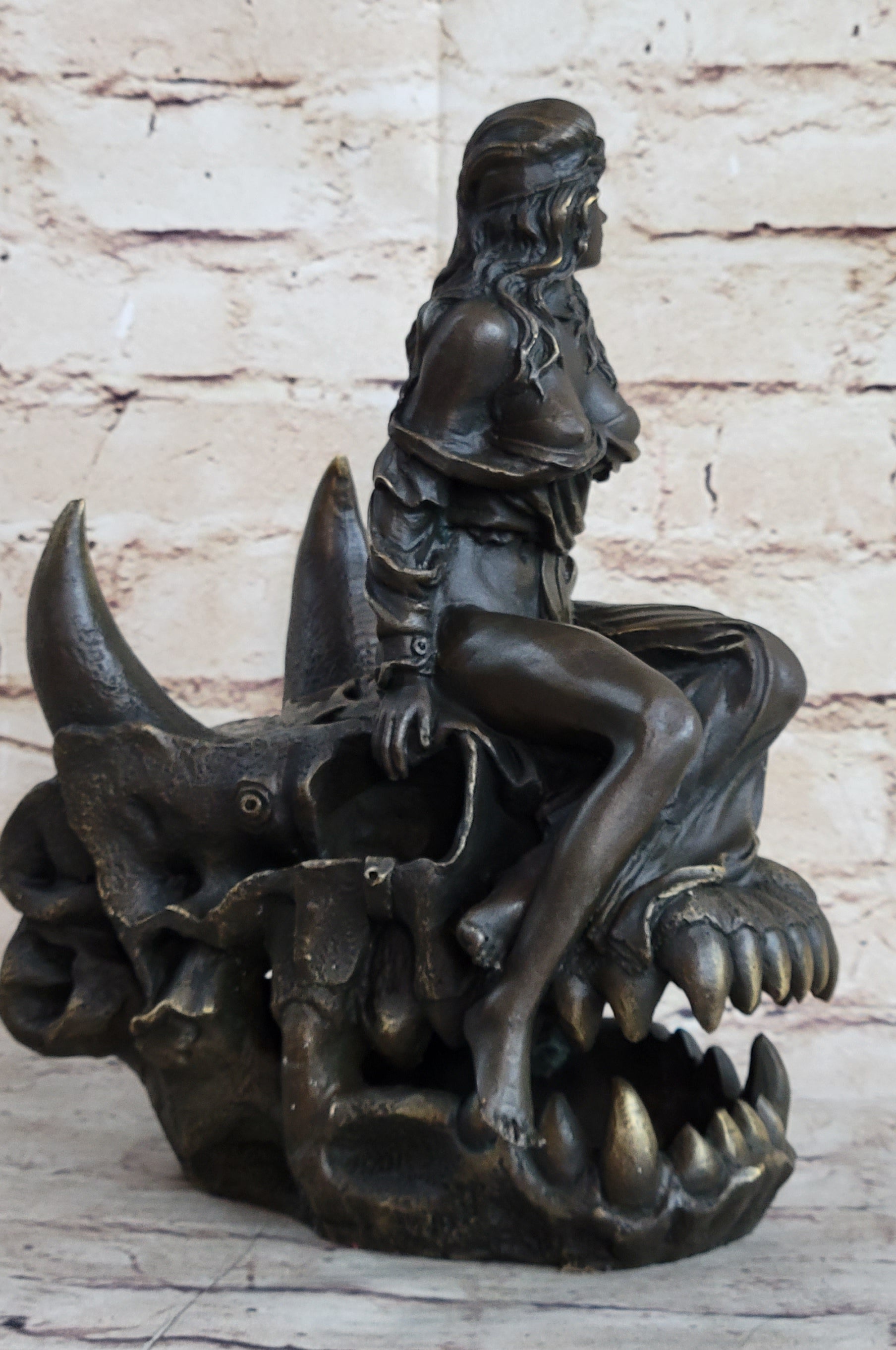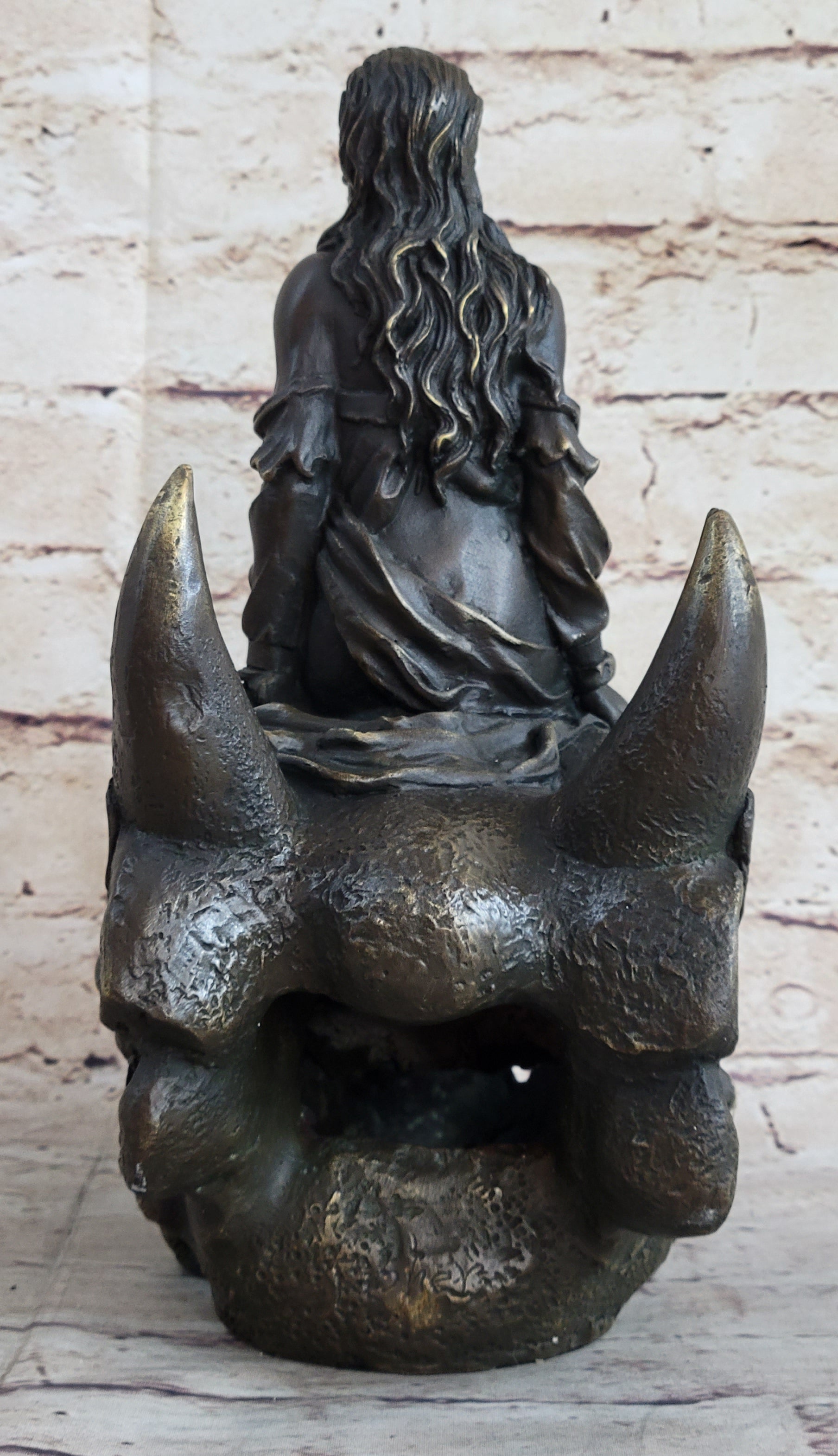 Girl Sitting on Horned Demon Dragon Skull Bronze Figure Sculpture Occult Art 9.5" x 7"
