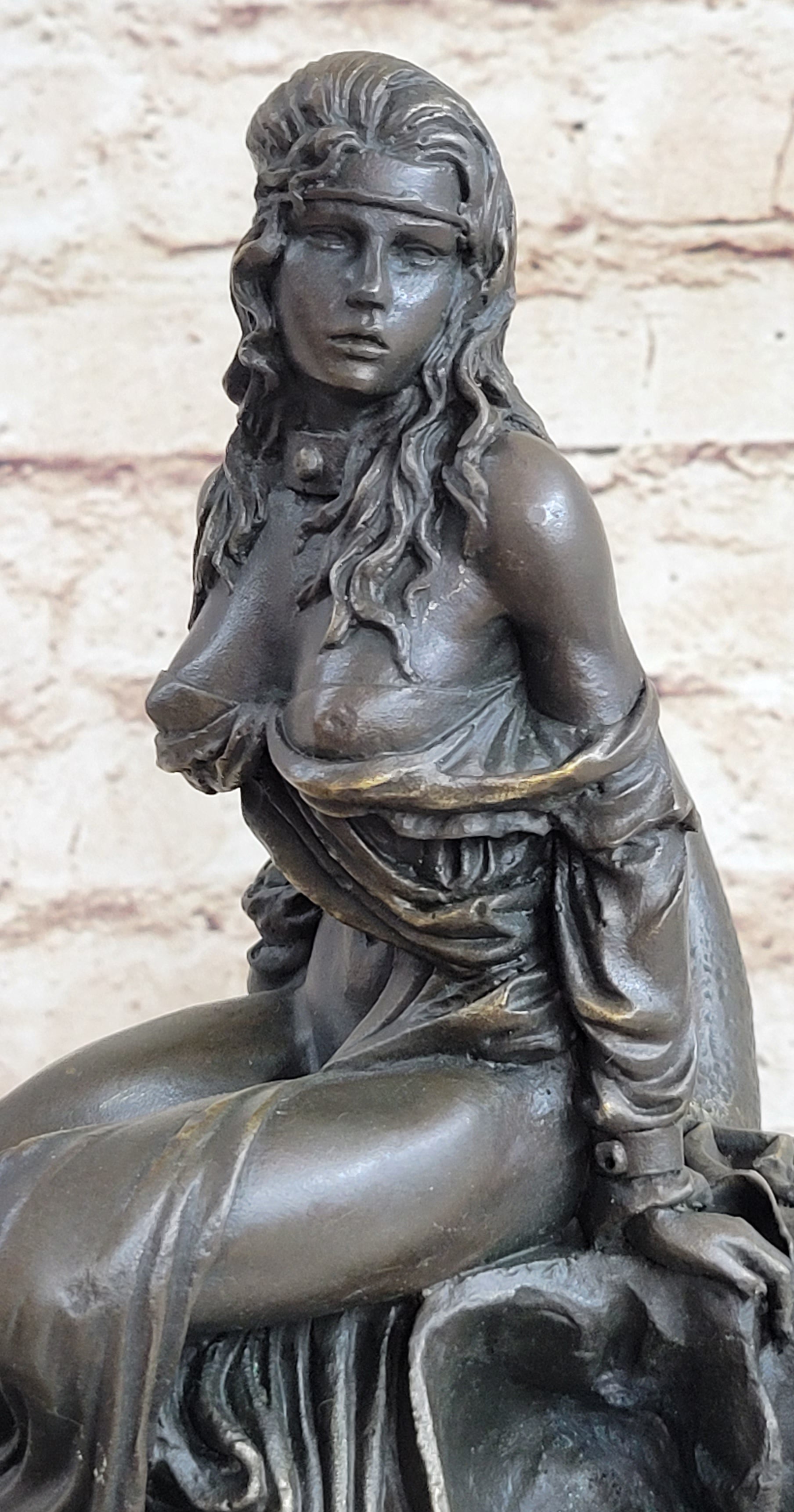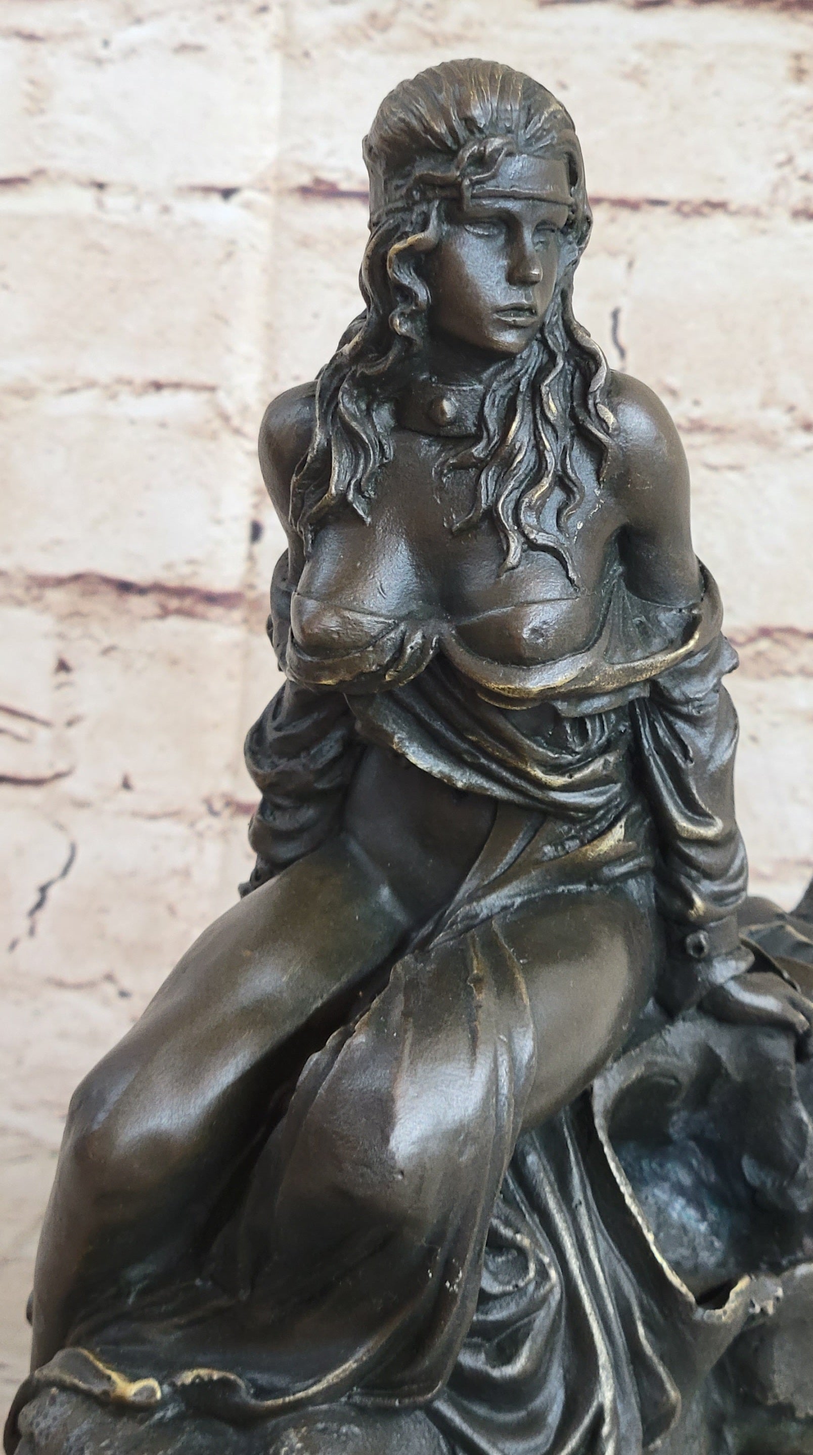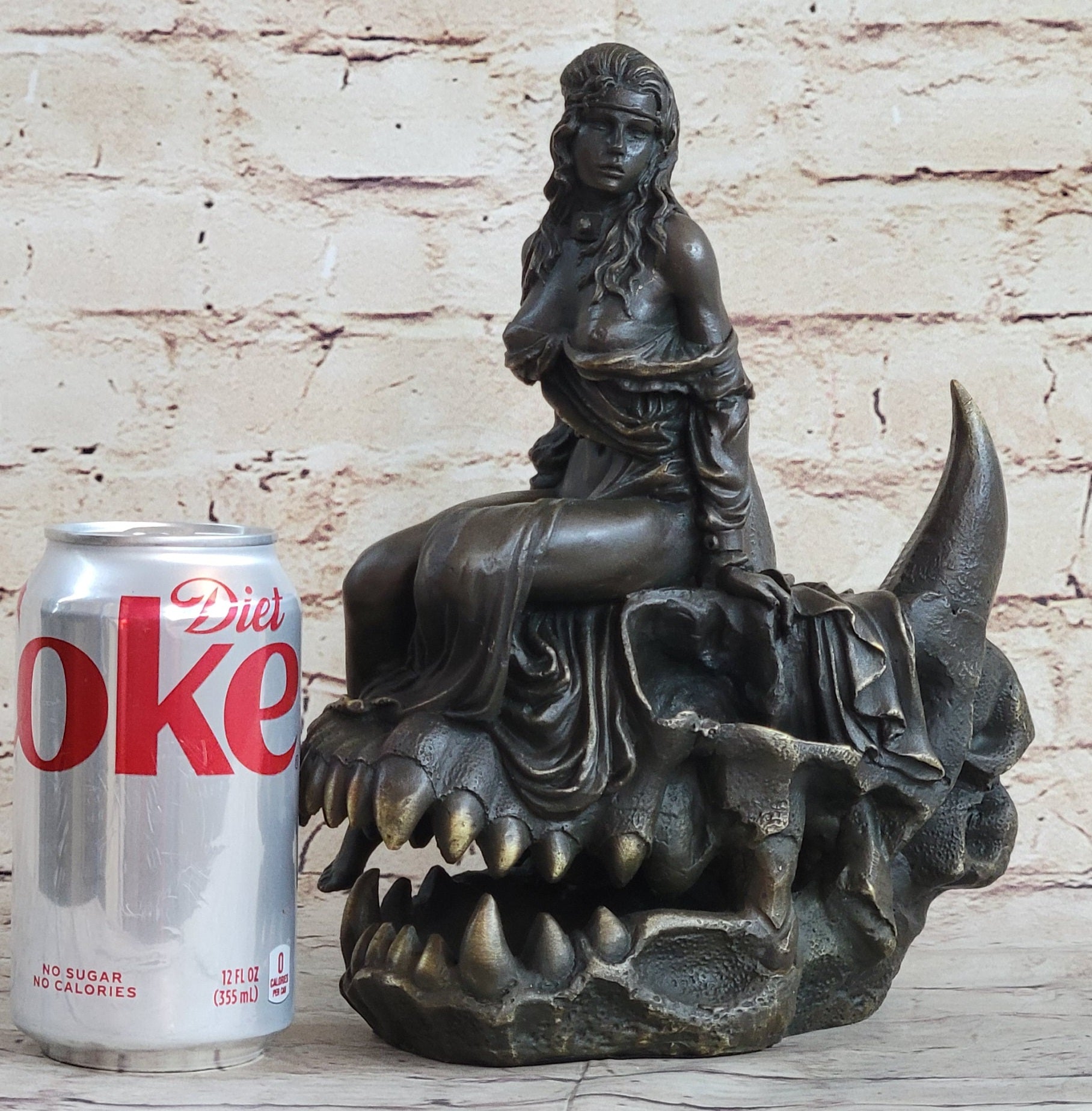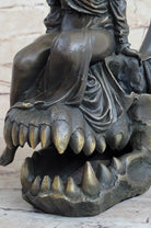 Girl Sitting on Horned Demon Dragon Skull Bronze Figure Sculpture Occult Art 9.5" x 7"