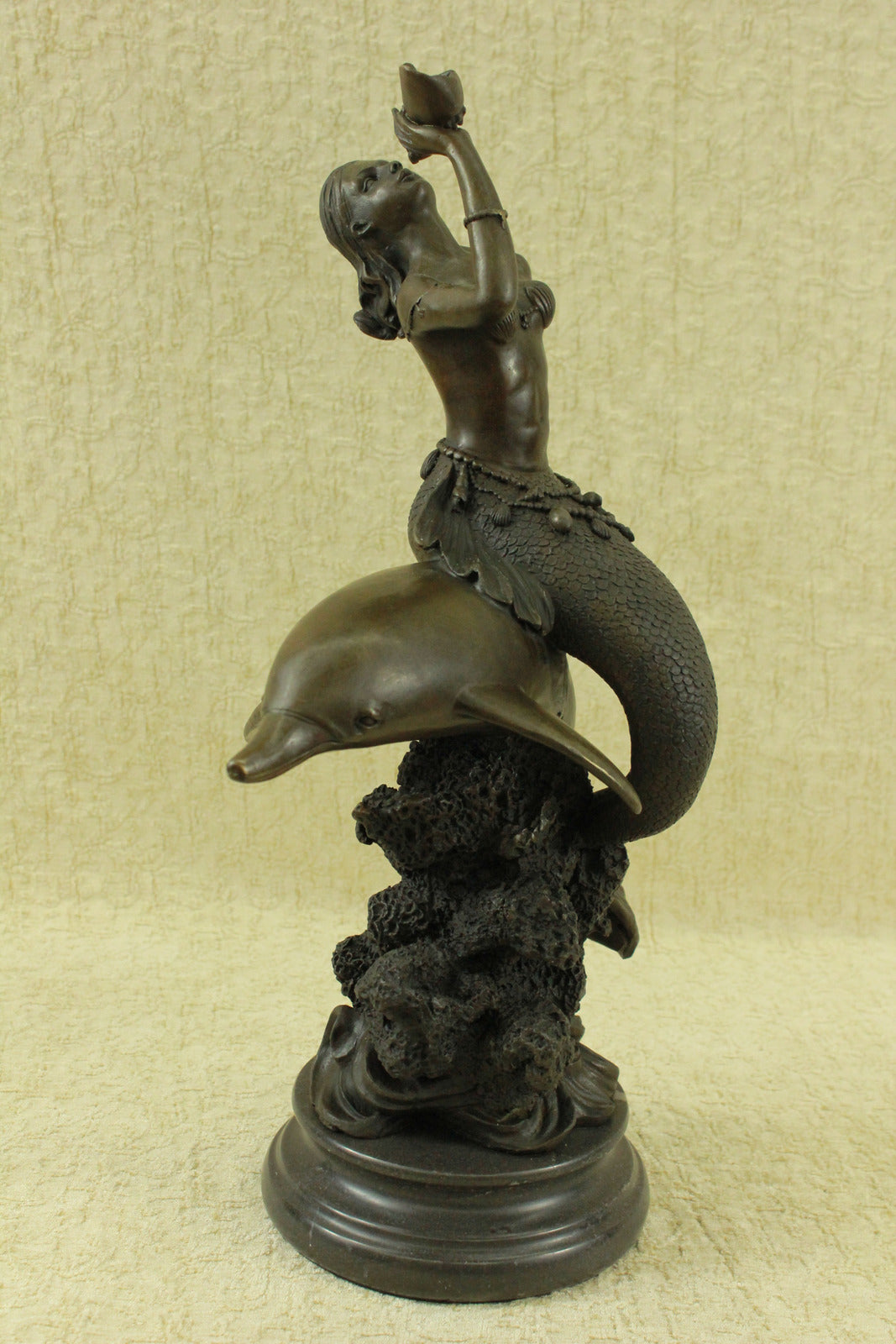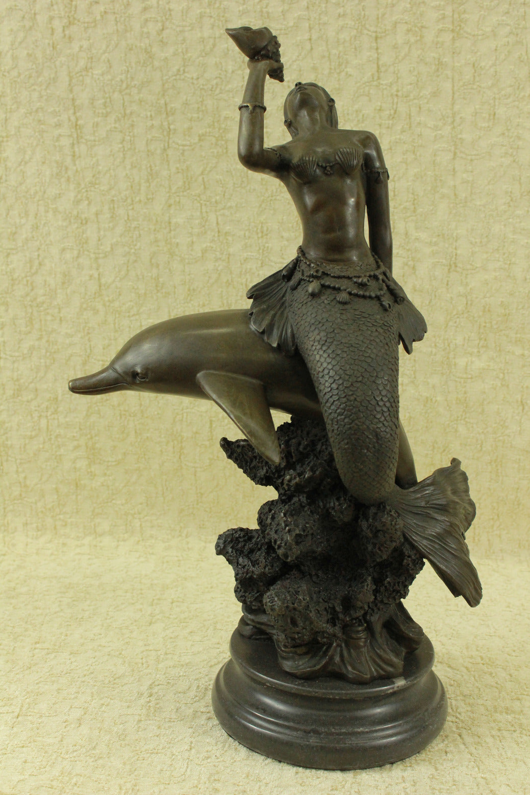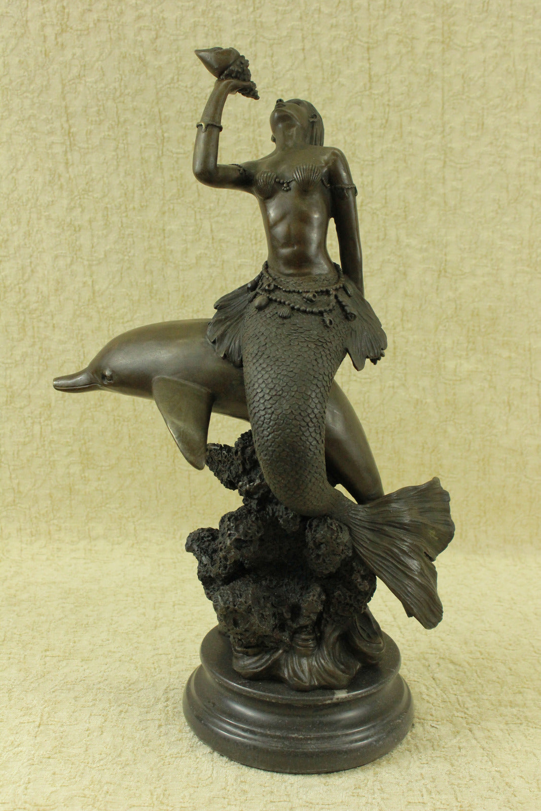 LARGE BRONZE MARBLE BASE STATUE MERMAID SCULPTURE MYTH ART WITH DOLPHIN FIGURE