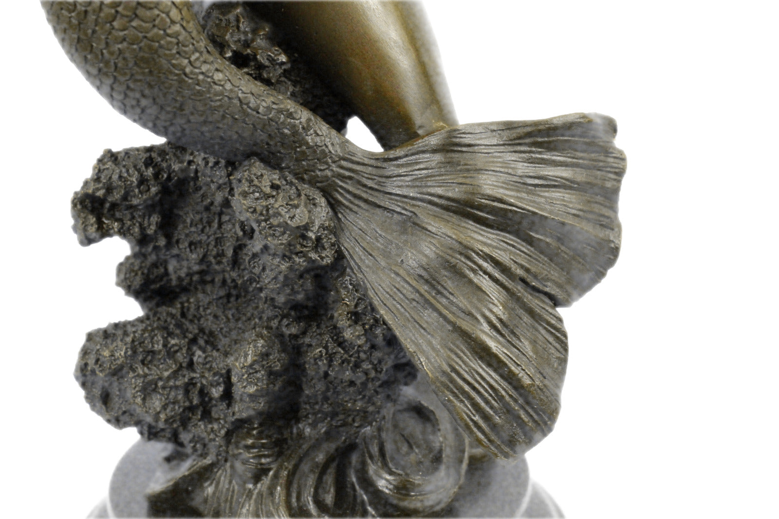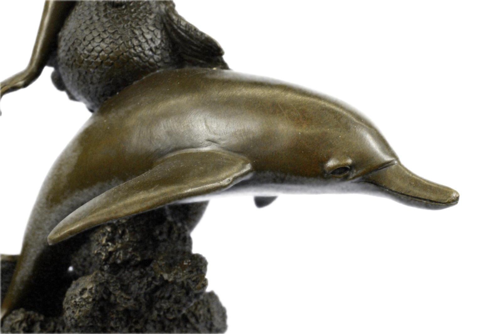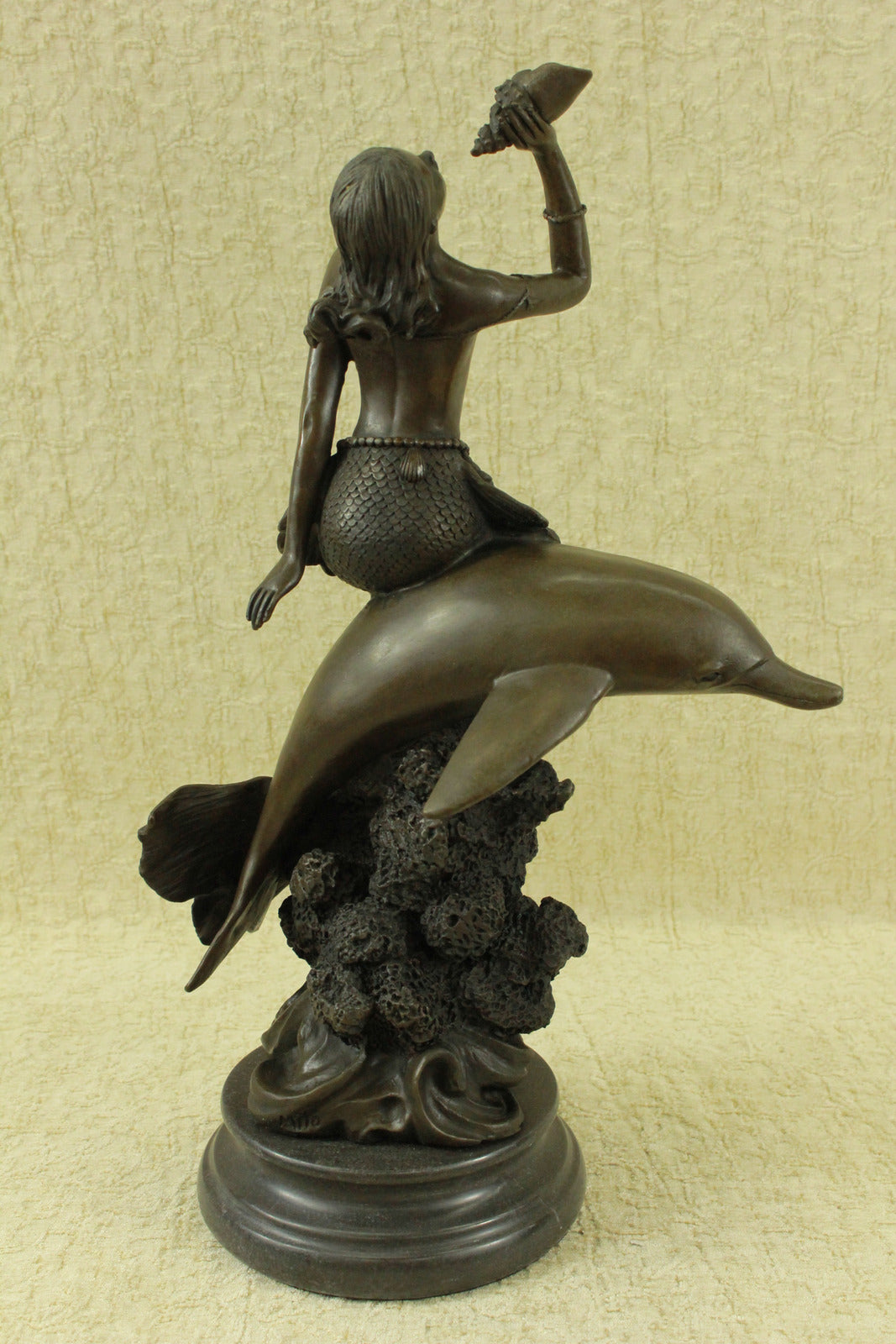 LARGE BRONZE MARBLE BASE STATUE MERMAID SCULPTURE MYTH ART WITH DOLPHIN FIGURE