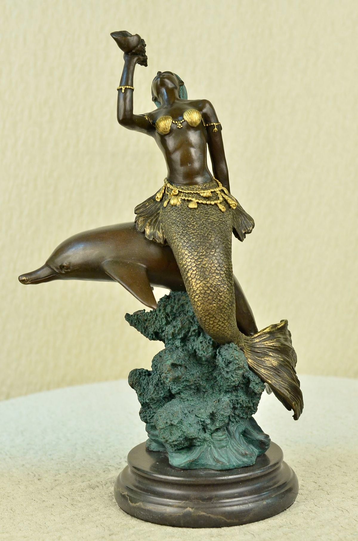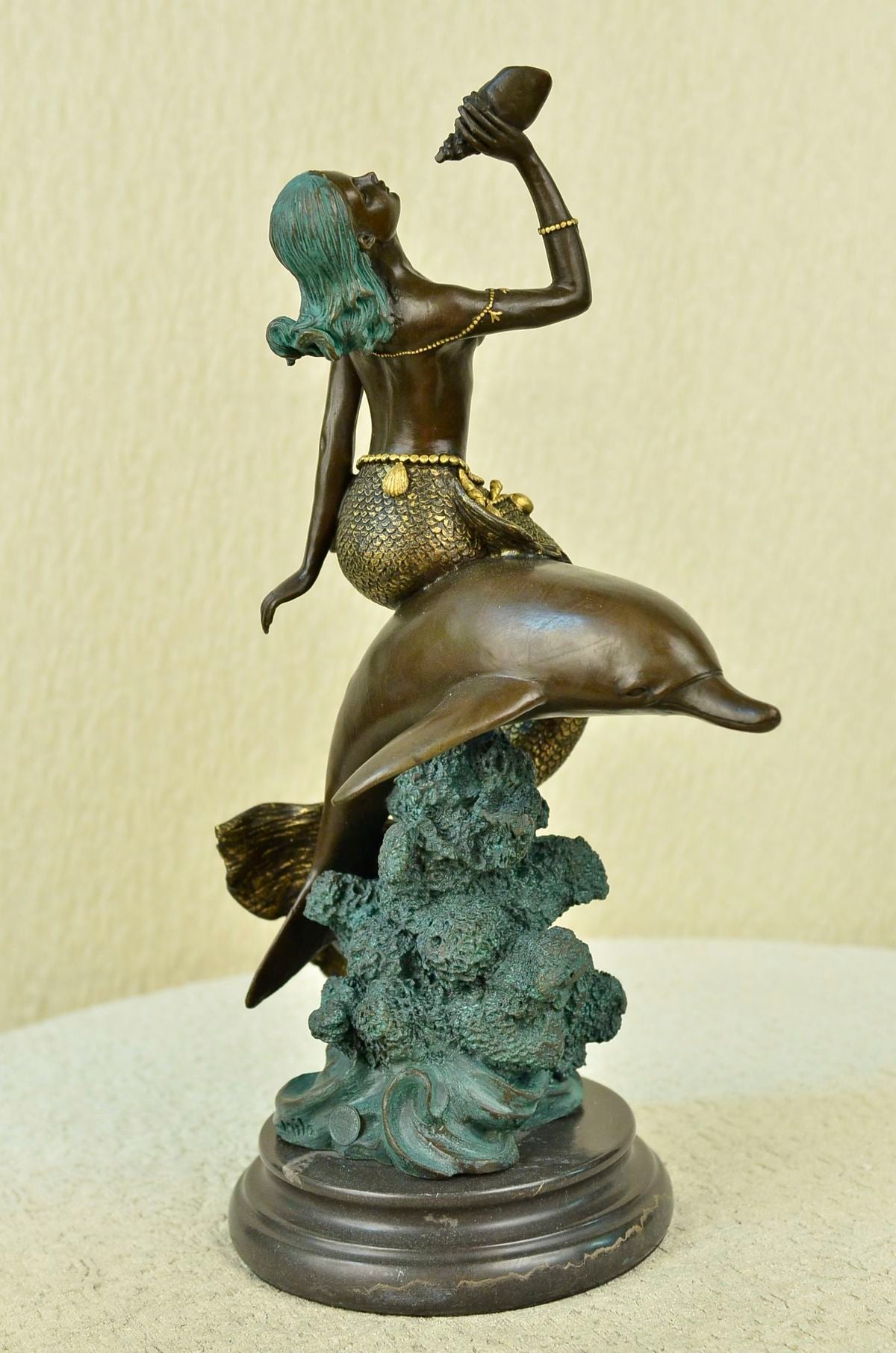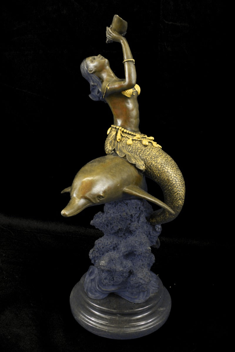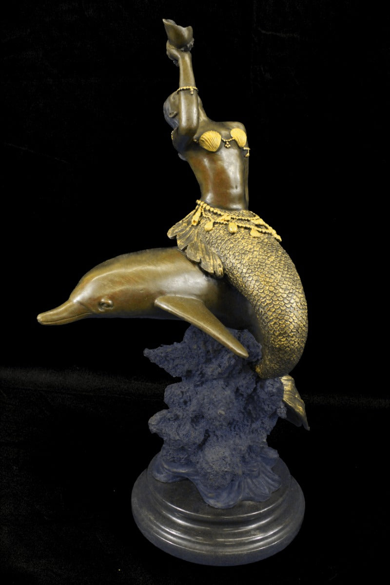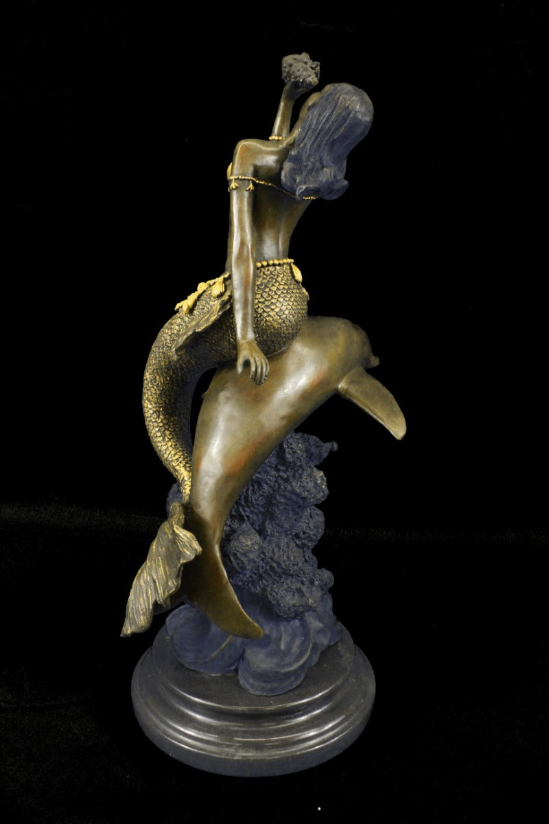 Original Home Decor Gilt Gold Patina Milo Mermaid Rides Dolphin Bronze Figurine