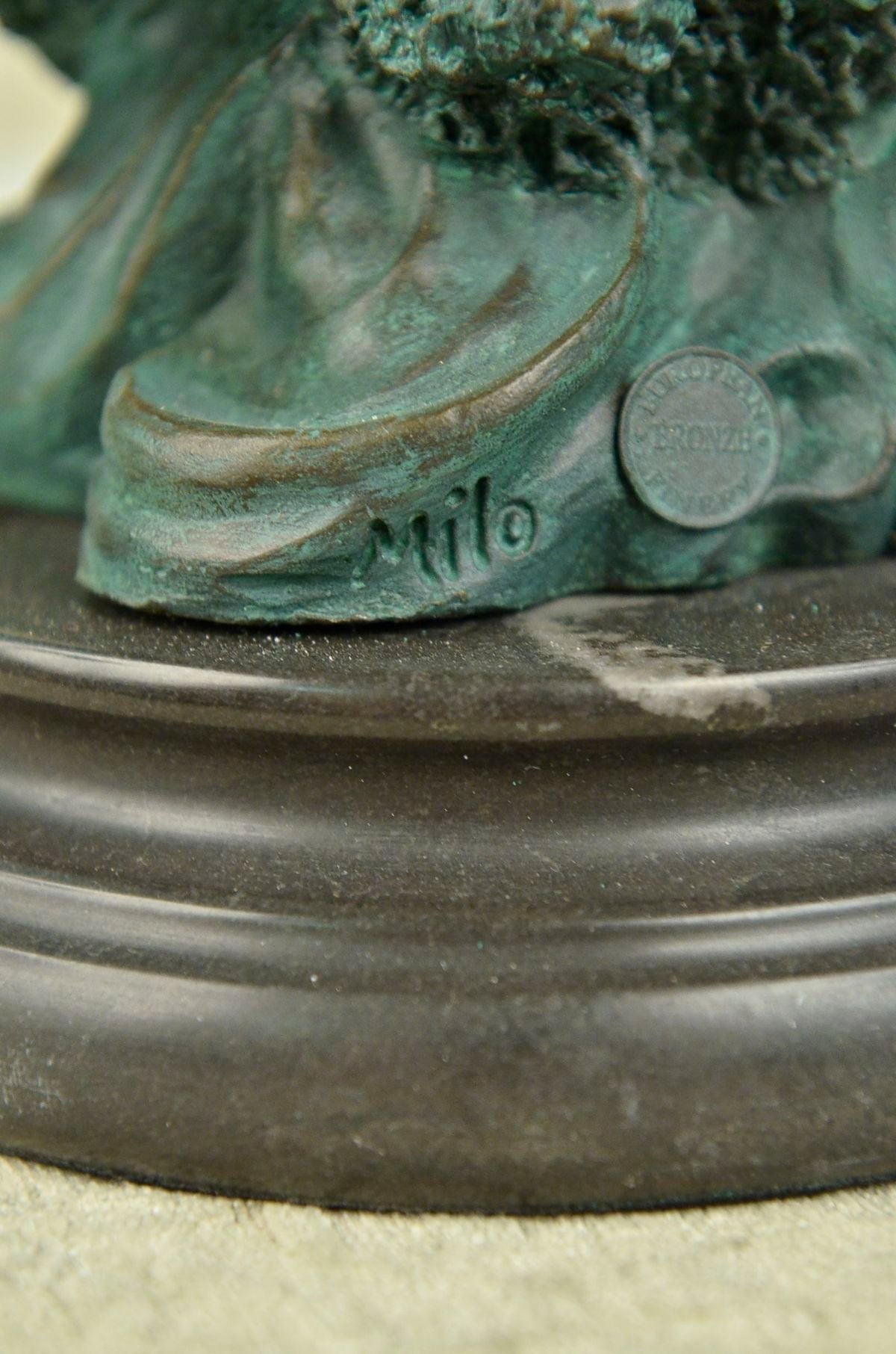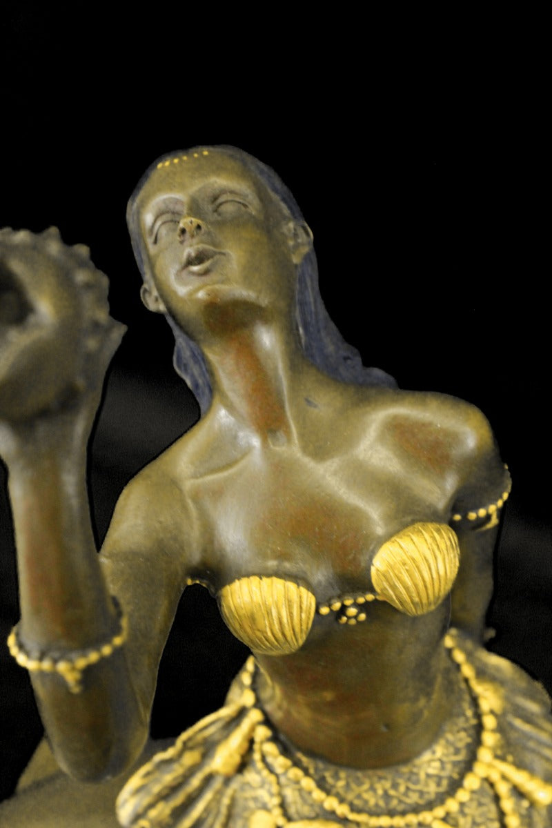 This lost-wax bronze is of an enchanting mermaid who sirens her conch alluring all water spirits to her. This mythological creature, entirely in brown patina, rests with her free-spirited dolphin companion among the rich coral of her underwater kingdom. Exquisite detail is marked in the scales of her fish tail and the textured coral bottom. This Milo sculpture awakens in the viewer, the mystery and beauty in the unknown, reviving the mysticism of the ageless tales of folklore.The handmade bronze sculpture was cast using the archaic method of lost-wax casting and stained with a brown patina finish for perpetuation. She is mounted upon a black marble base with the European Bronze Finery stamp of quality and the artist Milo signature.