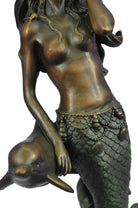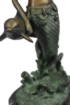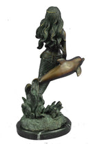 This gorgeous sculpture features a beautiful mermaid swimming with a cute dolphins is expertly cast in the finest bronze utilizing the revolutionary Lost Wax Method which assures you of the highest degree of detailing available. A rich green patina finish enriches the mermaid with the dolphins in a golden bronze color of this well casted bronze sculpture. The overall presence is breath-taking mounted on a oval black marble base. This lovely figure stands 14? tall as she holds her long hair and brings a bit of the fantastic to your room or mantle.Bronze Dimensions with Marble Base:Height 14" X Width 8"