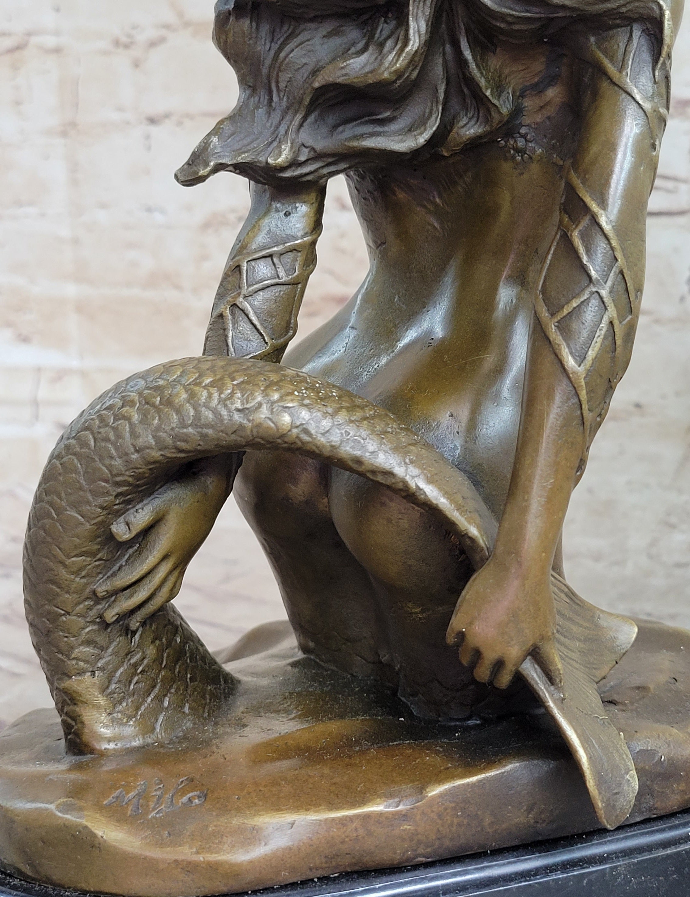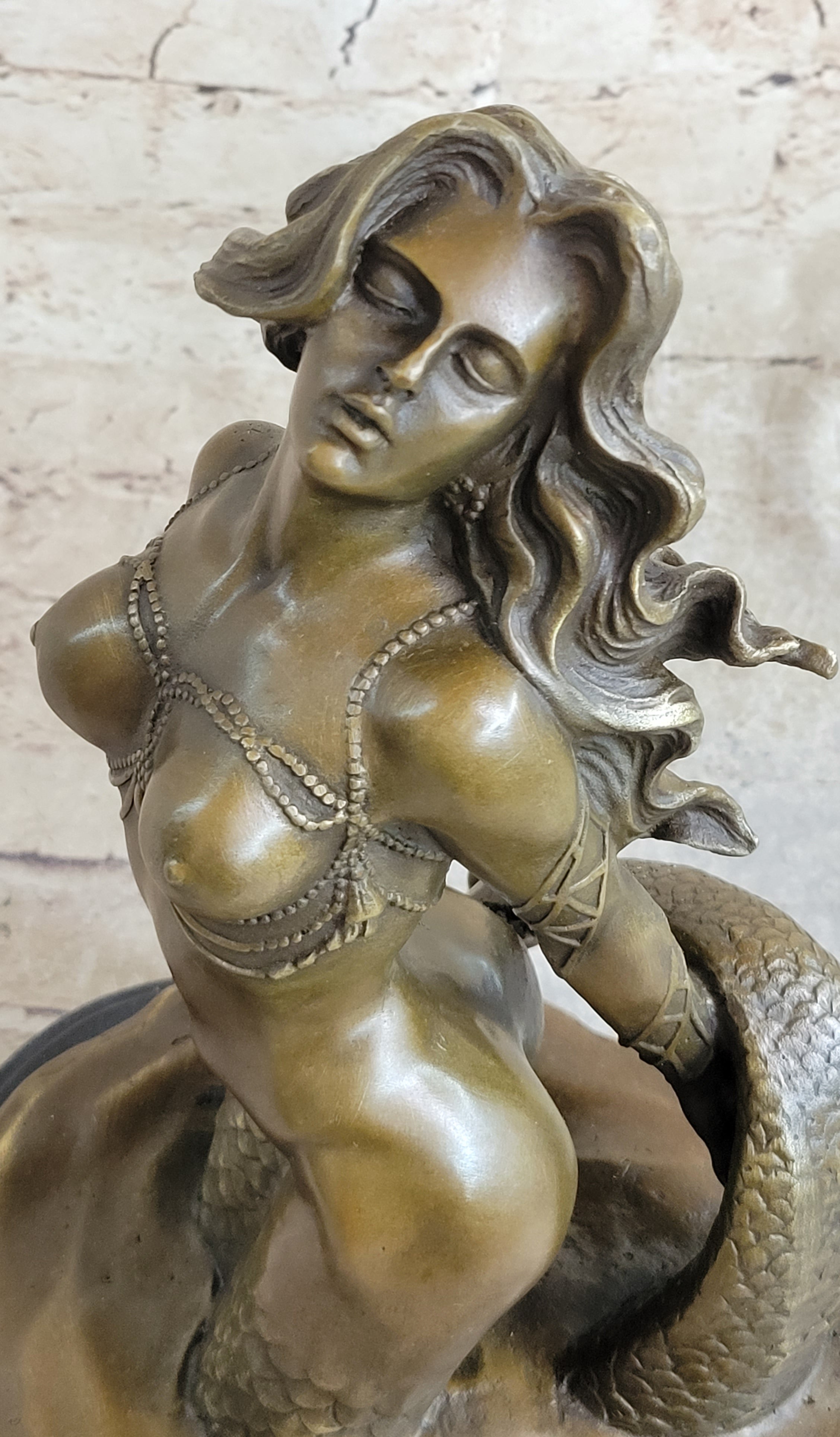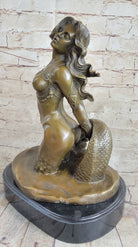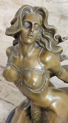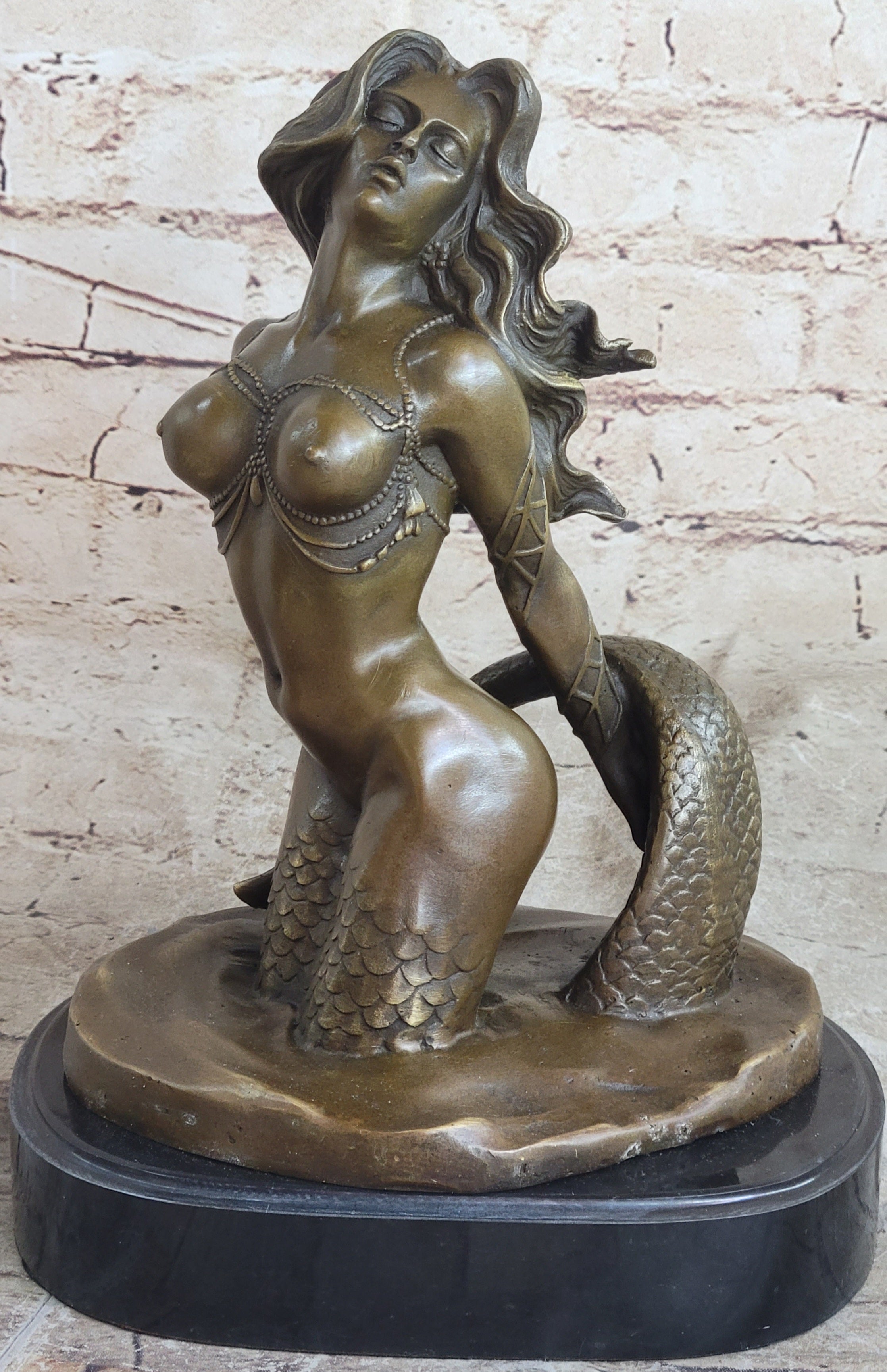 Signed Original Sexy Nude Mermaid Bronze Sculpture Mythical Marble Figurine Gift