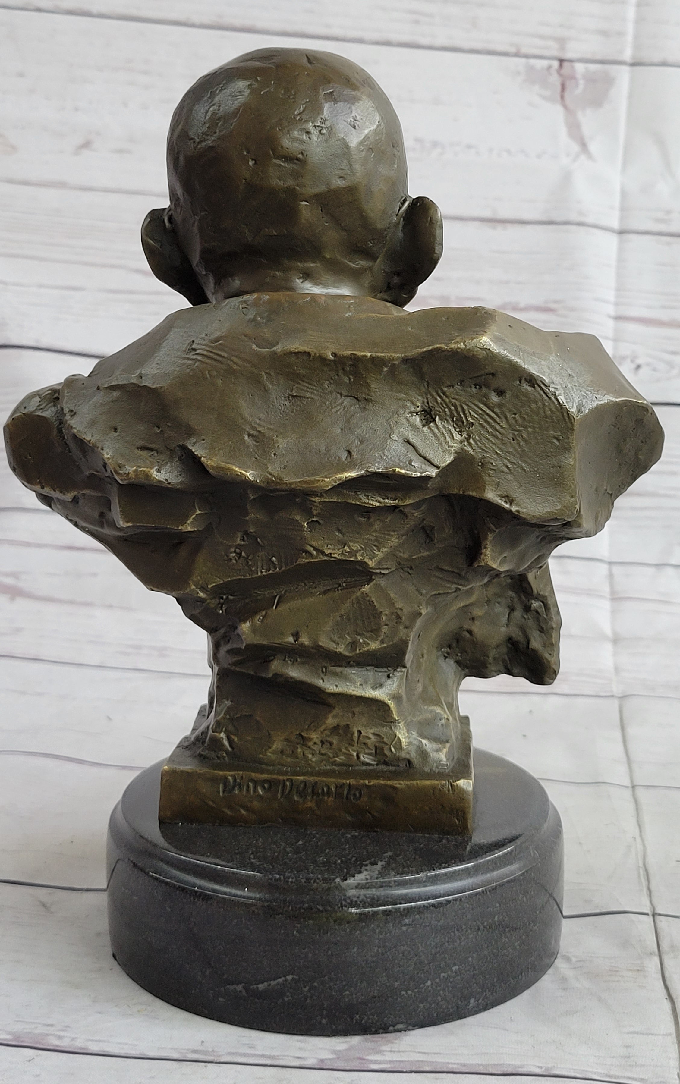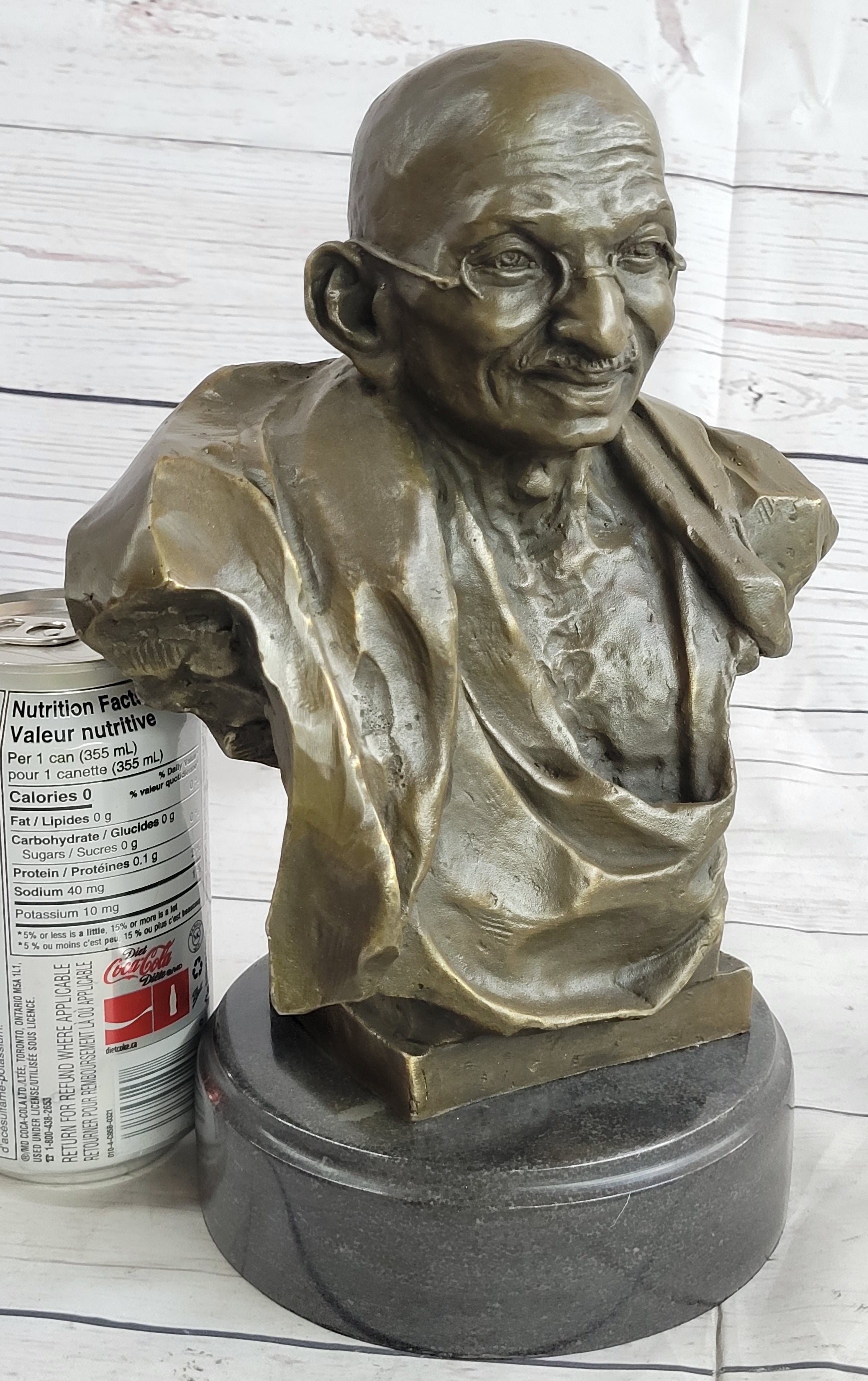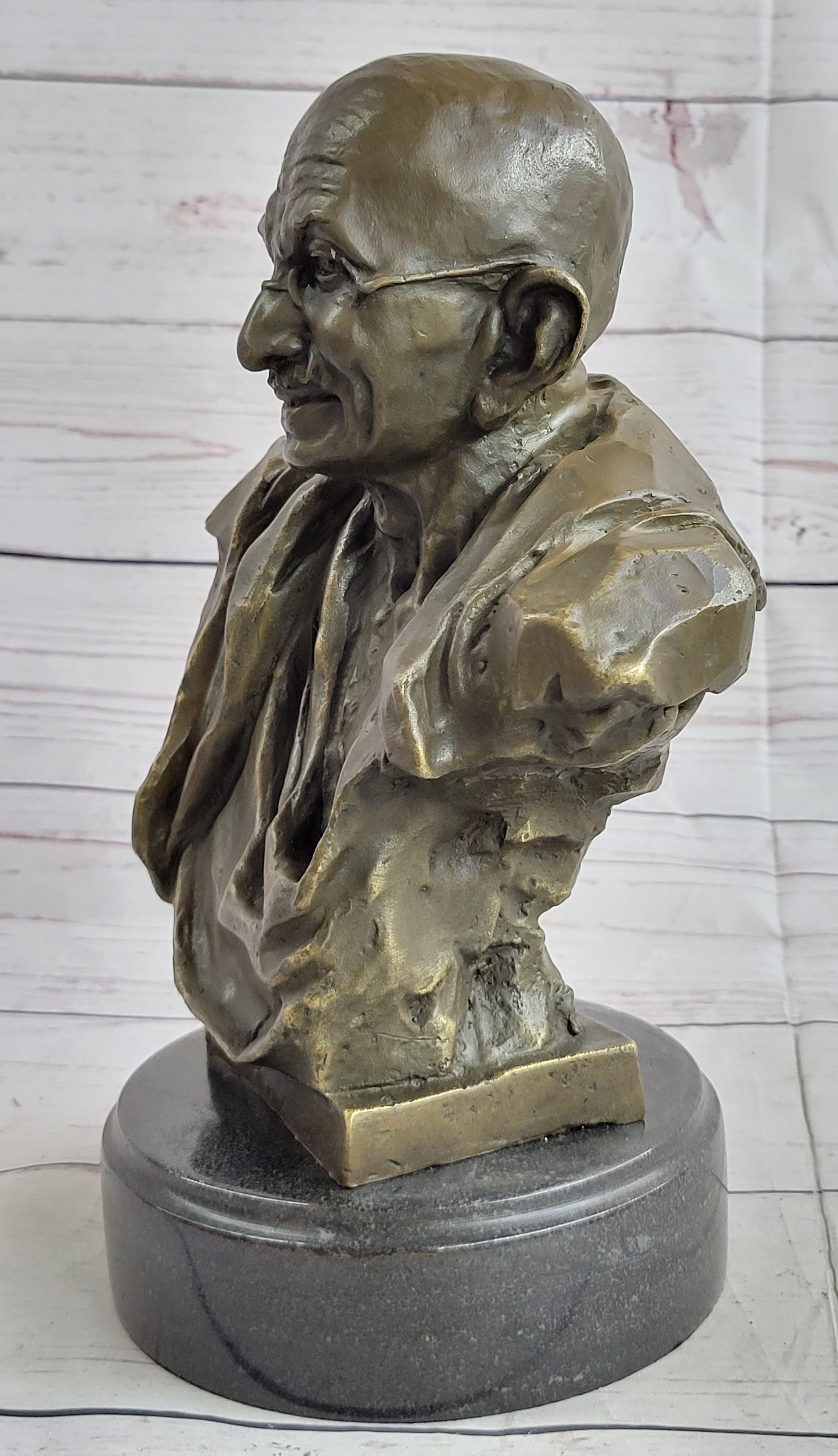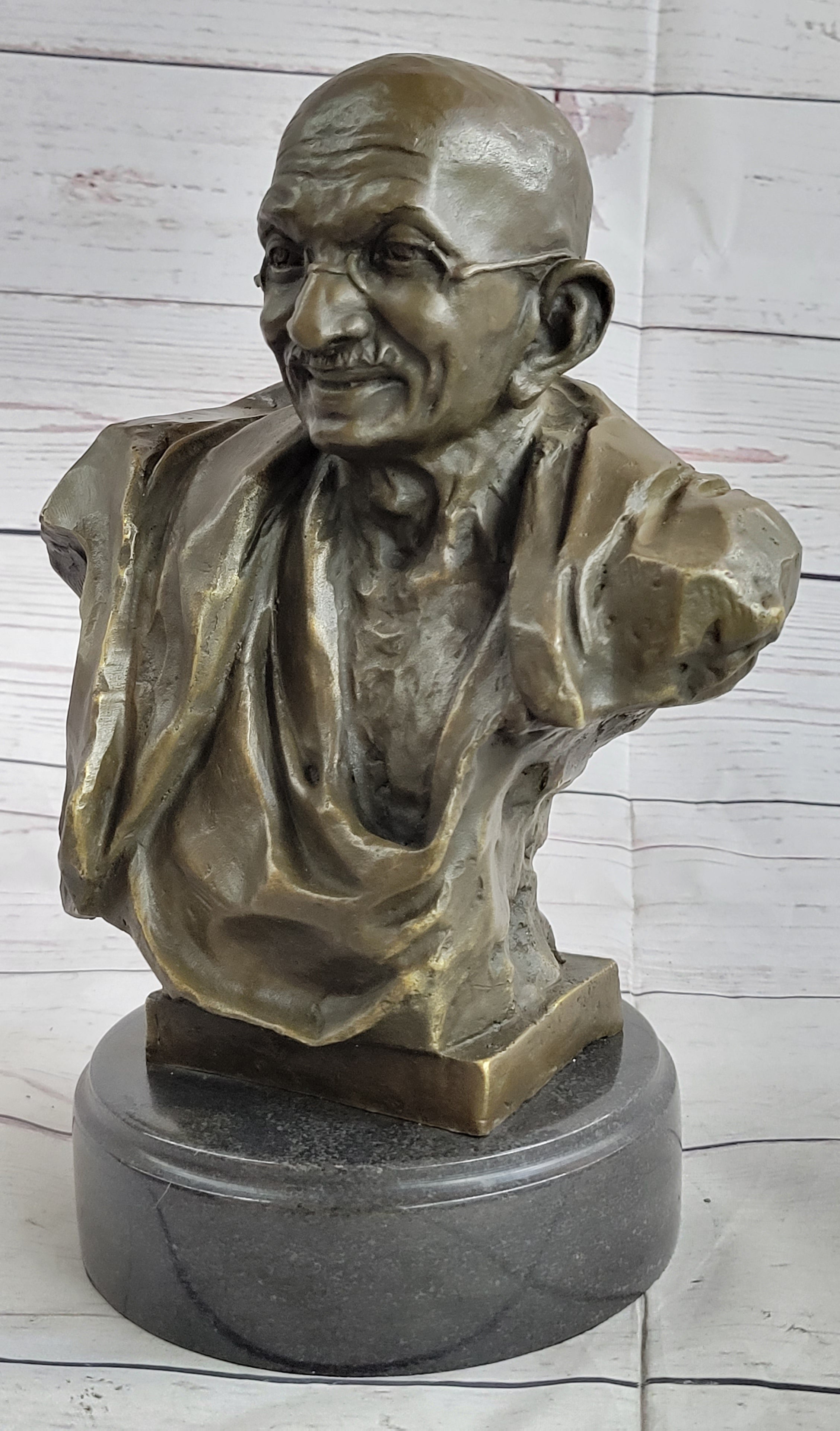 As a collector edition piece, this bust is a rare find, and its artistic value is sure to appreciate over time. It embodies the spirit of Gandhi's philosophy and serves as a timeless reminder of the enduring power of nonviolence. Don't miss the opportunity to own this exquisite work of art that encapsulates the essence of a great leader's teachings.Bronze Dimensions with Marble Base: Height 10" X Width 7"