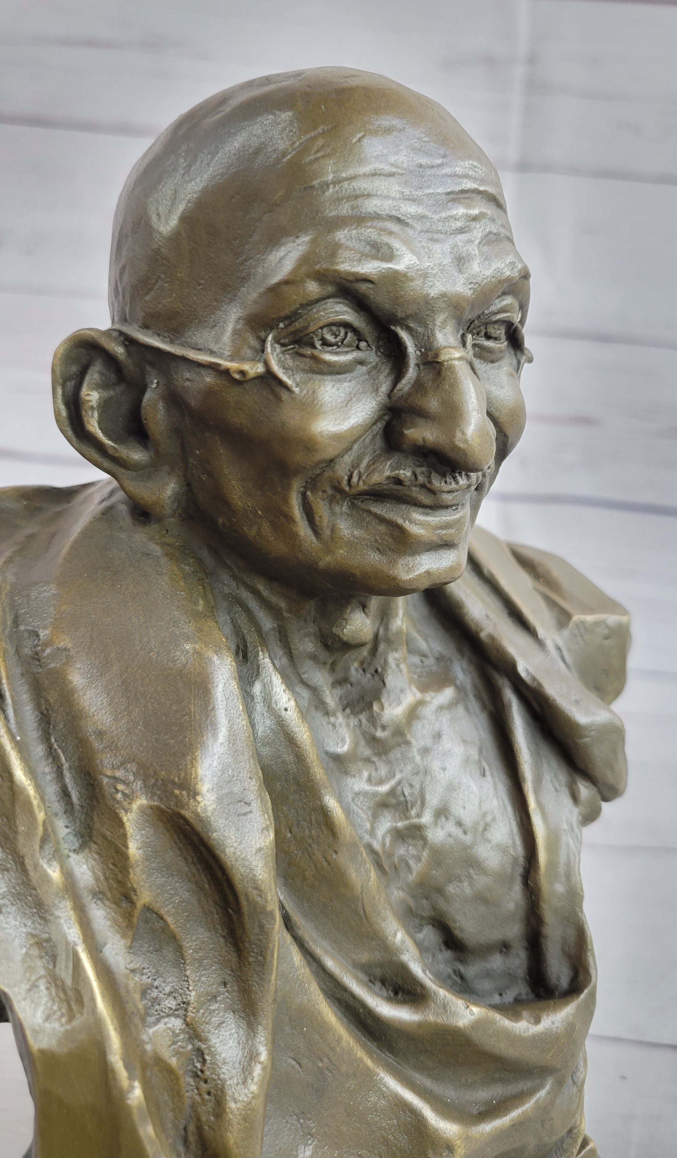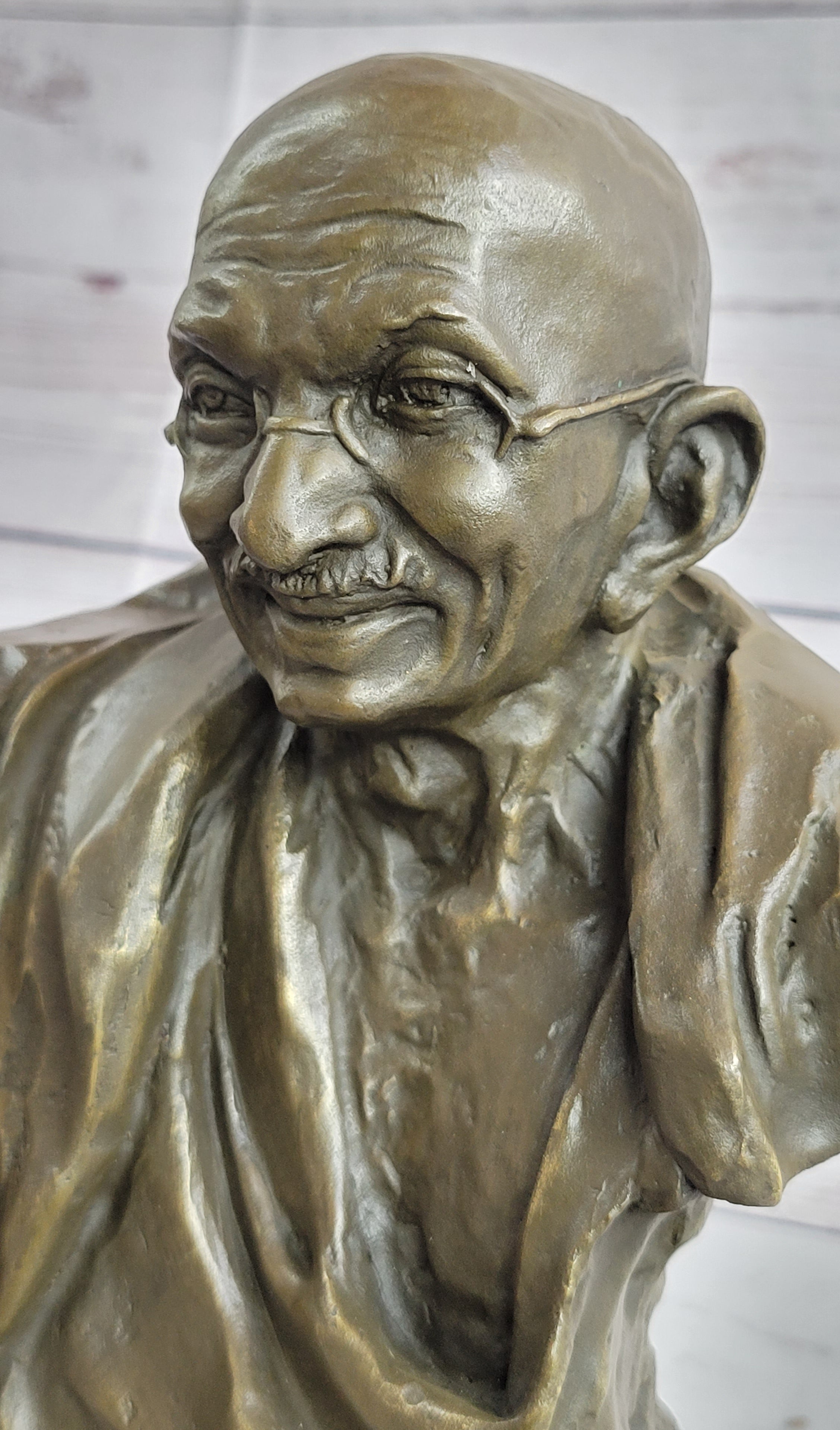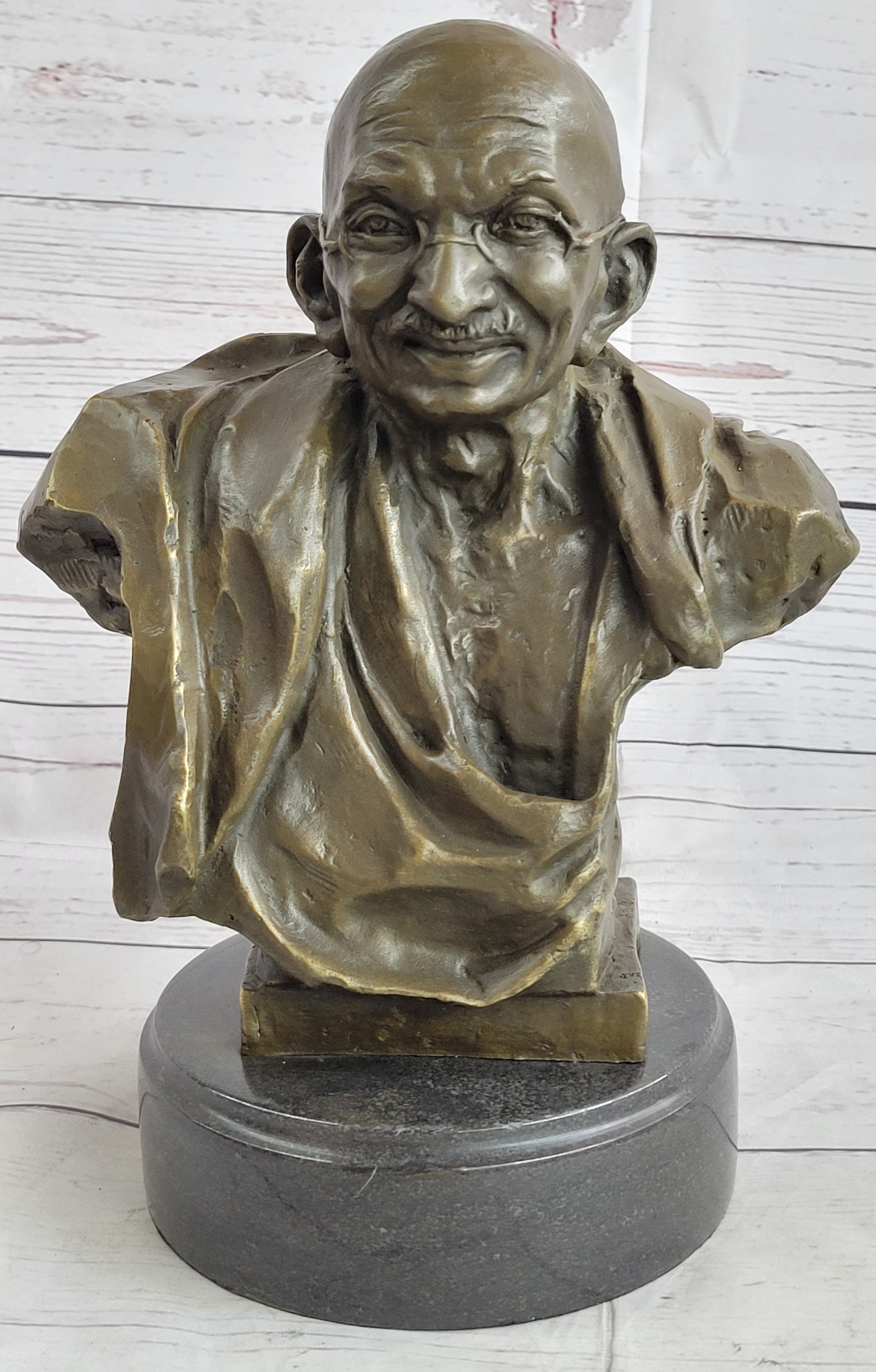 Resting elegantly on a marble base, this sculpture beautifully captures Gandhi's tranquil expression, paying homage to his profound legacy. Whether you're a history enthusiast or looking to enhance your living or workspace with a meaningful piece of art, this sculpture is a perfect choice. It not only serves as a remarkable tribute to Gandhi's principles of nonviolence but also adds a touch of elegance to any environment.