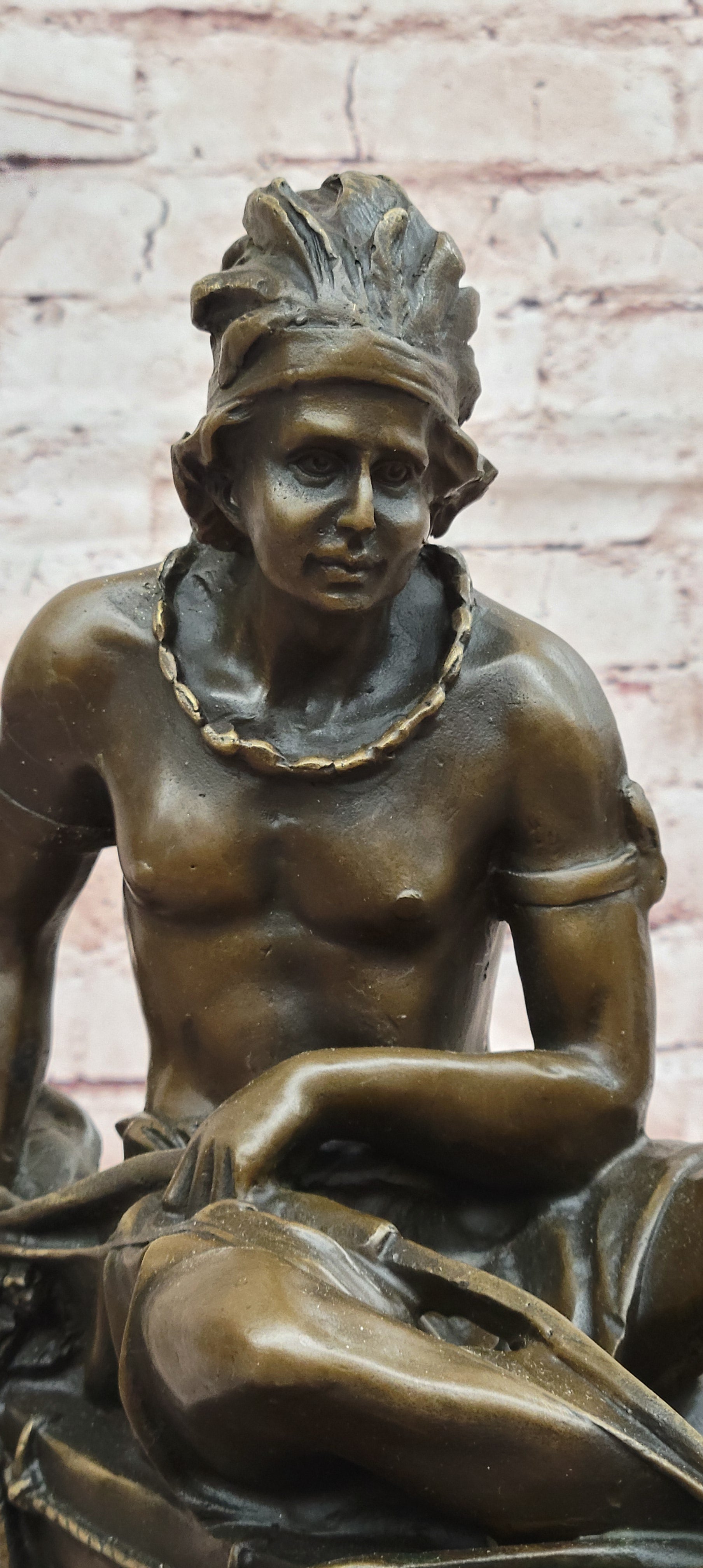 Step into the rich cultural heritage of Native American life with this magnificent bronze study of a seated Native American man in his canoe. Exquisite in detail, the sculpture captures the essence of the man's connection to nature, with a feathered headpiece, a bow and arrow, and oars for his canoe. The craftsmanship is extraordinary, and each viewing reveals new intricacies, from the meticulously beaded necklace and ankle bracelet to the authenticity of the facial features. The French artisan Duchoiselle, living and working in the 19th century in France, skillfully brought this piece to life, showcasing his mastery in bronze sculpting.