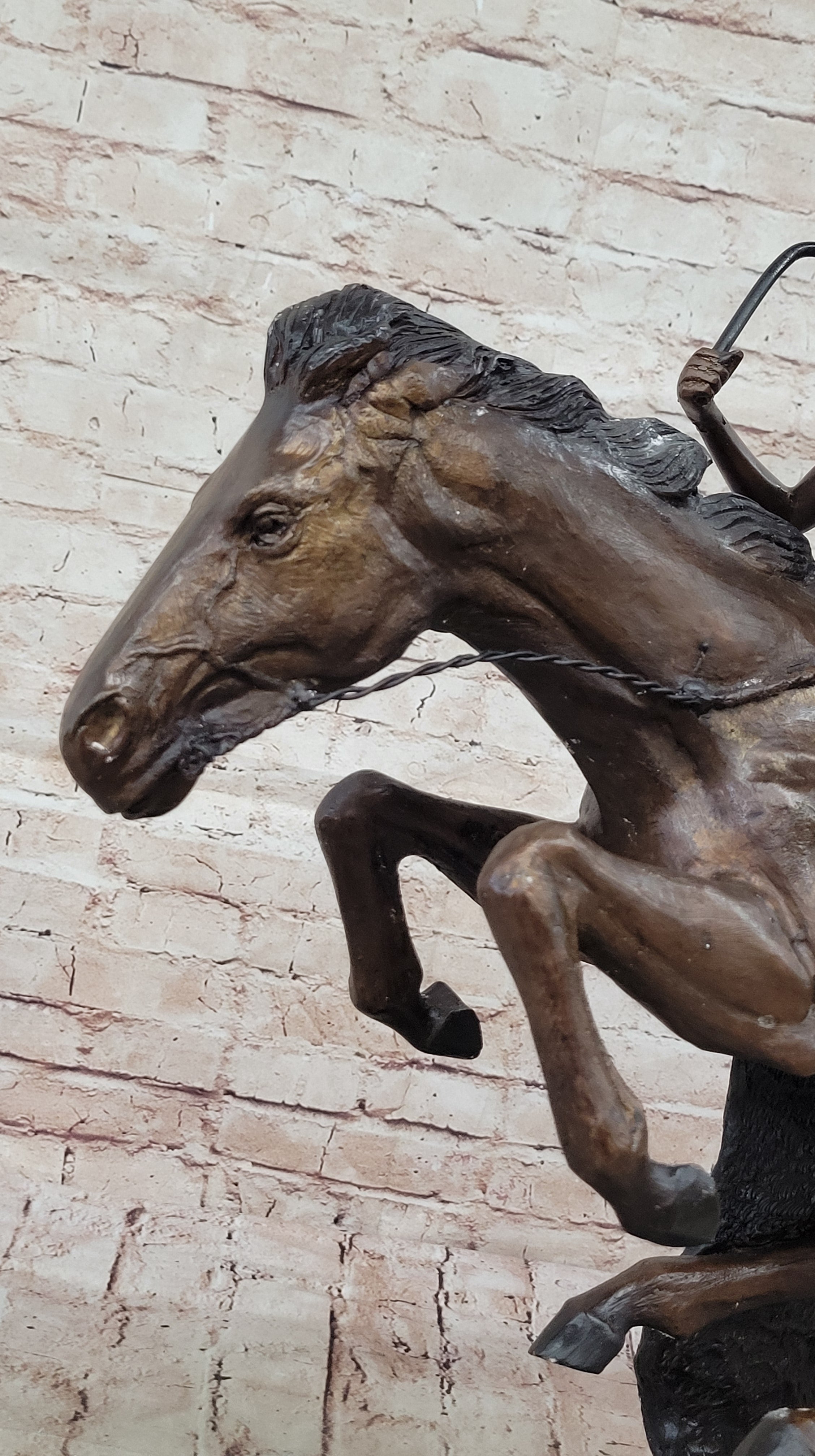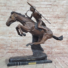 Experience the raw spirit of the American West with our captivating bronze sculpture, "Cheyenne." Witness a Native American warrior on horseback as they gallop fearlessly across the vast desert. With a spear in hand, the rider leans into their steed's powerful stride, prepared for action. Every intricate detail, from the horse's strong legs to the intense expression on its face, is carefully captured in this handcrafted masterpiece.