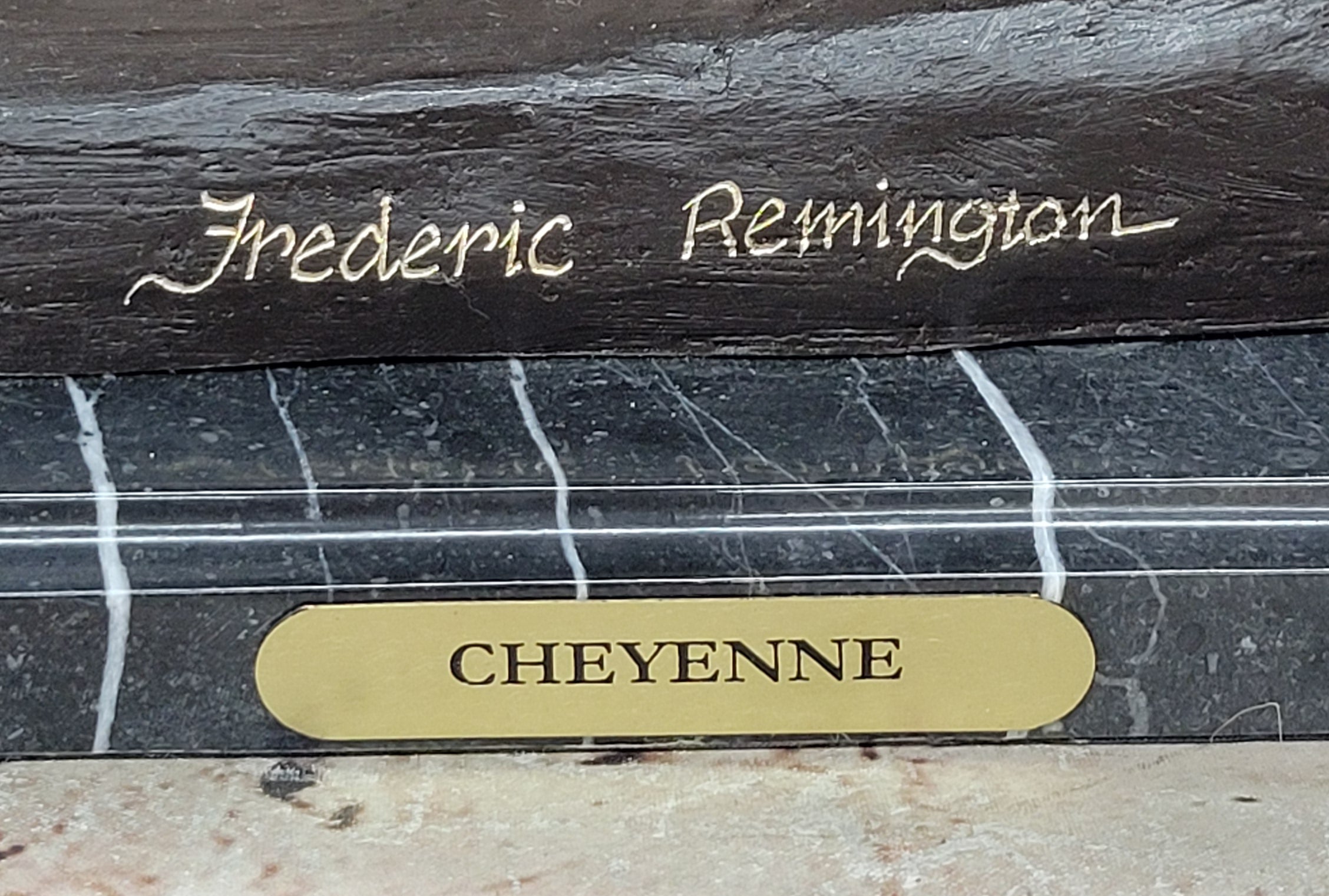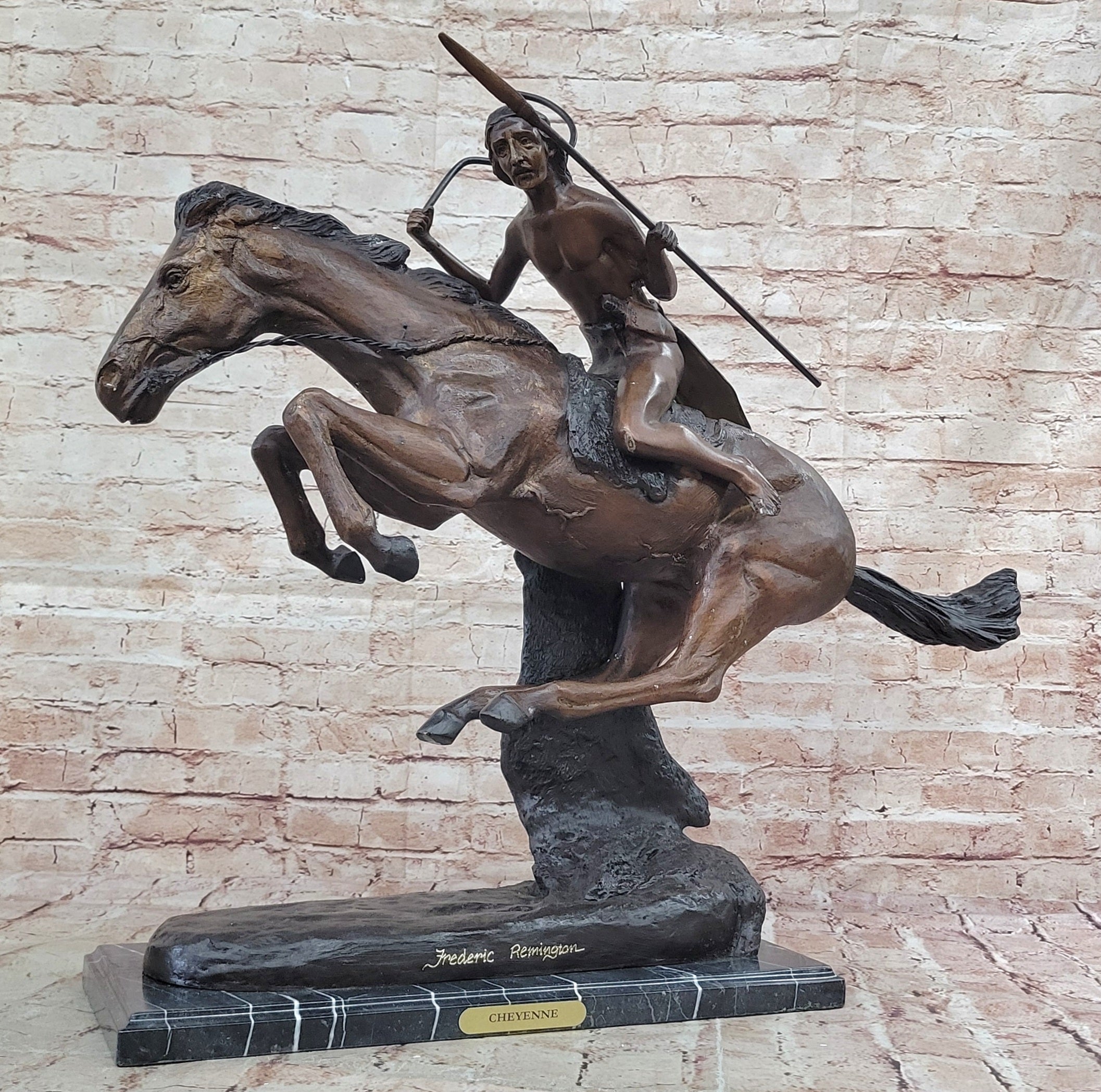 Crafted with 100% bronze, "Cheyenne" embodies exceptional artistry and durability. The sculpture was meticulously cast using the ancient "Lost Wax Method," ensuring a stunning level of authenticity. Mounted on a sleek black marble base, this artwork stands as a testament to the artist's skill and vision. As a tribute to Remington, it bears the signature of the master artist, adding prestige to any art collection.