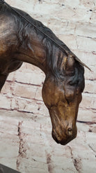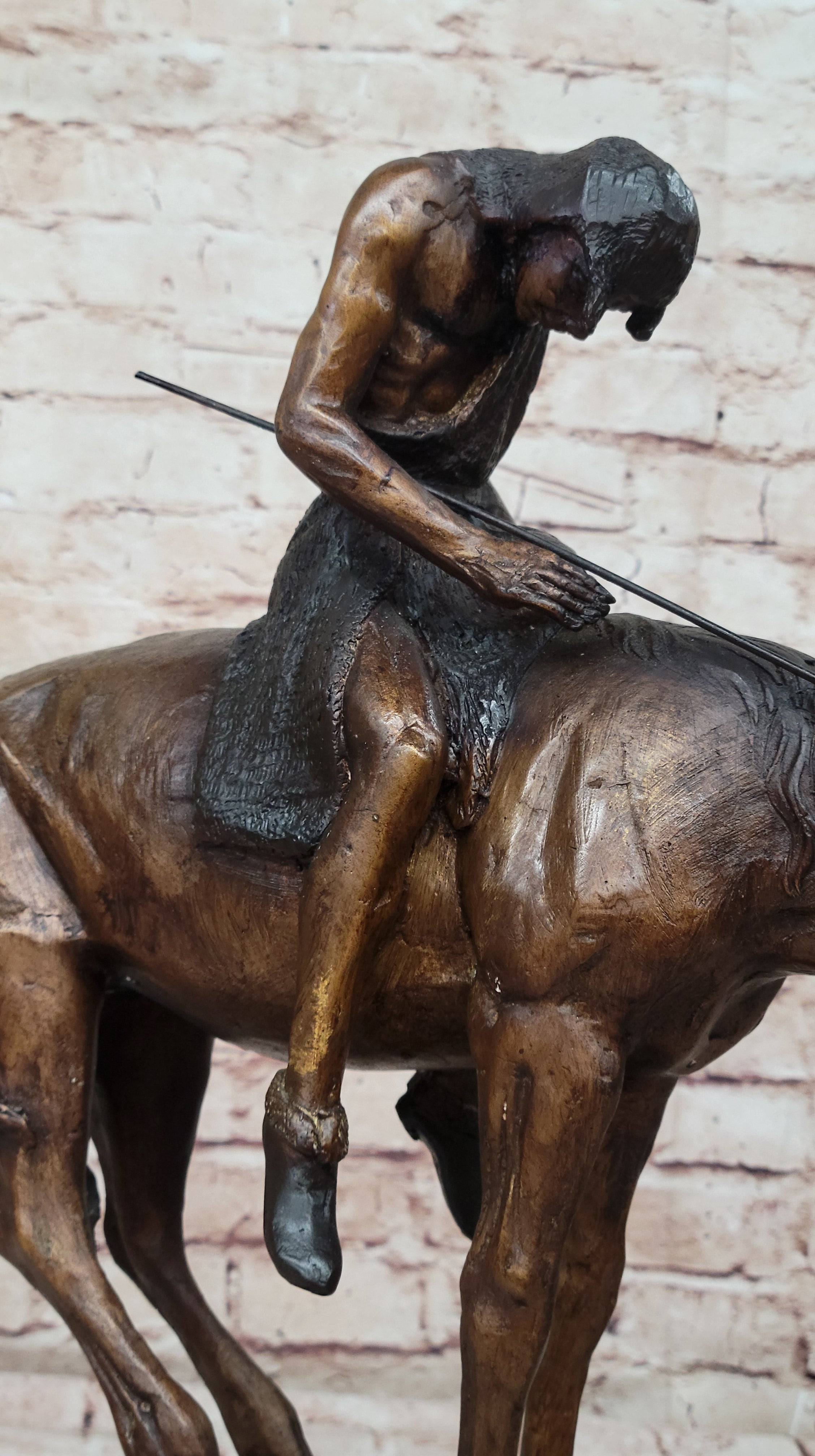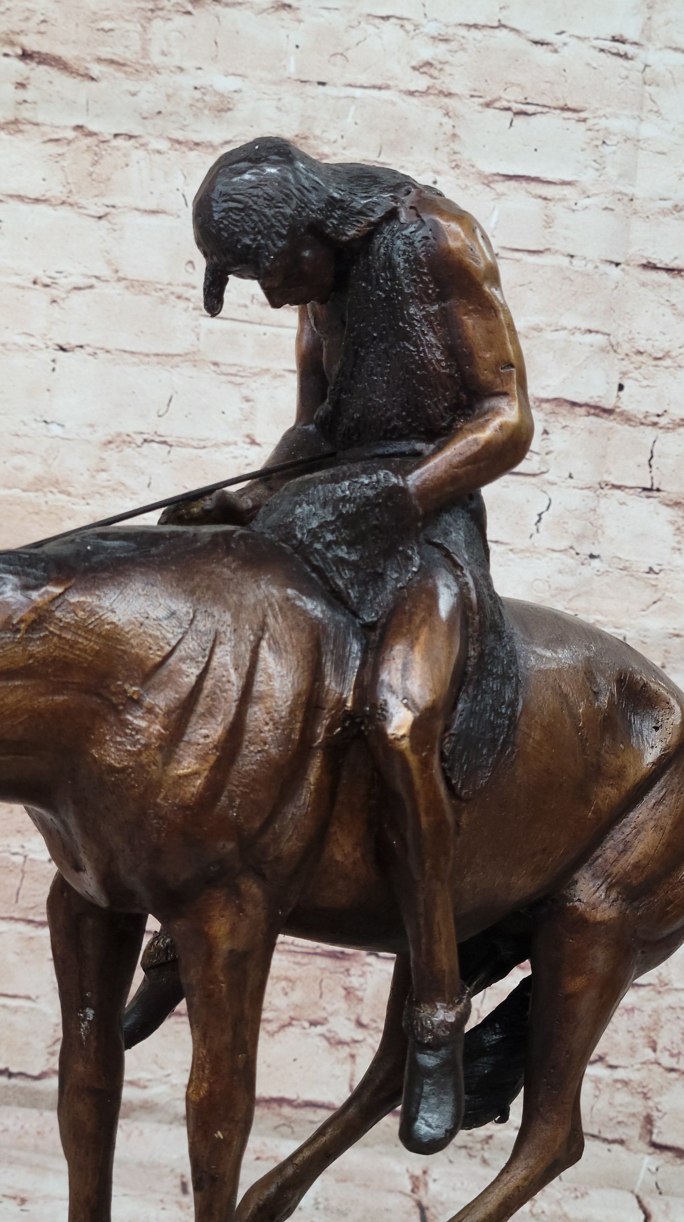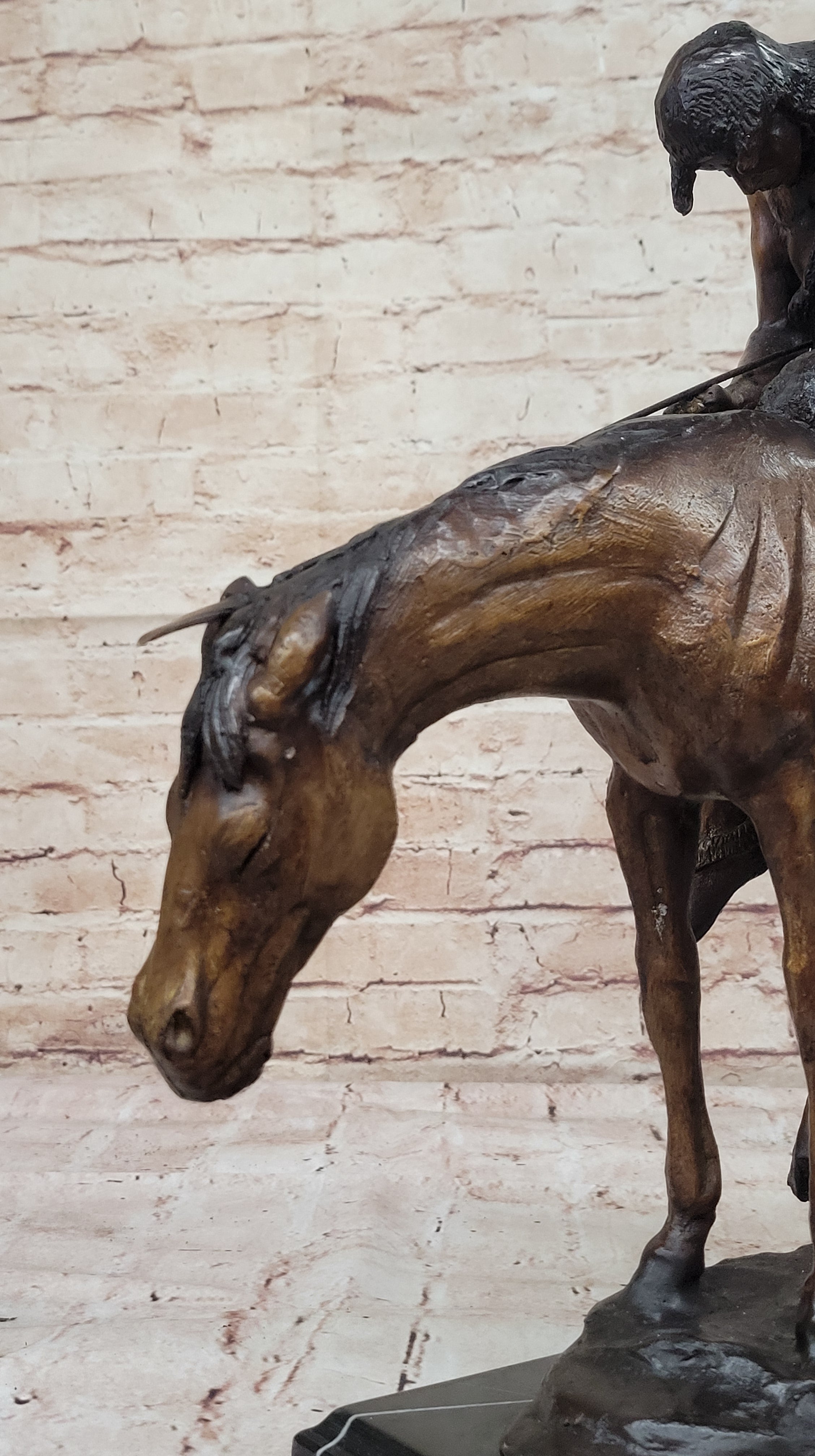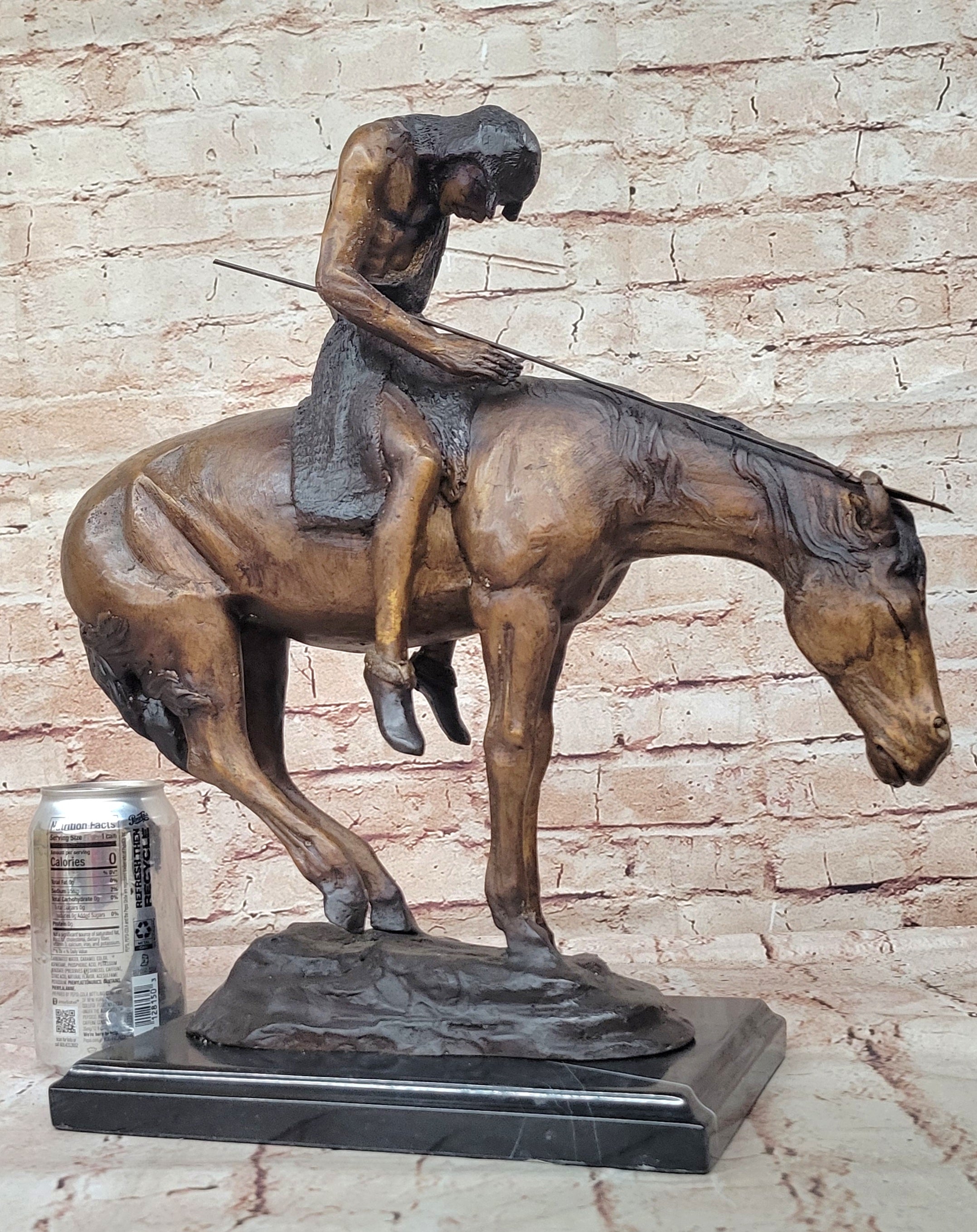 The stallion he rides is an awe-inspiring embodiment of beauty and strength, captivating in its presence. As the horse gracefully carries its owner, it becomes a comforting companion, guiding him into a restful sleep. This handmade bronze sculpture is a testament to meticulous craftsmanship, employing the time-honored technique of lost-wax casting to ensure the finest detail. Its rich brown patina finish not only enhances its aesthetic appeal but also serves as a protective element for long-term preservation.