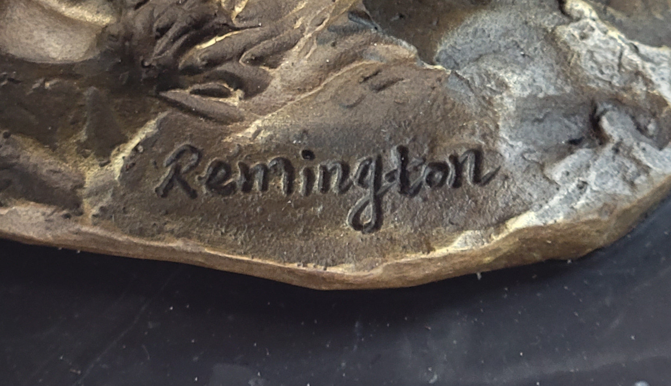 Molded using the revered lost-wax method of casting, this sculpture stands as a testament to the artist's skill and dedication. A rich brown patina enhances its allure, adding depth and character to the artwork. Resting upon a sleek black marble base, it emanates a sense of strength and sophistication. The sculpture is proudly signed by the acclaimed artist Remington, affirming its quality and artistic merit.