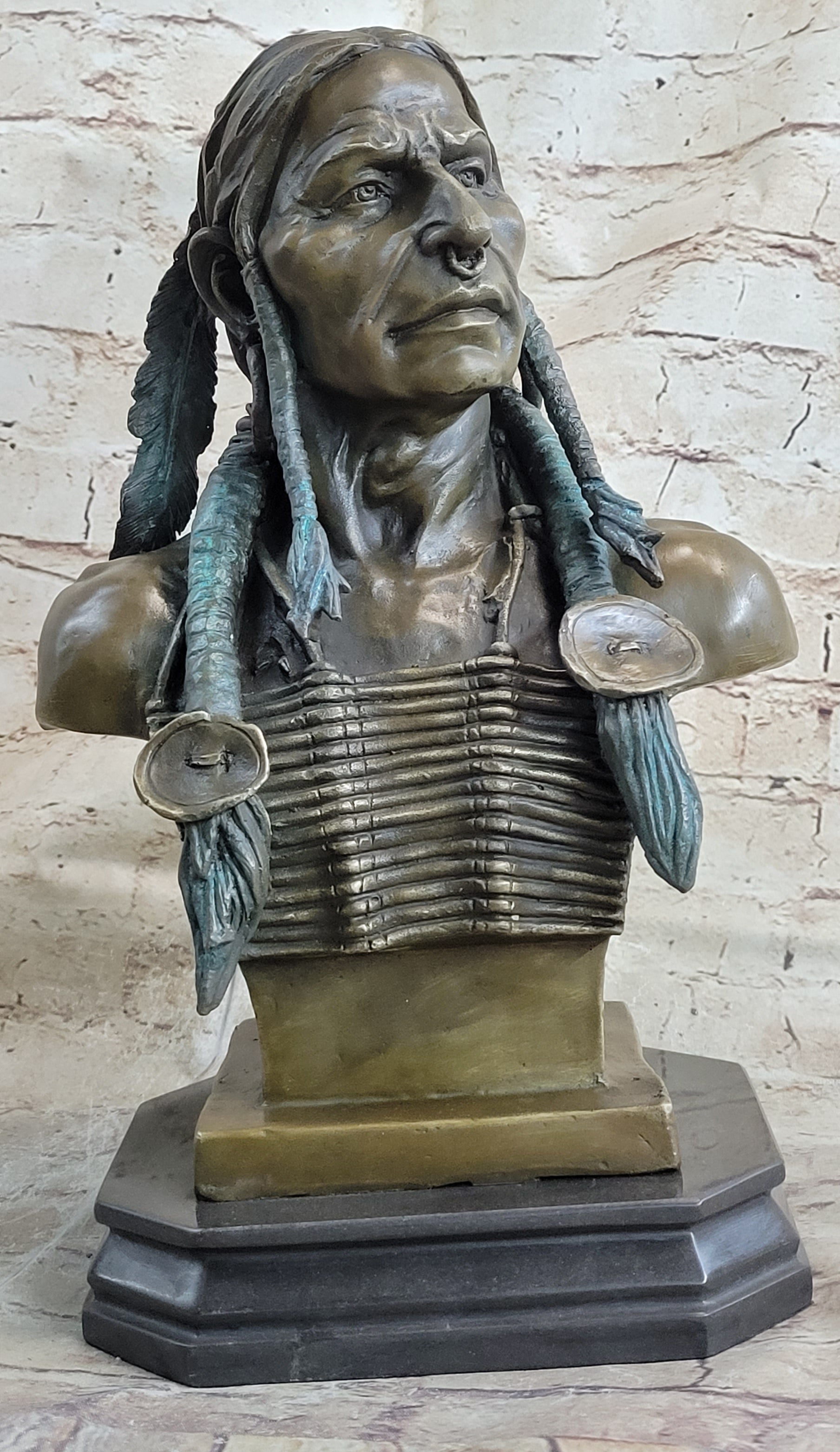 Step into the rich history and powerful presence of a Native American warrior chief with this remarkable bronze bust. The chief's gaze is intense, reflecting his unwavering courage and spiritual strength. His hair, adorned with braids wrapped in deer hide strips and finished in a striking turquoise patina, adds a touch of tradition and symbolism to the sculpture. A single long feather gracefully extends from the back of his hair, further enhancing his regal aura.