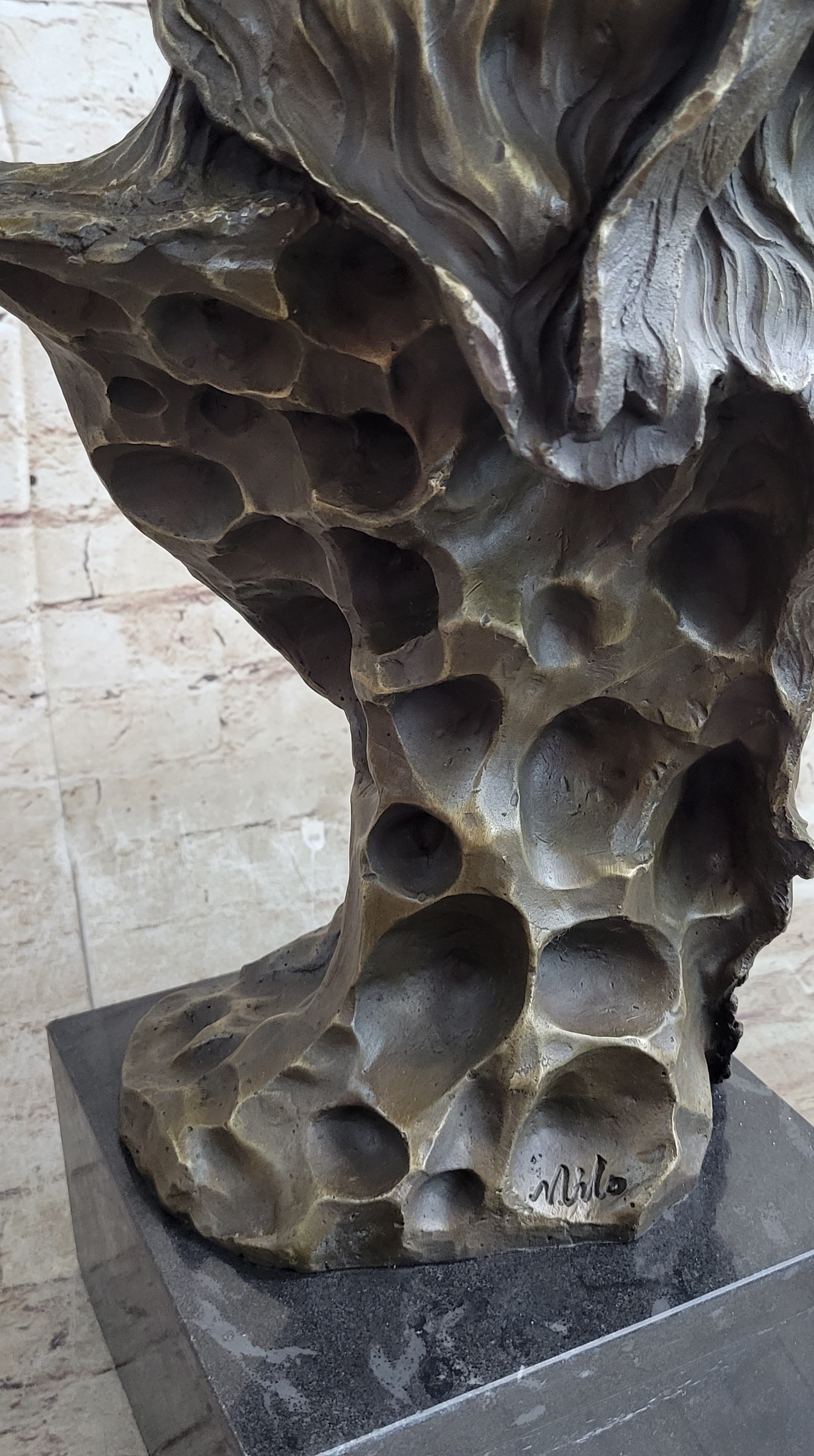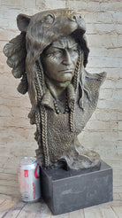 Crafted with meticulous attention to detail, this medium-sized sculpture was created using the time-honored lost wax method, a testament to the artisanal skill of the sculptor Milo. The piece stands proudly on a black marble base, underscoring the enduring value and significance of Native American traditions. Displayed in a home or gallery, this sculpture serves as a powerful reminder of the rich cultural heritage and the indomitable spirit of indigenous peoples, celebrating their acts of valor and the enduring symbolism of the wolf headdress.Bronze Dimensions with Marble Base: Height 22" X Width 12"