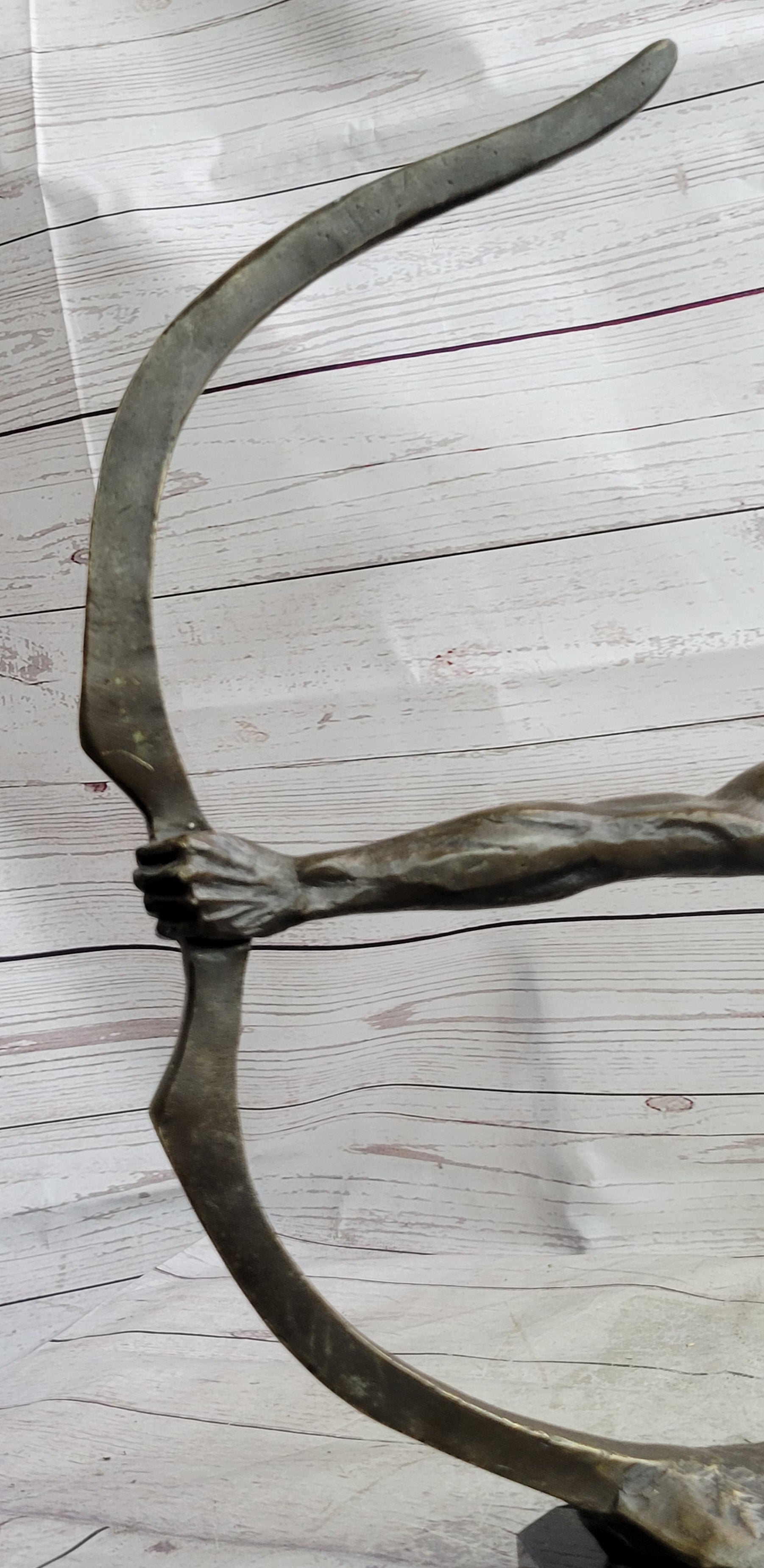 From the right side, the Native American warrior's profile stands in sharp relief, his focus unyielding as he tracks the trajectory of an arrow he has just released. His stance exudes a combination of concentration and mastery, while his outstretched arm anchors the sculpture's dynamism. The artist's meticulous craftsmanship is evident in the lifelike representation of every sinew and detail, allowing us to feel the tension of the warrior's bowstring and the weight of his purpose.