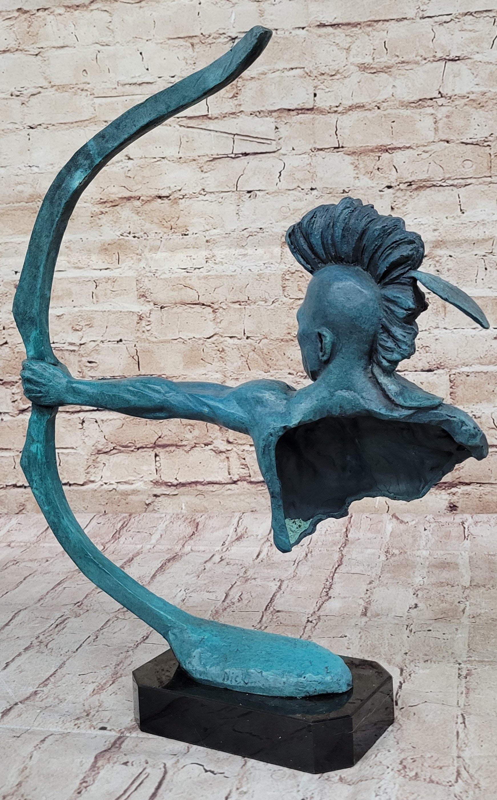 In summary, this striking bronze sculpture presents a Native American warrior frozen in the profound moment of releasing an arrow. Crafted with meticulous detail using the lost-wax casting method, it captures the essence of the warrior's spirit. With its green patina finish, black marble base, and the artist's signature, this sculpture stands as a testament to the enduring beauty and significance of Native American culture. A truly exquisite representation, it is sure to evoke admiration and spark a sense of reverence in all who behold it.Bronze Dimensions with Marble Base: Height 17" X Width 13"