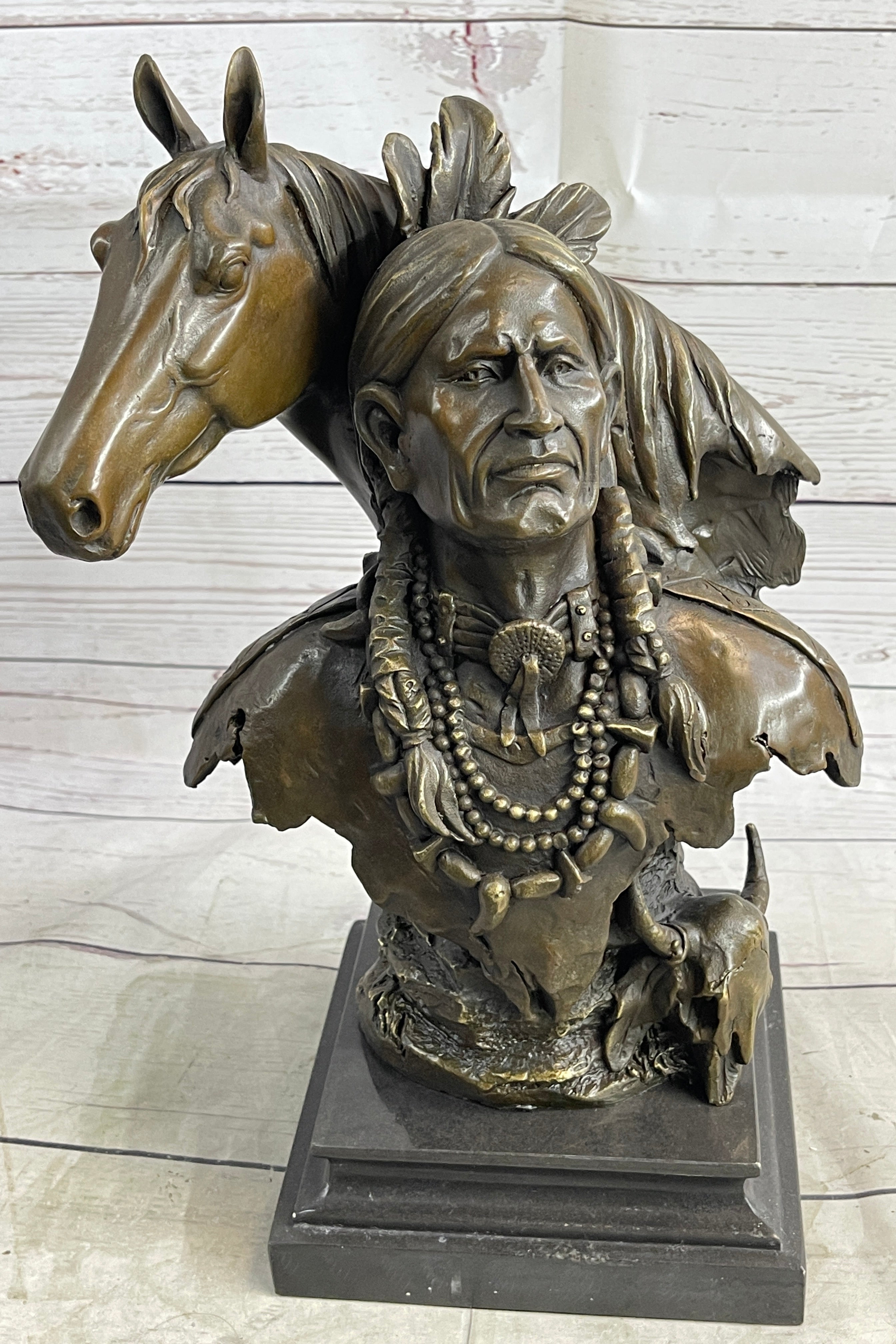Native American Man & Horse Bronze Bust Statue Sculpture Western Art 14" x 10"