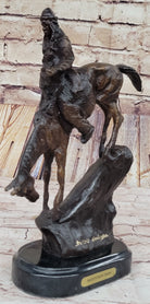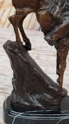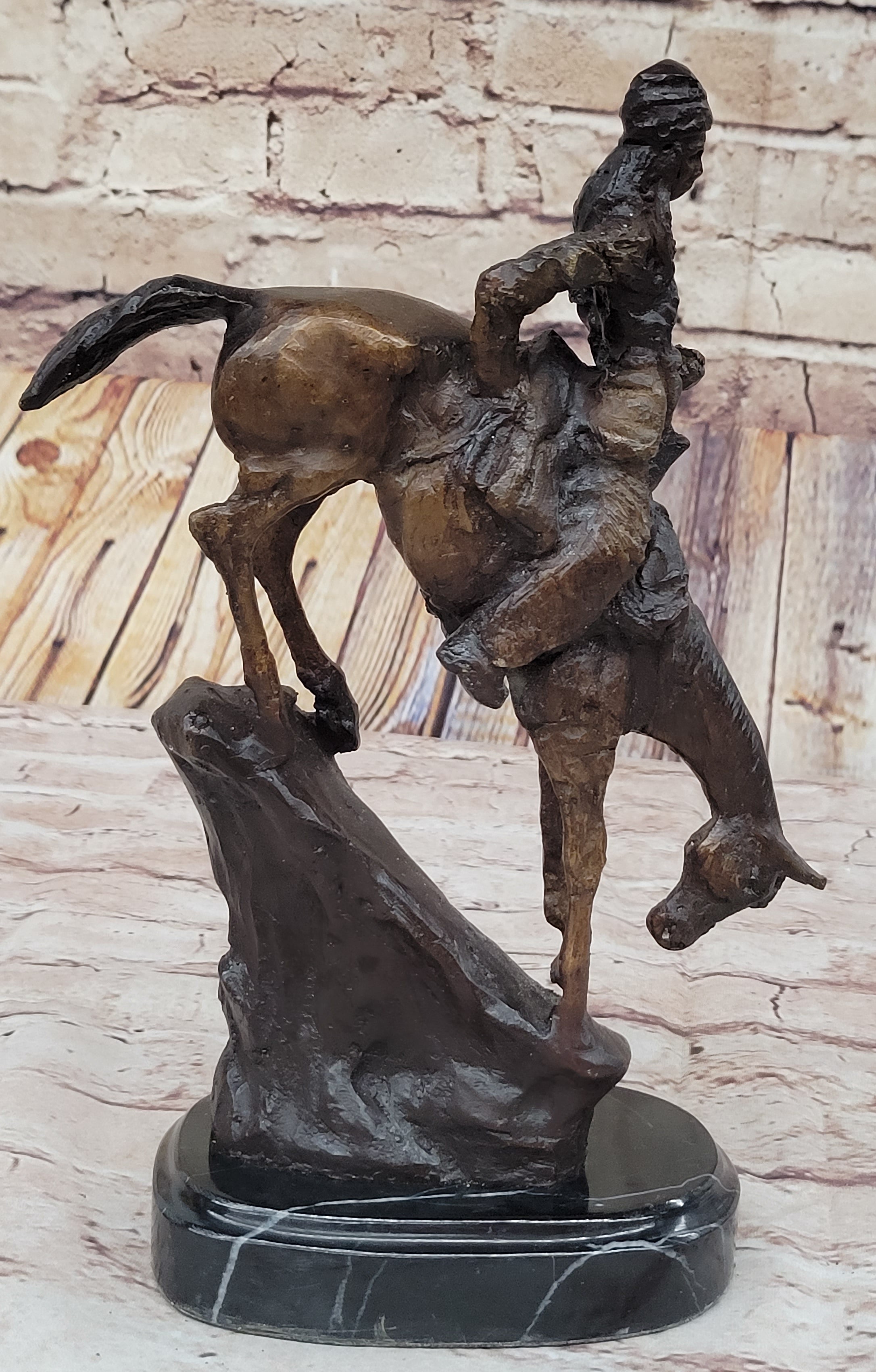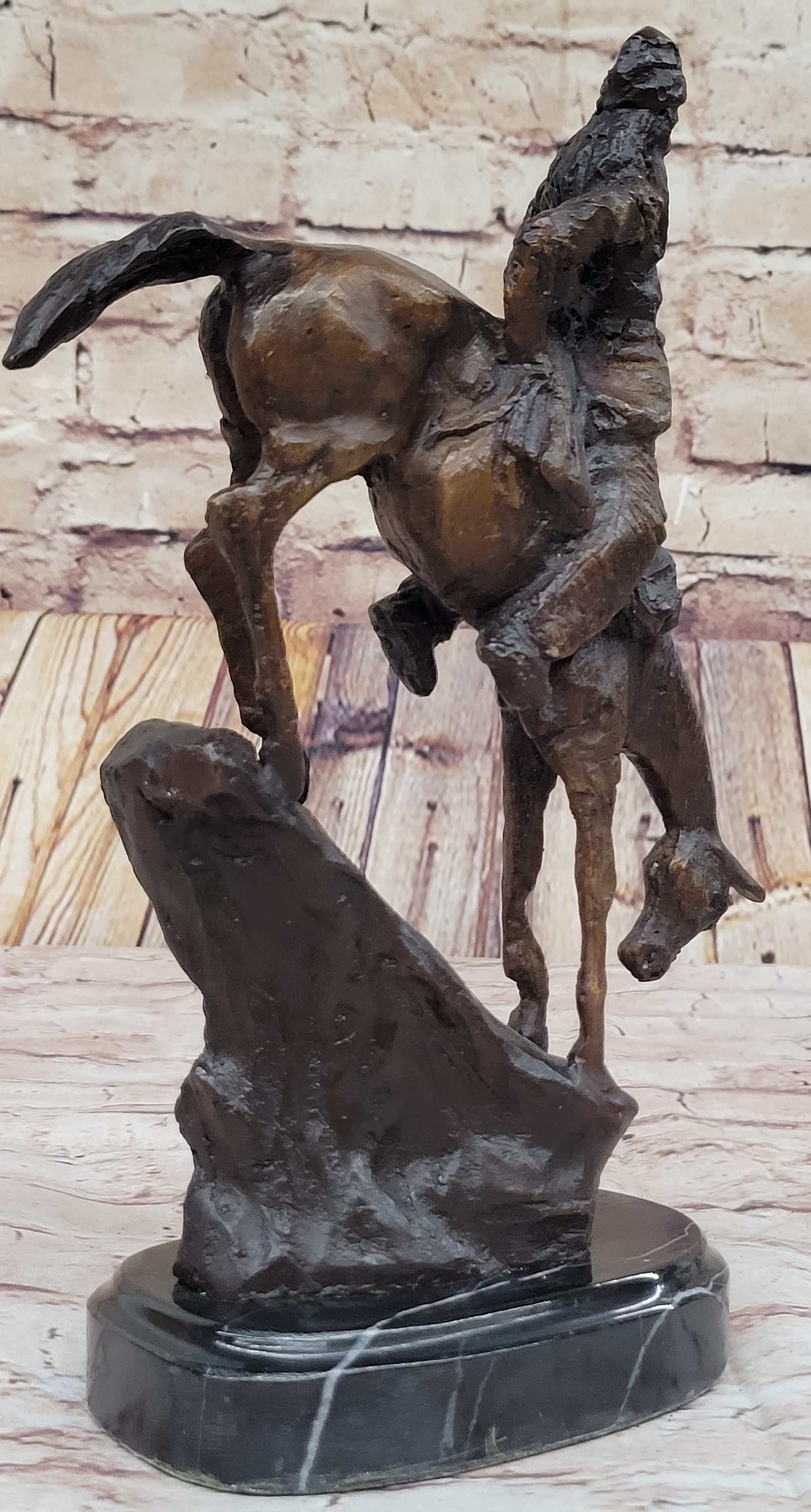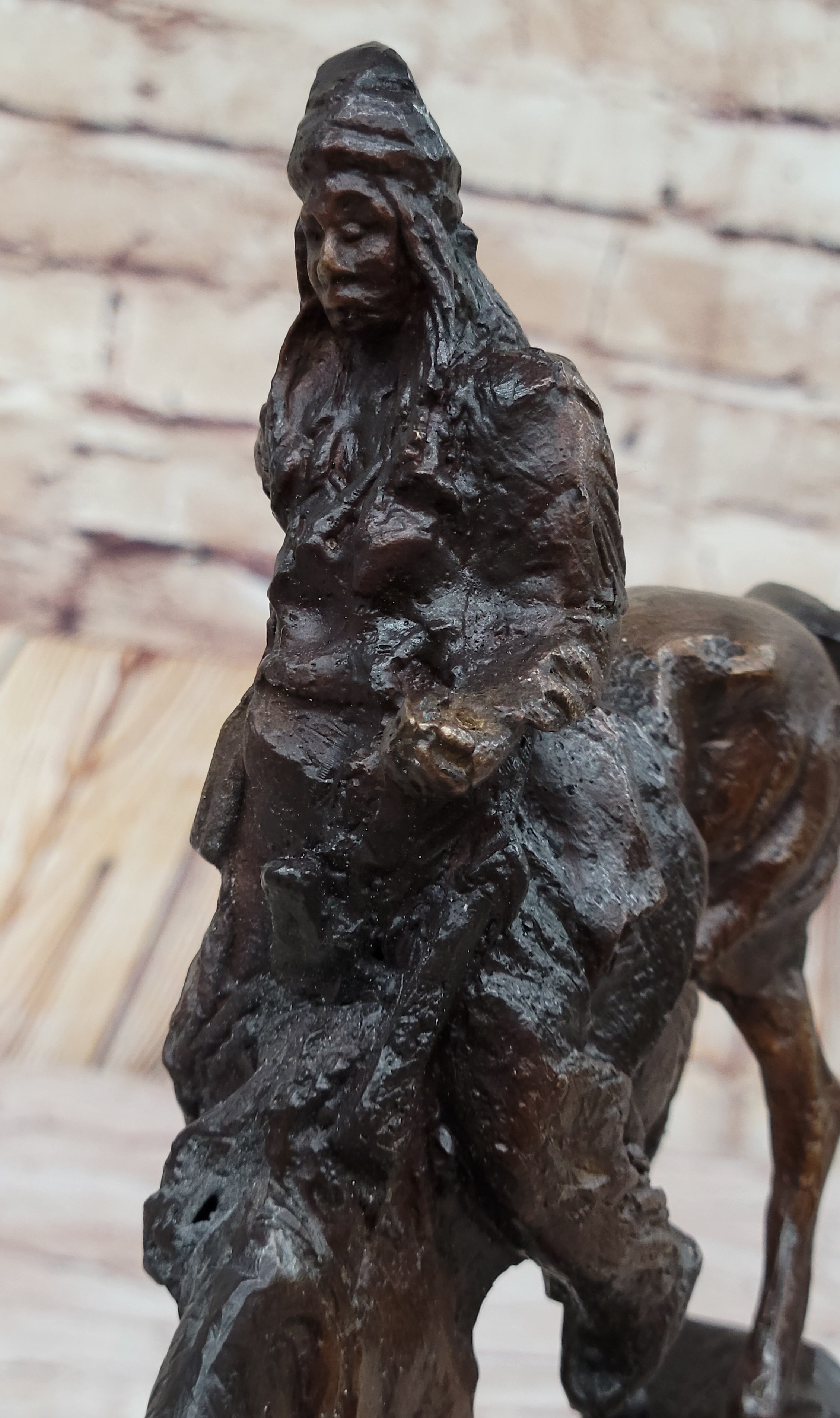 The Mountain Man bronze sculpture embodies the spirit of a proud and courageous Native American warrior, diligently guarding his tribe and vast terrain with unwavering determination. Meticulous craftsmanship brings to life every element of his traditional apparel, including the characteristic breech cloth and resilient moccasins, portraying the depth of his cultural roots. Positioned on his horse, his gaze rises to the heavens, a solitary feather held aloft, symbolizing reverence and resoluteness. This remarkable sculpture, known as Mountain Man, pays homage to the enduring heritage of the Native American people. Enhanced with a captivating two-toned brown patina, the sculpture was meticulously fashioned using the esteemed "Lost Wax Method" and stands securely on a robust marble base, bearing the distinguished signature of celebrated artist Frederic Remington.Bronze Dimensions with Marble Base: Height 11" x Width 9"