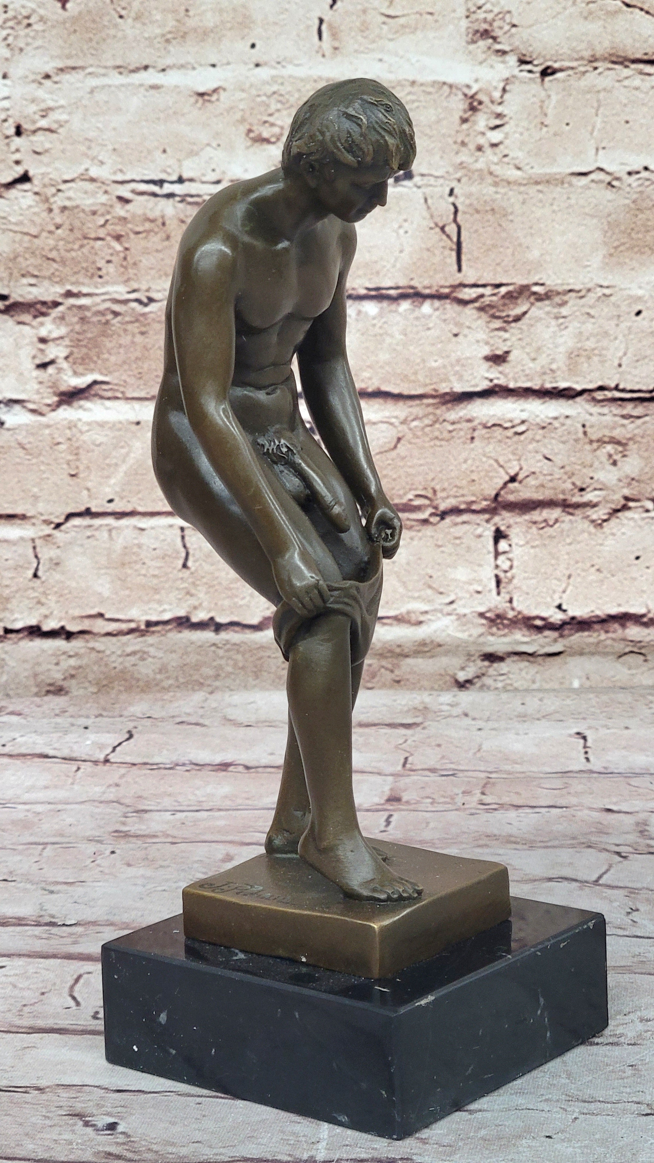 In this bold and expressive bronze sculpture, the artist captures the essence of a striking and athletic male figure, reminiscent of an underwear model. The sculpture portrays the nude man in a moment of transition, emerging from a shower with a slouched posture. His hands gracefully grasp the sides of the underwear, slowly raising them up in a gesture that exudes confidence and sensuality. The level of detail in the sculpture emphasizes the masculine and muscular contours of the figure, making it a symbol of strength and tranquility.