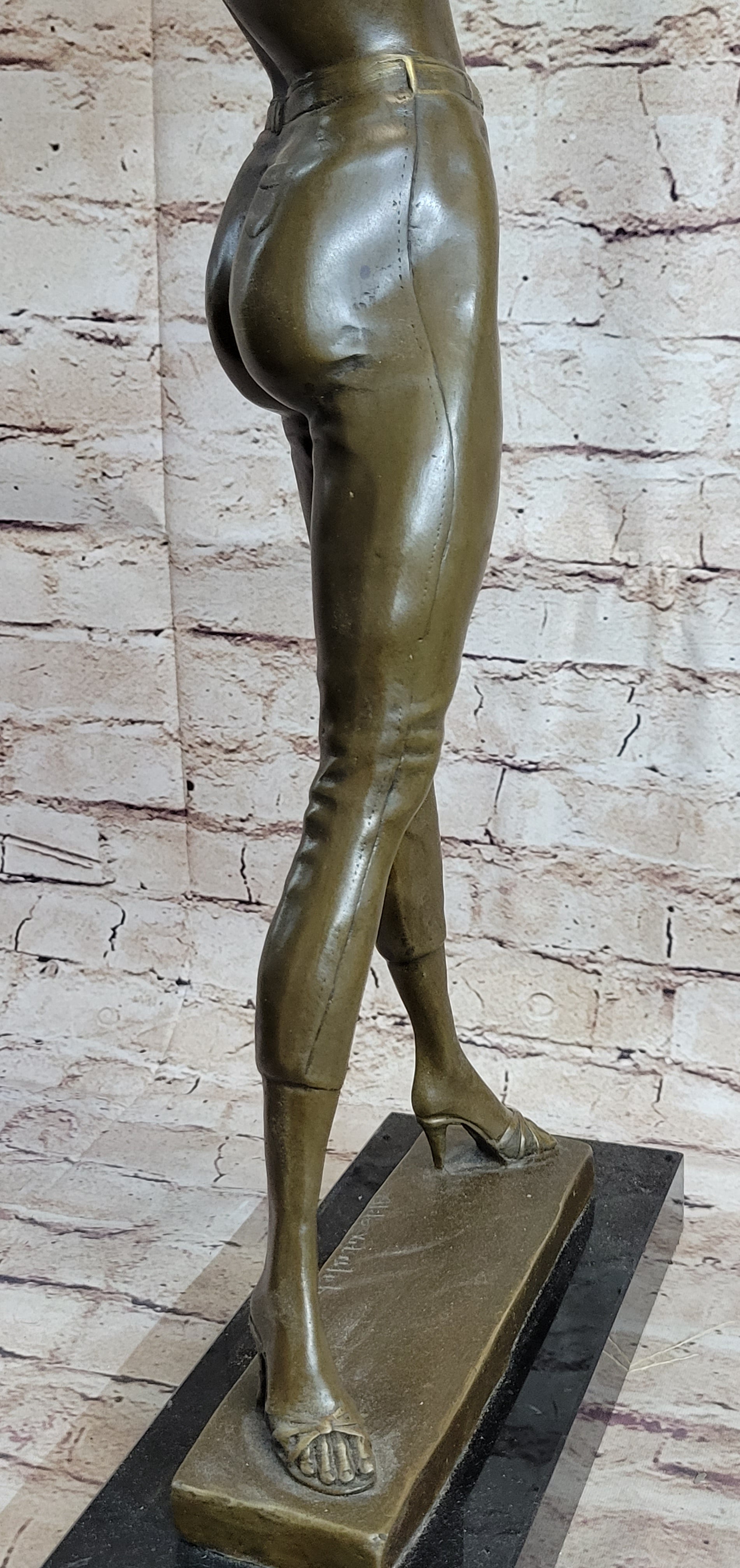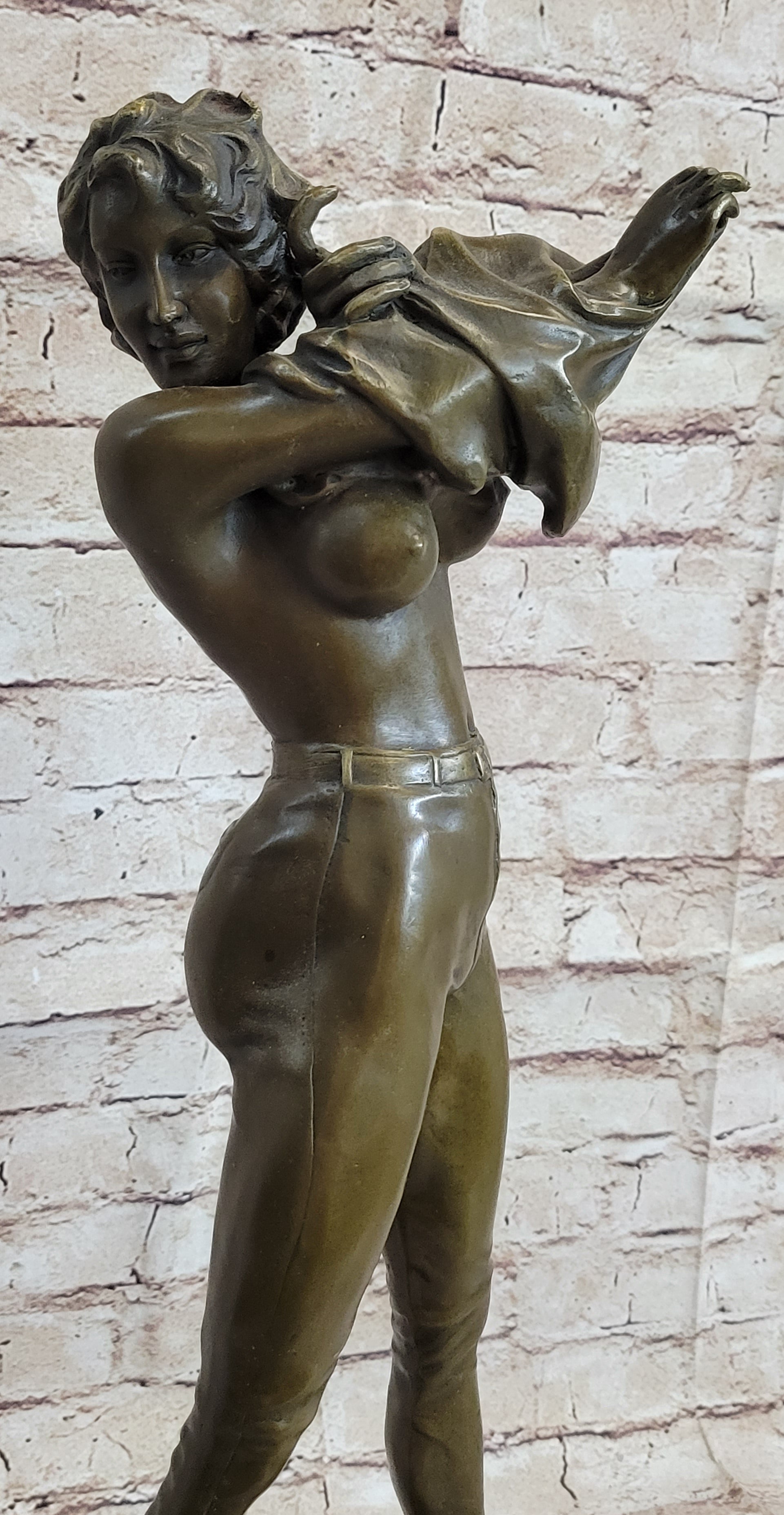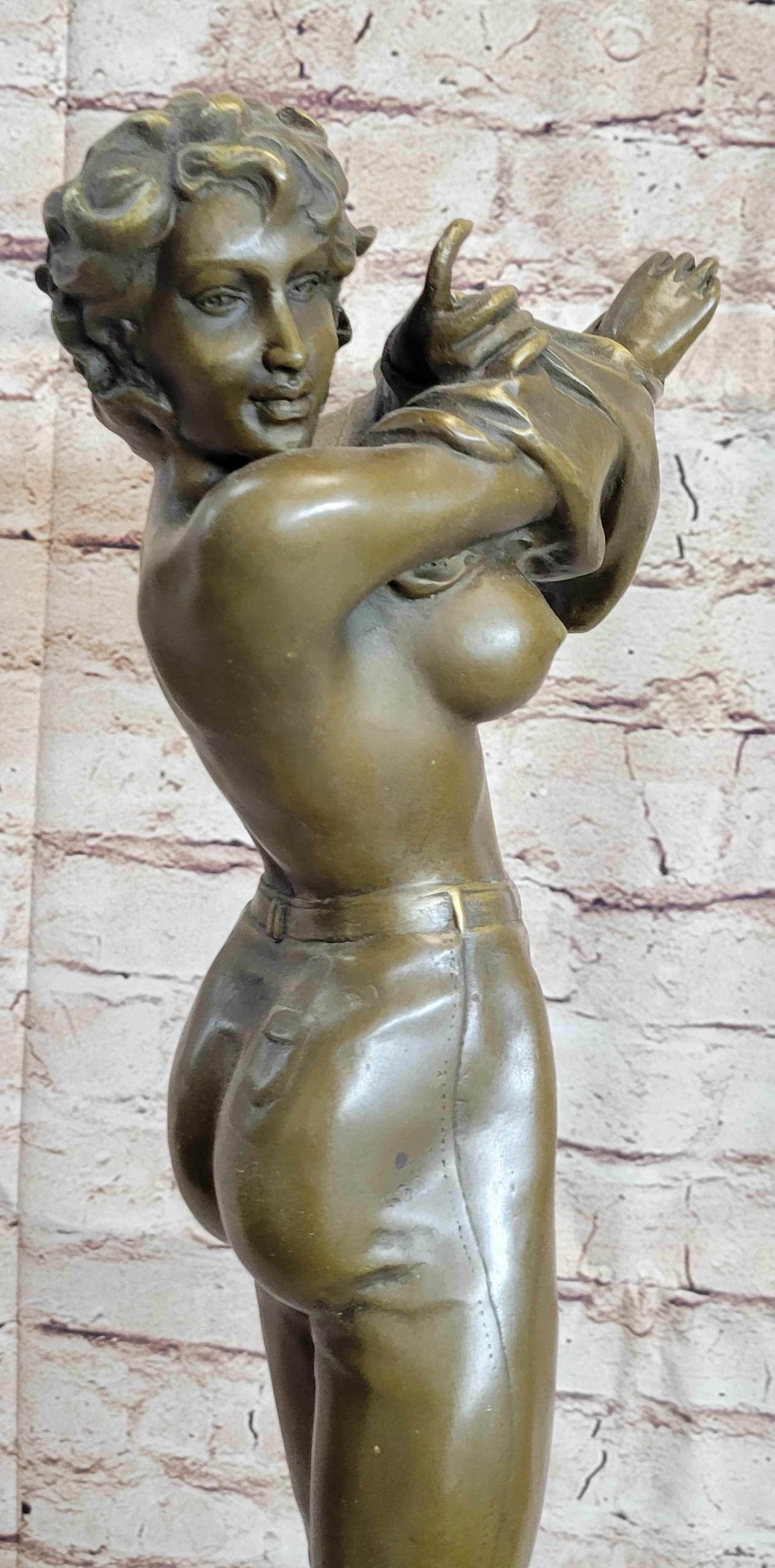 This extraordinary bronze sculpture captures the essence of a woman in a bold and confident act of self-expression. Standing at an impressive size, the sculpture showcases a woman gracefully removing her top while wearing pants, exuding a sense of liberation and empowerment. The meticulous details bring the sculpture to life, from the folds in her clothing to the natural curves of her body. Crafted by the renowned artist Aldo Vitaleh using the lost wax method, this sculpture is a true masterpiece of artistry and craftsmanship. The sculpture is mounted on a sturdy marble base, providing a solid foundation that complements the artwork's beauty and elegance. The rich brown patina finish enhances the depth and texture of the bronze, adding a touch of warmth and sophistication. With its larger size and captivating subject matter, this sculpture becomes a focal point in any space, whether it's a home, office, or gallery. The artist's signature, Aldo Vitaleh, is proudly displayed on the sculpture, symbolizing its authenticity and value. This exquisite bronze sculpture is a testament to the artist's skill and creativity, capturing a moment of vulnerability and self-assurance. It serves as a reminder of the beauty and strength found in embracing one's true self. Whether you are an art enthusiast or a collector looking for a statement piece, this extraordinary sculpture by Aldo Vitaleh is sure to leave a lasting impression and become a cherished addition to your collection.