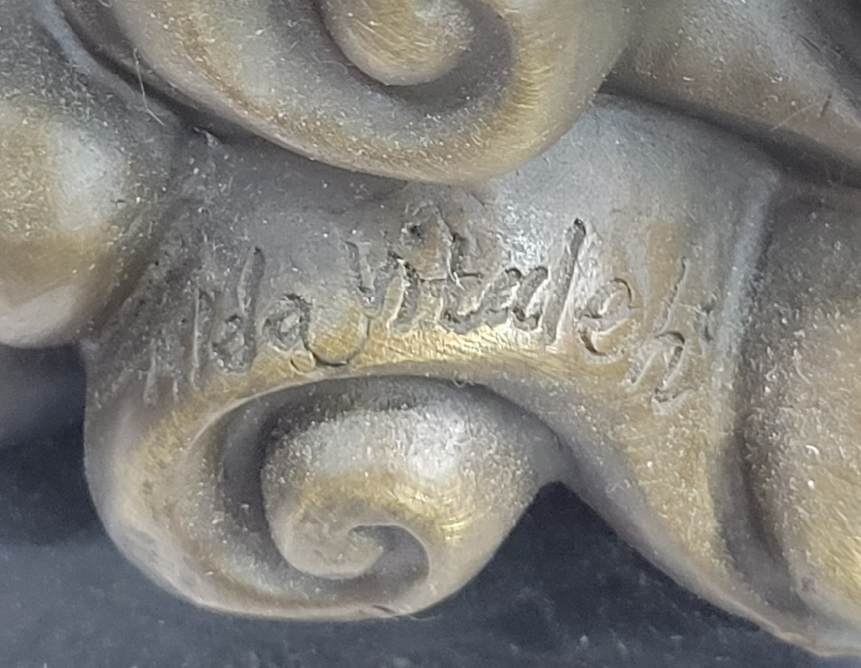 Mounted upon a sleek black marble base, the sculpture is not only a testament to artistic skill but also a visually striking addition to any space. The signature of the artist, Aldo Vitaleh, further enhances the piece's authenticity and value. This bronze sculpture serves as a captivating representation of celestial beauty and the intricate interplay between mythology, victory, and the divine.Bronze Dimensions with Marble Base: Height 27.5" X Width 22"