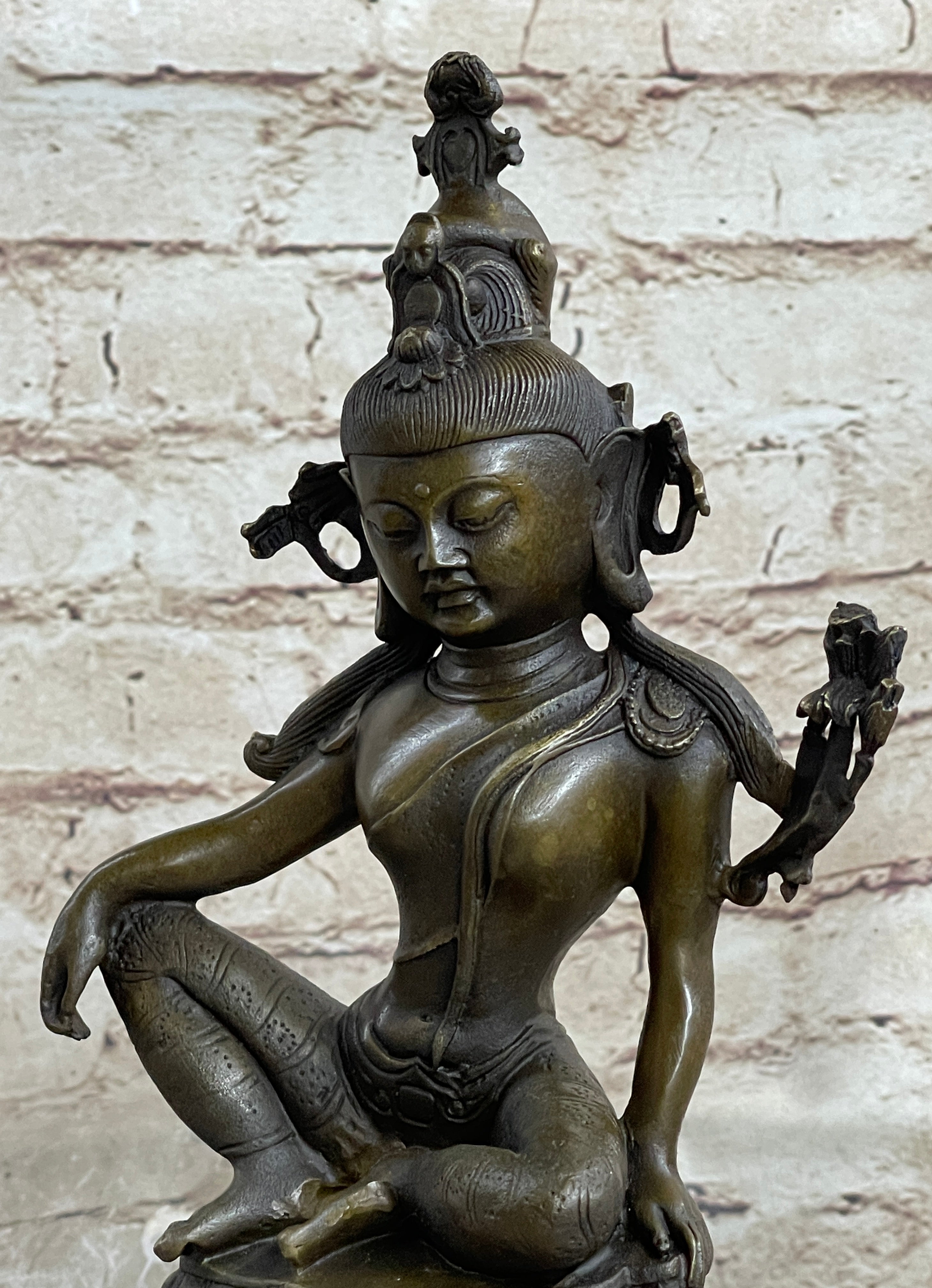 Crafted with meticulous artistry, this beautiful bronze sculpture is a testament to the skilled craftsmanship achieved through the intricate "Lost Wax Method," exemplifying the artist's dedication to preserving the essence of Kuan Yin's grace and compassion. Enhanced by a lustrous brown patina, the sculpture exudes a timeless allure, while its sturdy marble base provides a fitting foundation for the divine representation. Fashioned entirely from 100% bronze and meticulously handcrafted, this sculpture reflects the artist Zhang's unwavering commitment to excellence and serves as a testament to the enduring legacy of the revered Goddess of Compassion.