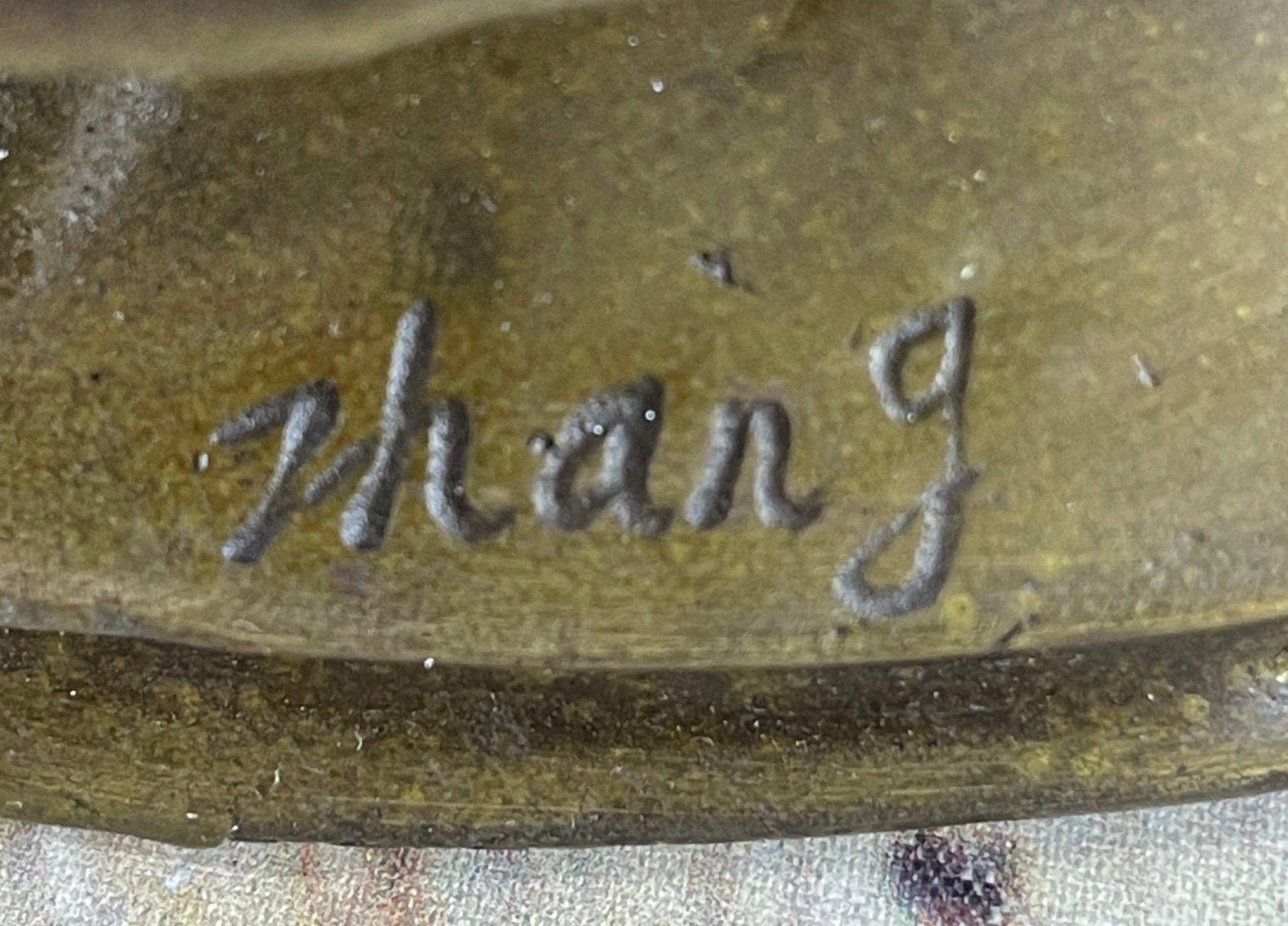 Signed by the talented artist Zhang, this captivating sculpture stands as a testament to the artist's profound reverence for Kuan Yin's divine presence, encapsulating the essence of her boundless compassion and unwavering spiritual guidance. Its exquisite design and meticulous craftsmanship ensure that it not only serves as a visual marvel but also as a tangible representation of the profound spiritual significance embodied by the revered Goddess of Compassion, making it a cherished addition to any art connoisseur's collection.Bronze Dimensions: Height 12" X Width 6.5"