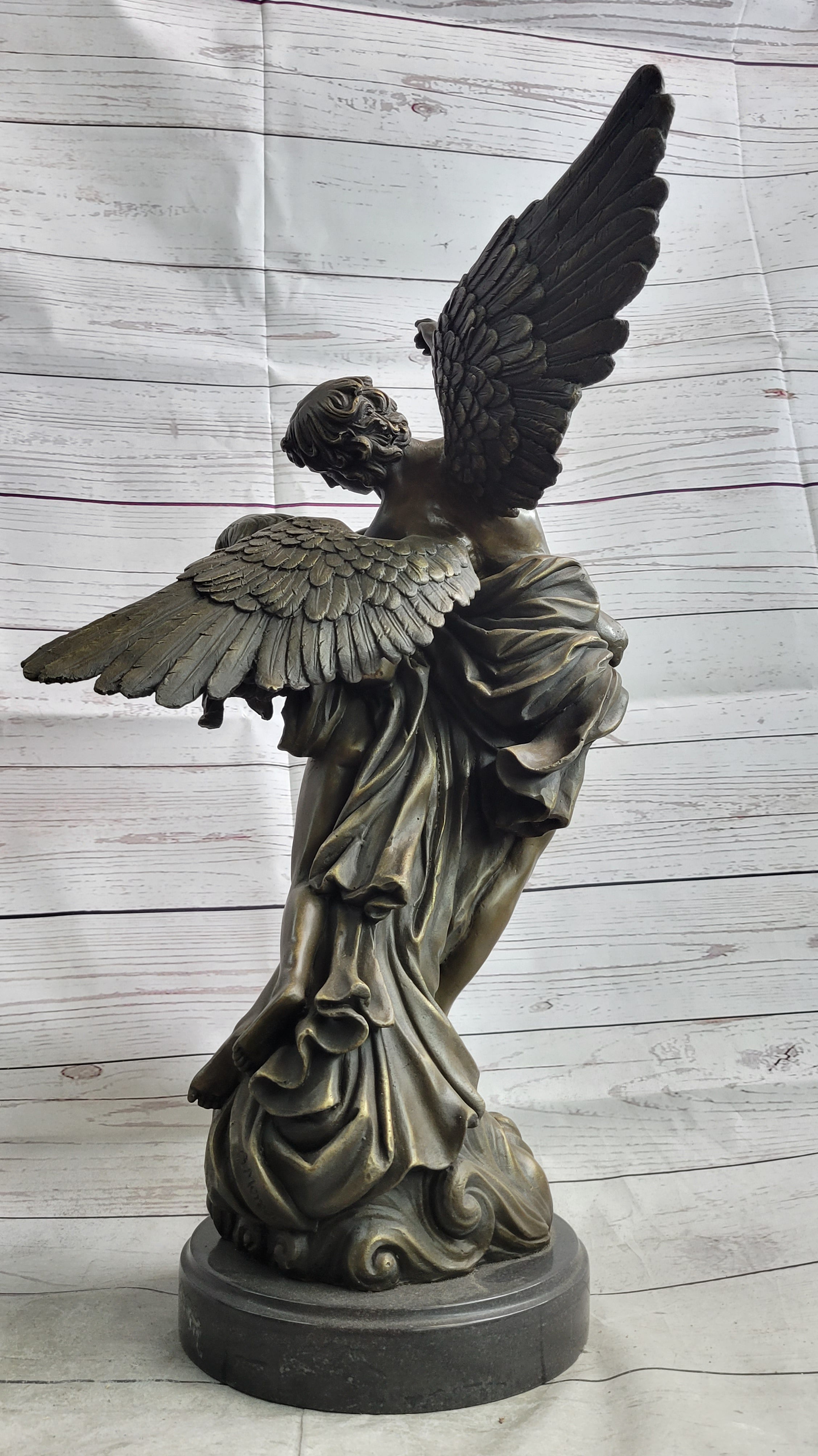 Perfect for adorning any interior space with a touch of classical grandeur and artistic sophistication, this remarkable bronze sculpture of the winged Gloria statue serves as a breathtaking testament to the enduring spirit of victory and conquest, capturing the essence of triumph in its most majestic form. With its exceptional craftsmanship and profound symbolism, this sculpture stands as a stirring embodiment of the enduring legacy of classical art and mythology, offering an unparalleled glimpse into the timeless narratives and profound themes that have shaped the cultural landscape of human history.Bronze Dimensions with Marble Base: Height 23" X Width 14"