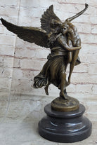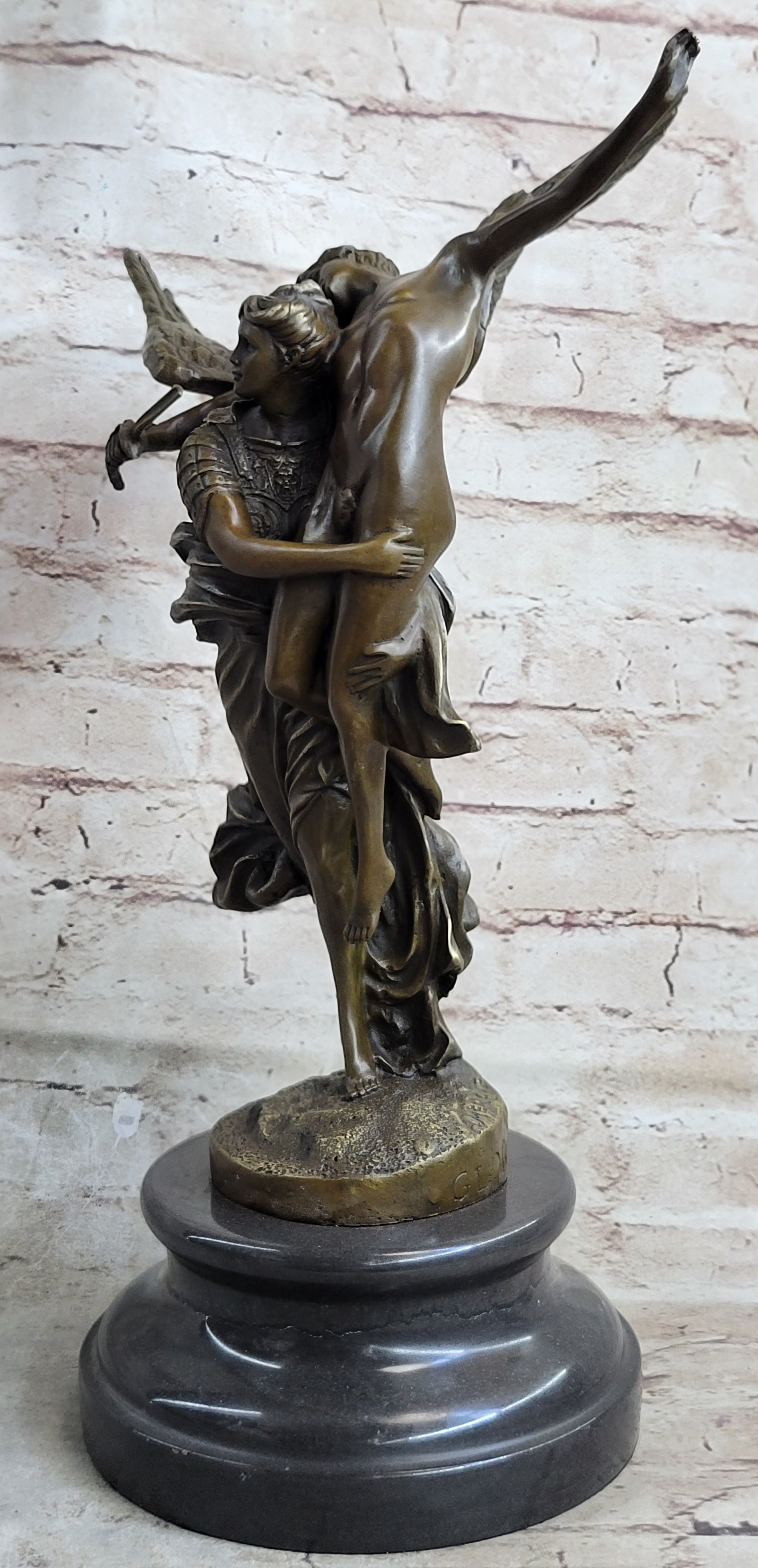 This sculpture transcends its material form to become a powerful narrative of divine guidance and protection. The synergy of the angel's determined posture, the lifeless figure, and the expert craftsmanship makes this artwork a compelling addition to any collection. As an embodiment of compassion and salvation, this bronze sculpture by A. Mercie invites contemplation on the intersection of the divine and mortal realms, celebrating the eternal themes of rescue and protection.Bronze Dimensions with Marble Base: Height 17" X Width 11"