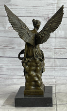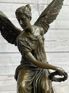 With a contemplative expression, the angel holds a crown of laurel, symbolizing victory and honor. As she prepares to bestow the crown upon the deserving successor of a great battle, her presence exudes a sense of divine authority and benevolence. The sculpture is mounted on a sleek black marble base, further accentuating its elegance and providing a sturdy foundation.