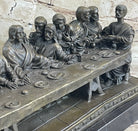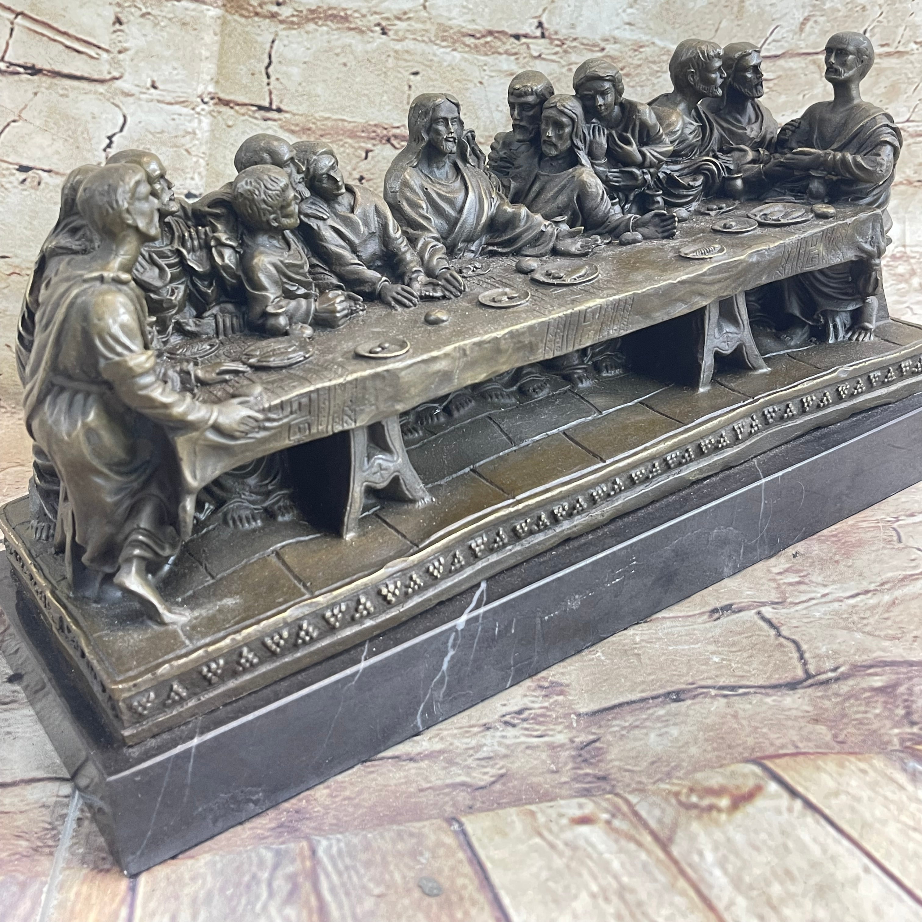 Presenting a remarkable bronze statue that pays homage to the profound significance of the Last Supper in the Christian faith. The Last Supper represents the final meal that Jesus shared with his apostles before his crucifixion, and it has been depicted in numerous paintings throughout history, most notably in Leonardo da Vinci's renowned work. This particular sculpture is a meticulous handmade rendition of that famous masterpiece, skillfully crafted by the esteemed French artist Valli.