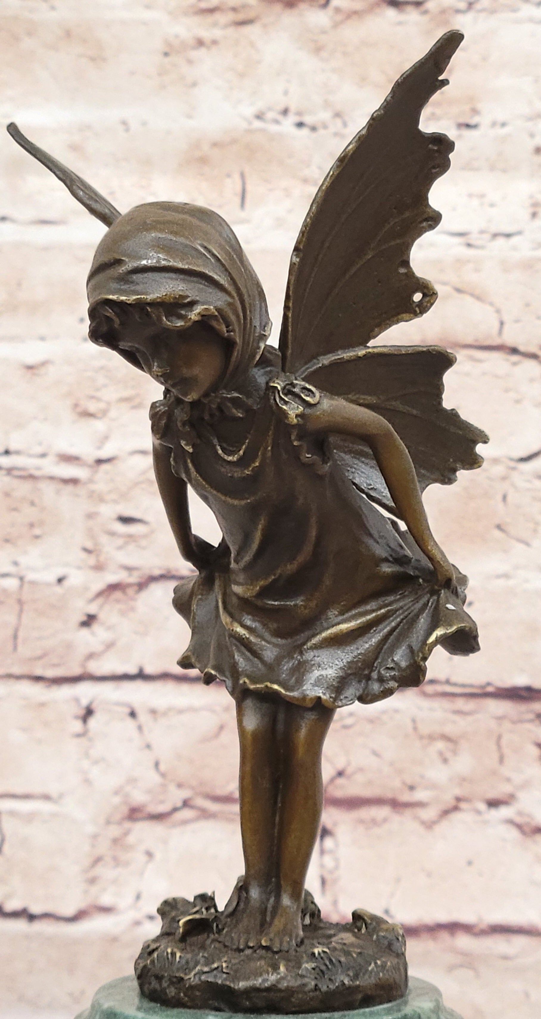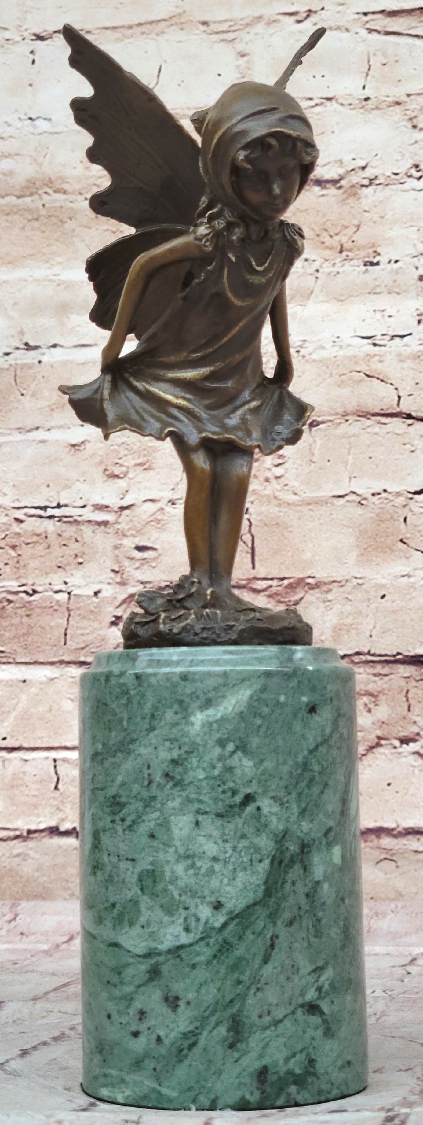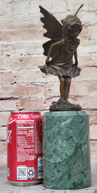 Young Fairy Angel Girl Child Bronze Sculpture Figure on Green Marble Base