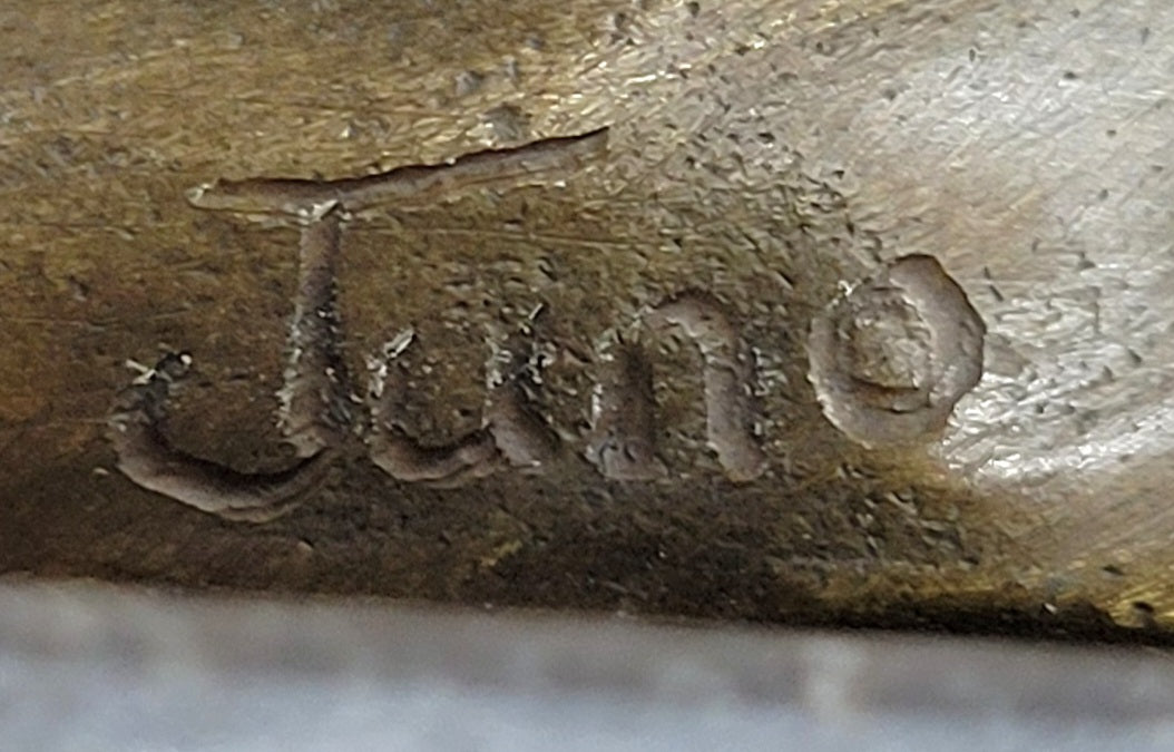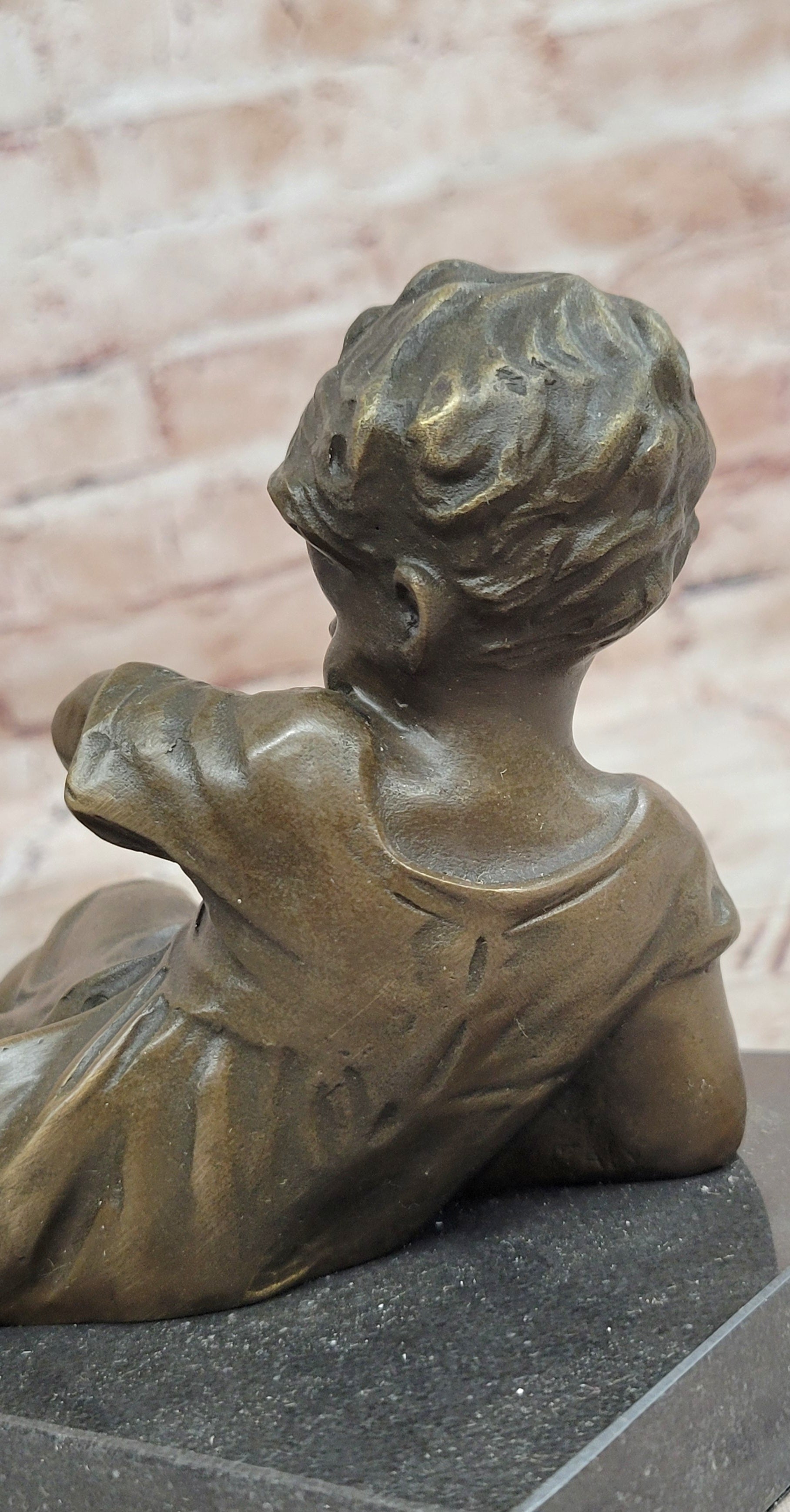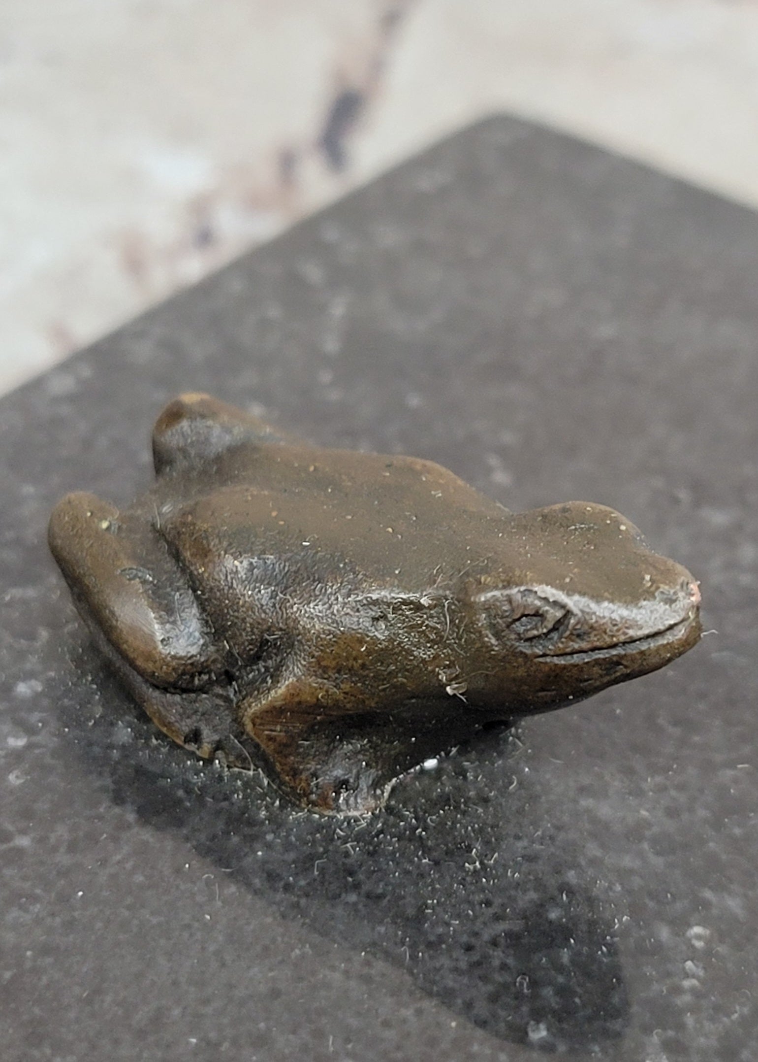 This heavy vintage bronze statue charmingly depicts an adorable young girl who is clearly none too pleased with the frog that has chosen to sit beside her. Her expression perfectly captures a moment of childhood innocence mixed with mild annoyance, bringing a sense of humor and warmth to the scene. The artist’s careful attention to posture, facial expression, and subtle gestures gives the sculpture a lifelike quality that draws the viewer in. Crafted with an intense level of detail, the sculpture showcases the skill and sensitivity of the artist in portraying youthful emotion. From the delicate features of the girl’s face to the textured surface of the frog, every element has been thoughtfully modeled. The rich, dark brown patina enhances the depth of the bronze, highlighting the fine details and adding a timeless, vintage character to the piece. Handmade using the traditional lost wax method, this 100% bronze sculpture is both durable and artistically refined. It is mounted on a polished black marble base, providing stability and an elegant contrast to the warm tones of the bronze. Signed by the Italian artist Juno, this delightful sculpture is a wonderful addition for collectors, lovers of whimsical art, or anyone who appreciates finely crafted bronze works.