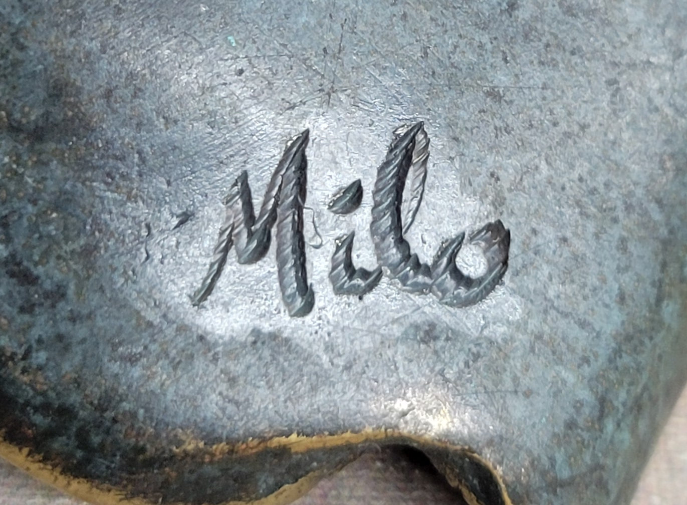 Signed by the renowned Portuguese artist Miguel Fernando Lopez, also known as Milo, this original Vienna bronze sculpture is ideal for collectors and art enthusiasts alike. Perfect for display in a home, office, or curio cabinet, it brings charm, sophistication, and timeless artistic value to any décor.Bronze Dimensions: Height 1.5" X Width 3"