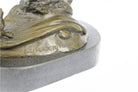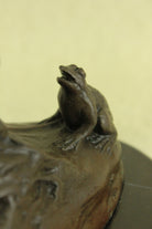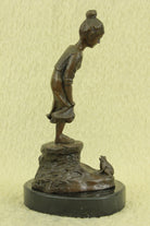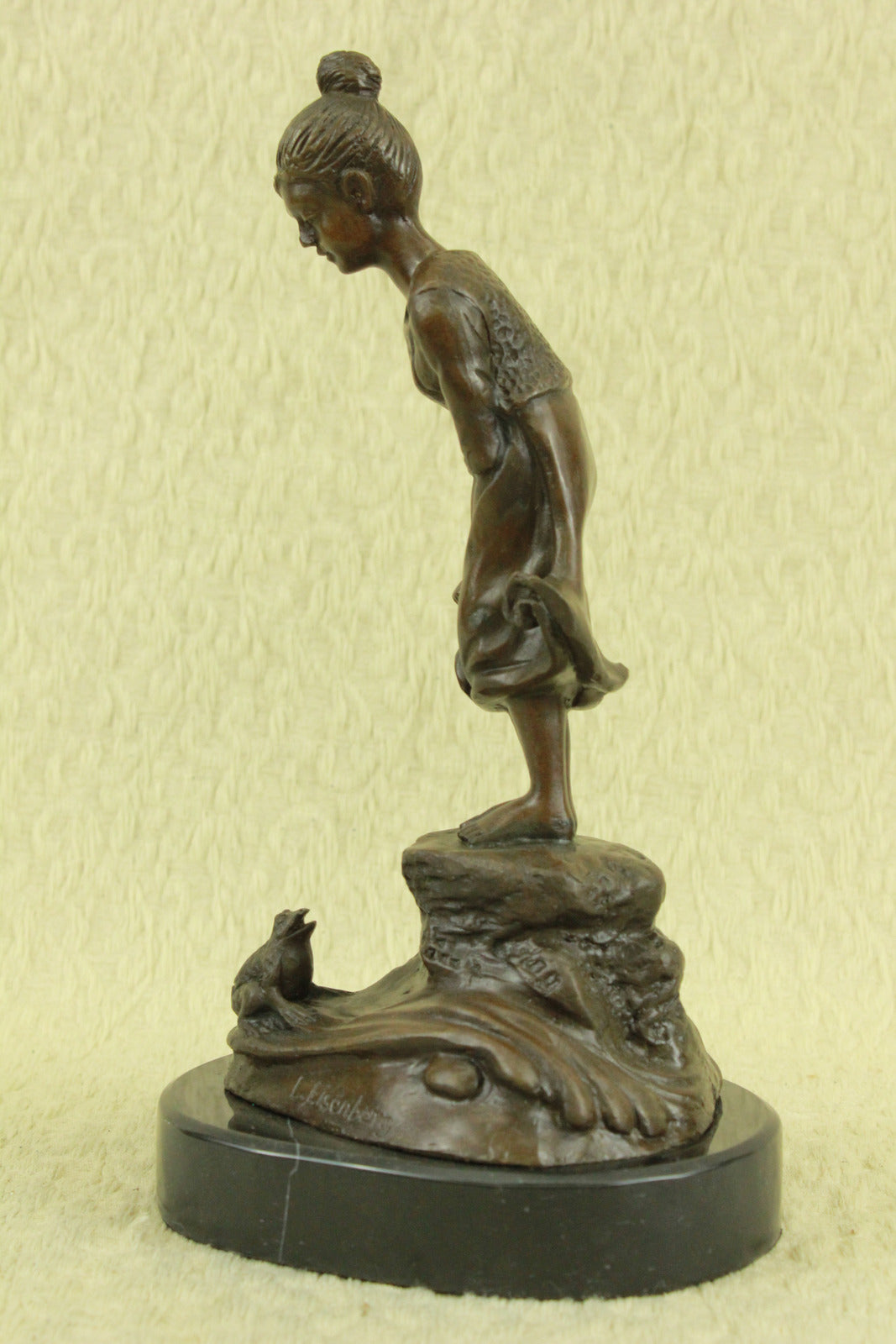 Bronze Sculpture - Standing Girl with Frog - Marble Base - Signed Figurine Decor