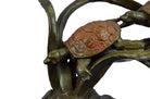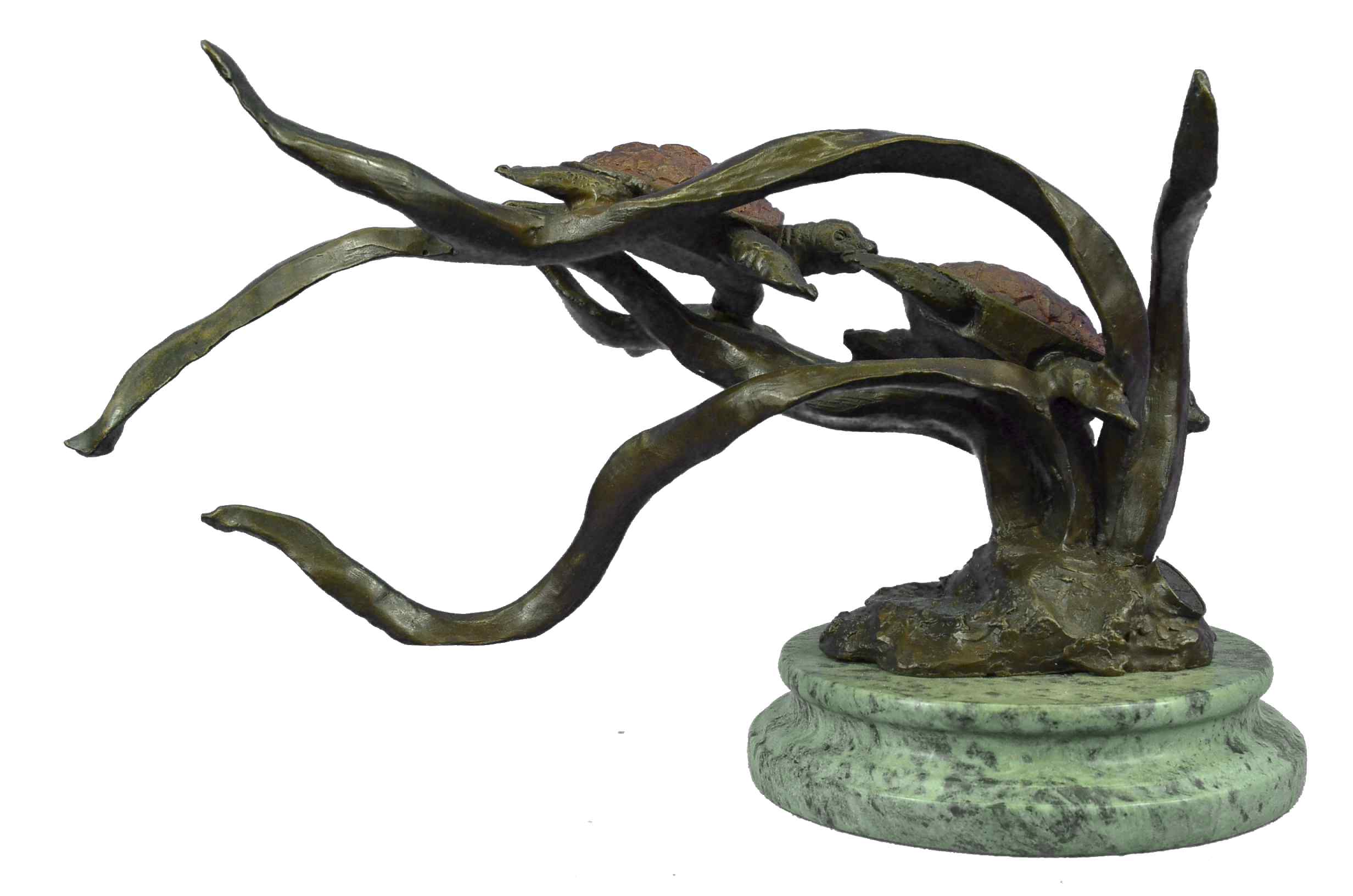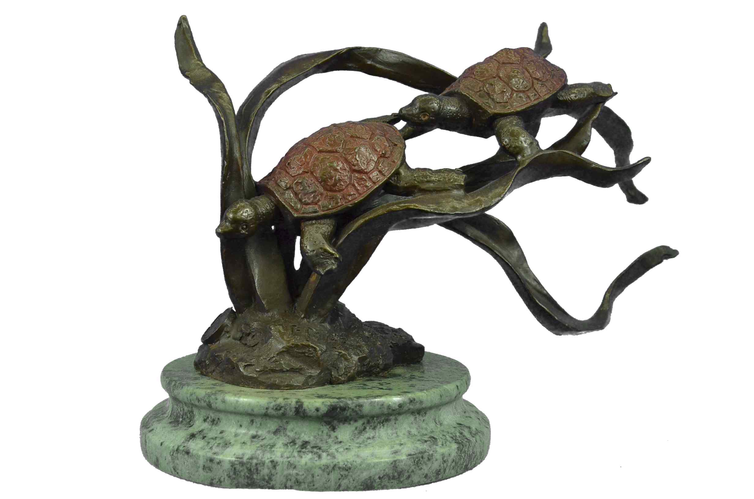These cute little turtles mates are taking a swim together through the heavily sea water. They play with each other, as they pass a branch of seaweed they lay enjoying their journey. The male leads while the female follows. The beautiful turtle shell is the color of a real tasteful apple, not that you would want to eat a little turtle but the color on these two sea creature are beautiful. This sculpture was cast using the “Lost Wax Method” and is mounted on a gorgeous heavy marble base with a delightful bronze trim around the base. This sculpture is signed F. PautrotBronze Dimensions :Height 9" x Width 15"