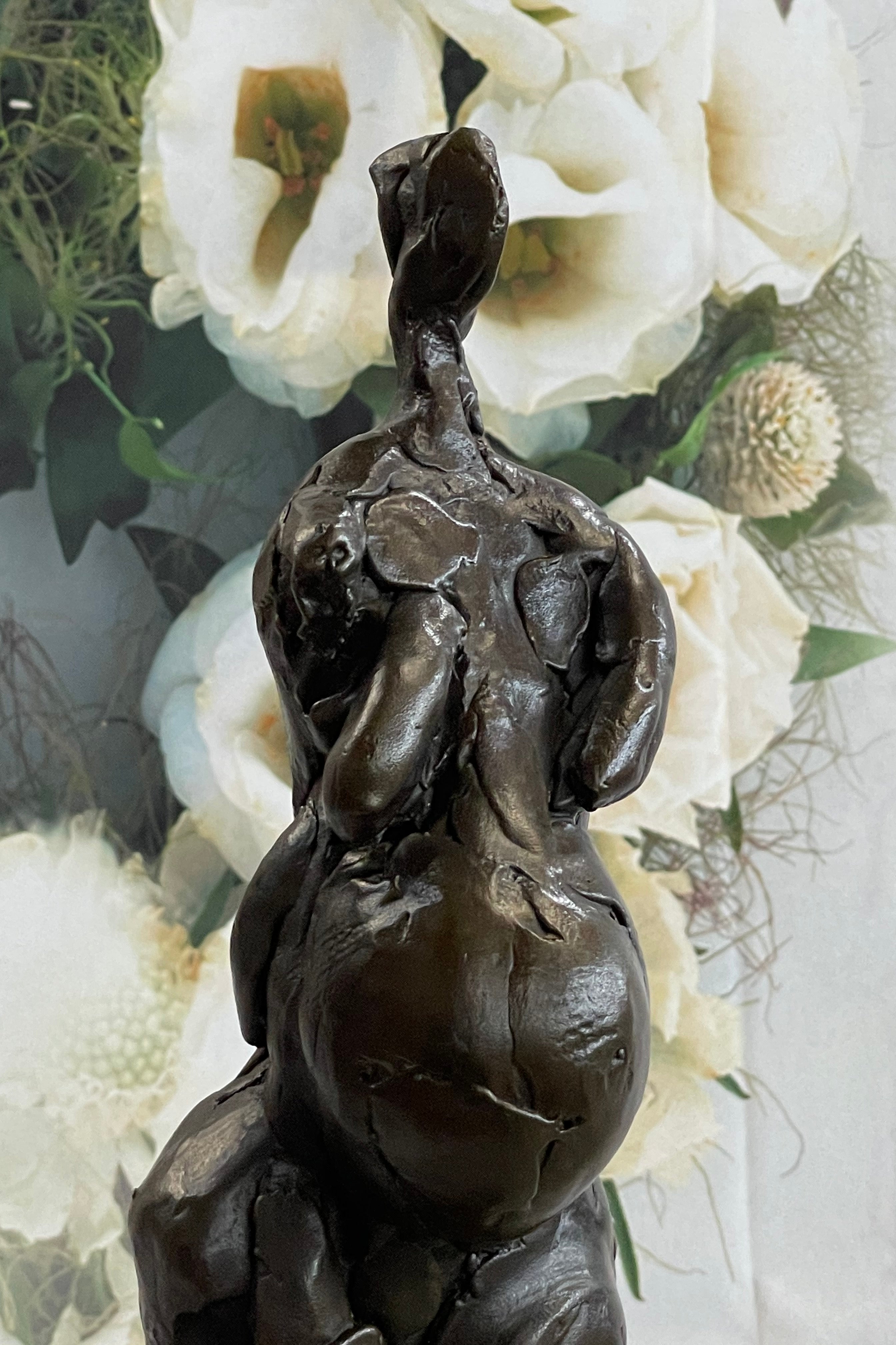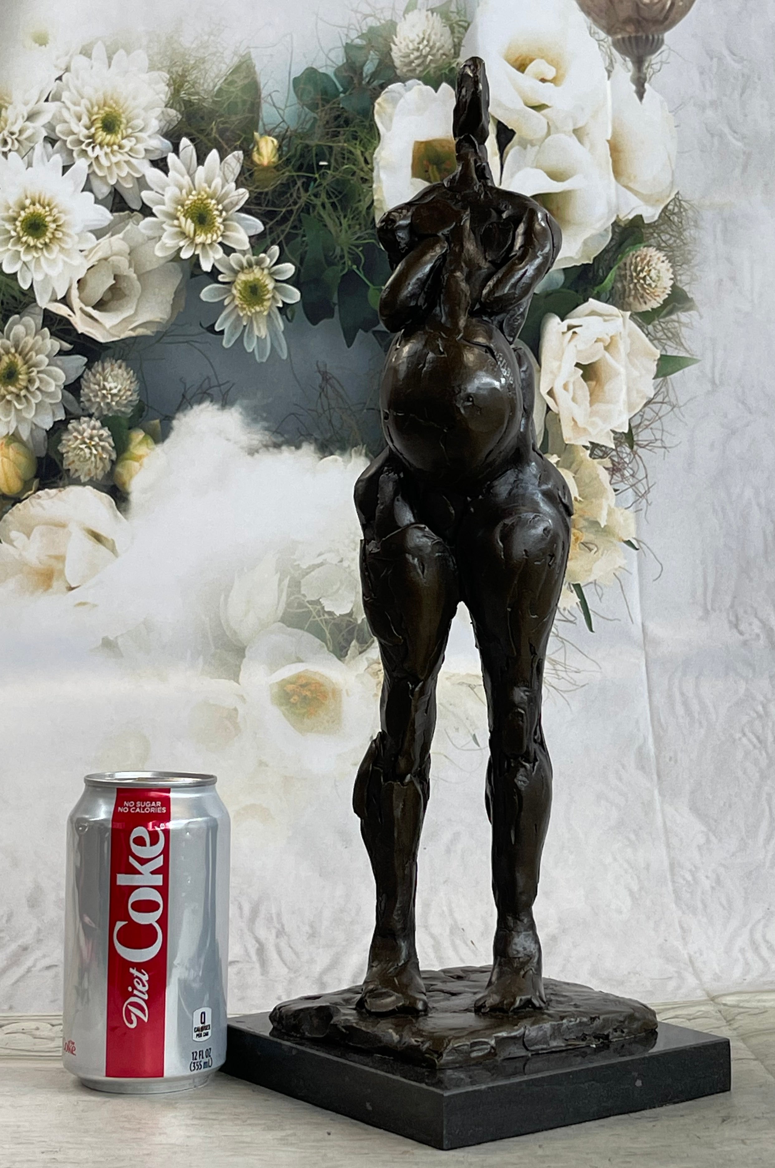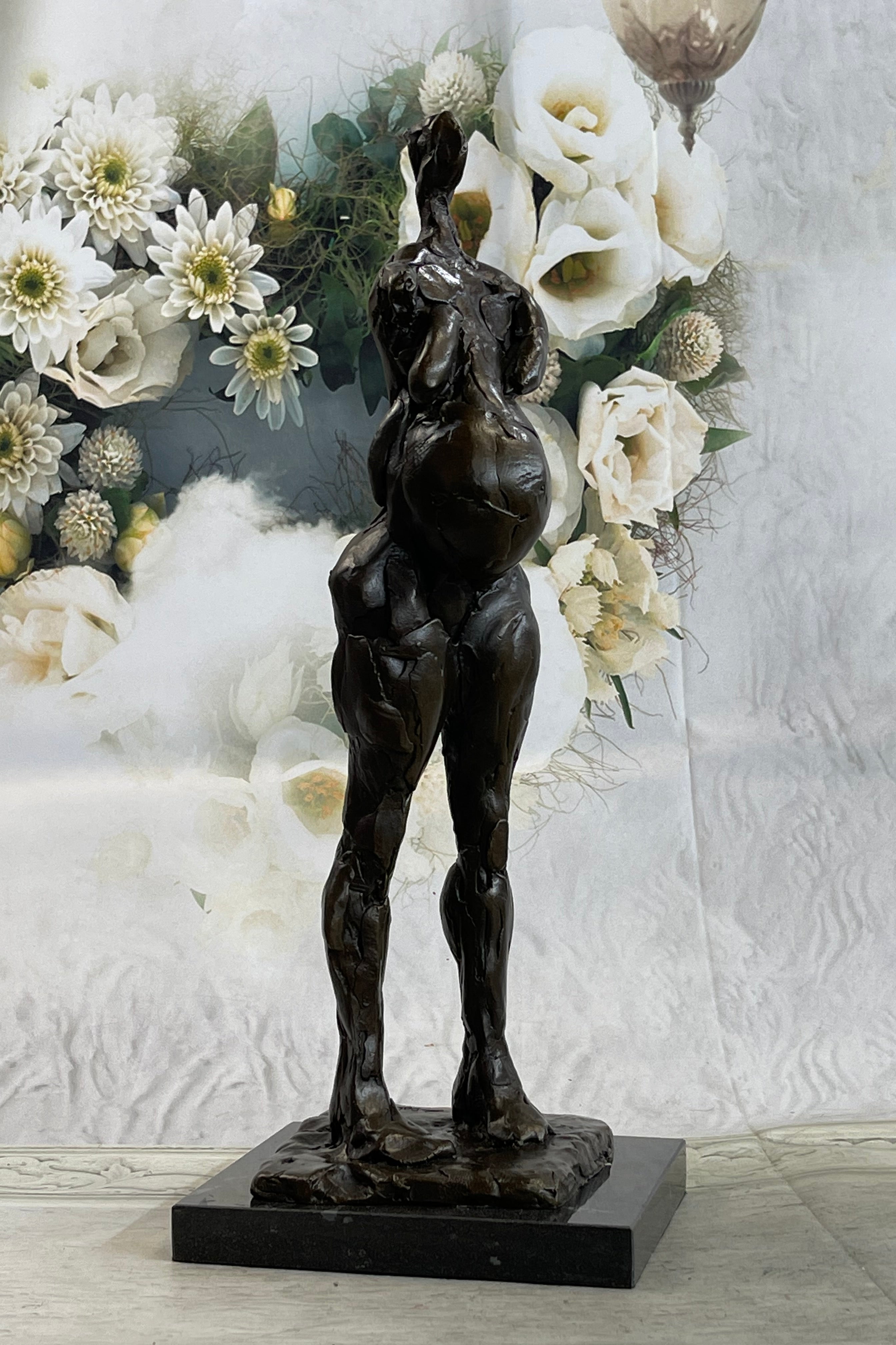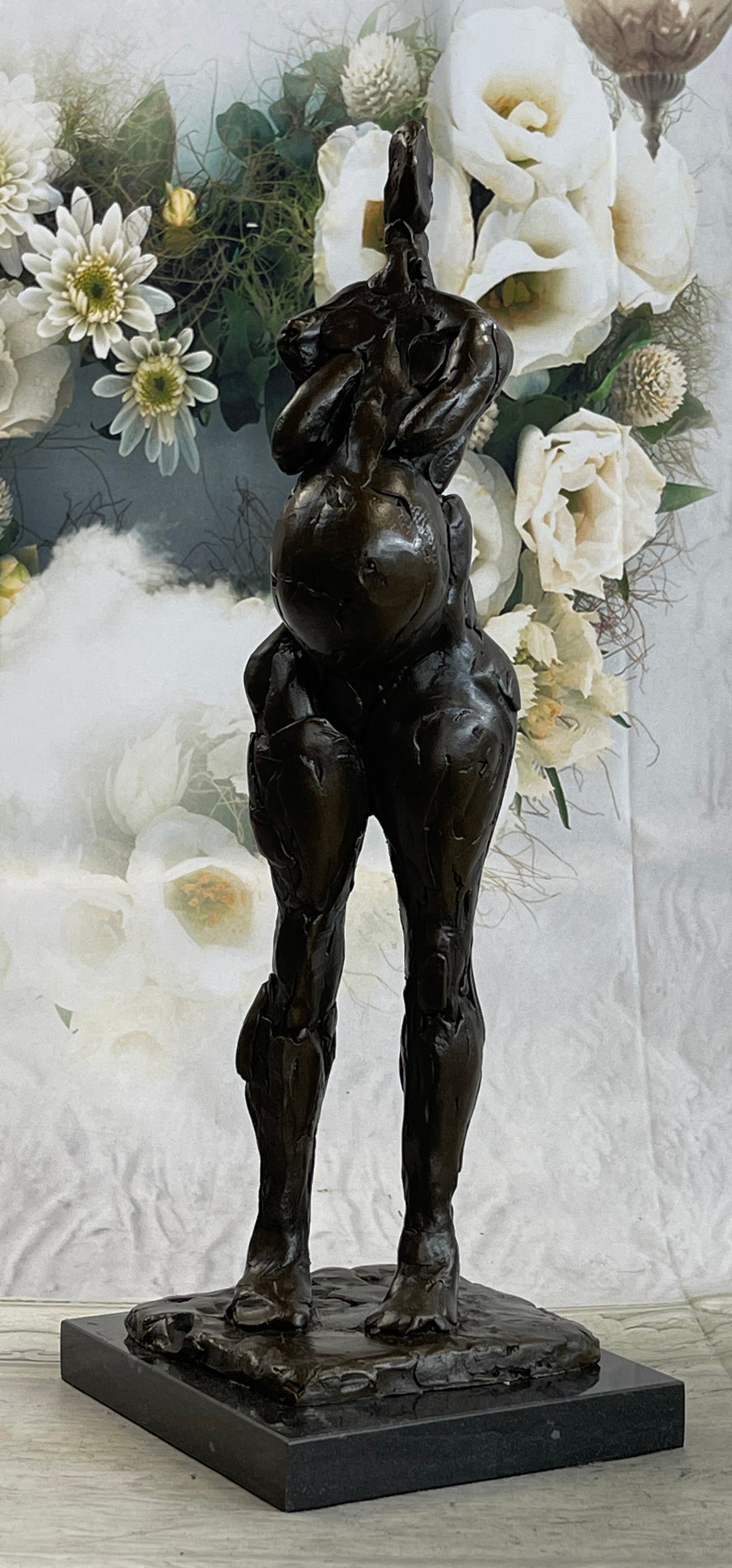 This abstract is a very odd and creative one, I guarantee you that you will have people talking about it. You can tell its a figure of a pregnant woman, but the conversation on it will be mostly about how strange art its working its way through. She has an really big torso and her legs seem to be muscular, as that was the artist intentions. She does not come with arms and the rest of her body is made of different little shapes to imagine what your body actually looks like under skin. The sculpture was cast using the ancient old "Lost Wax Method" stained in brown patina. 100% handmade and 100% bronze, mounted atop a black marble base and signed Dali.Bronze Dimensions with Marble Base: Height 16.5" X Width 6"
