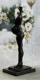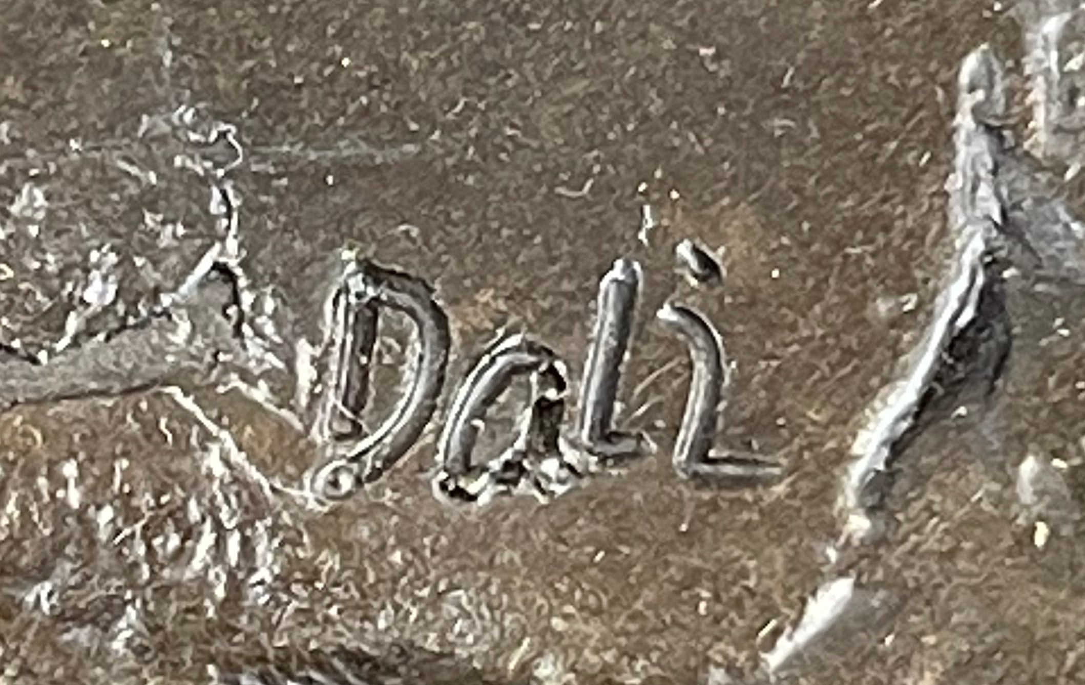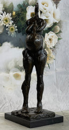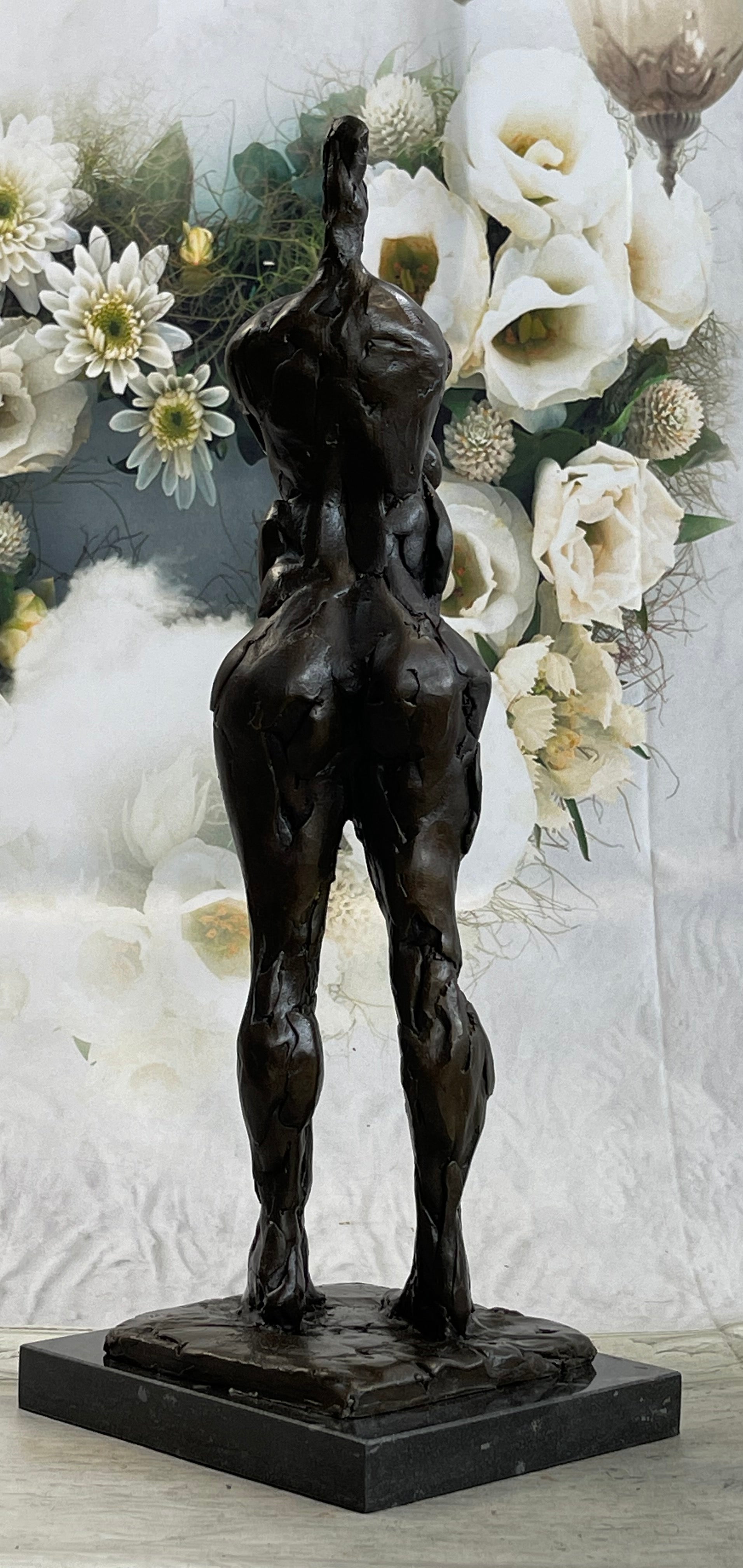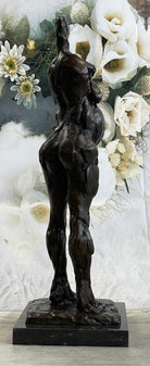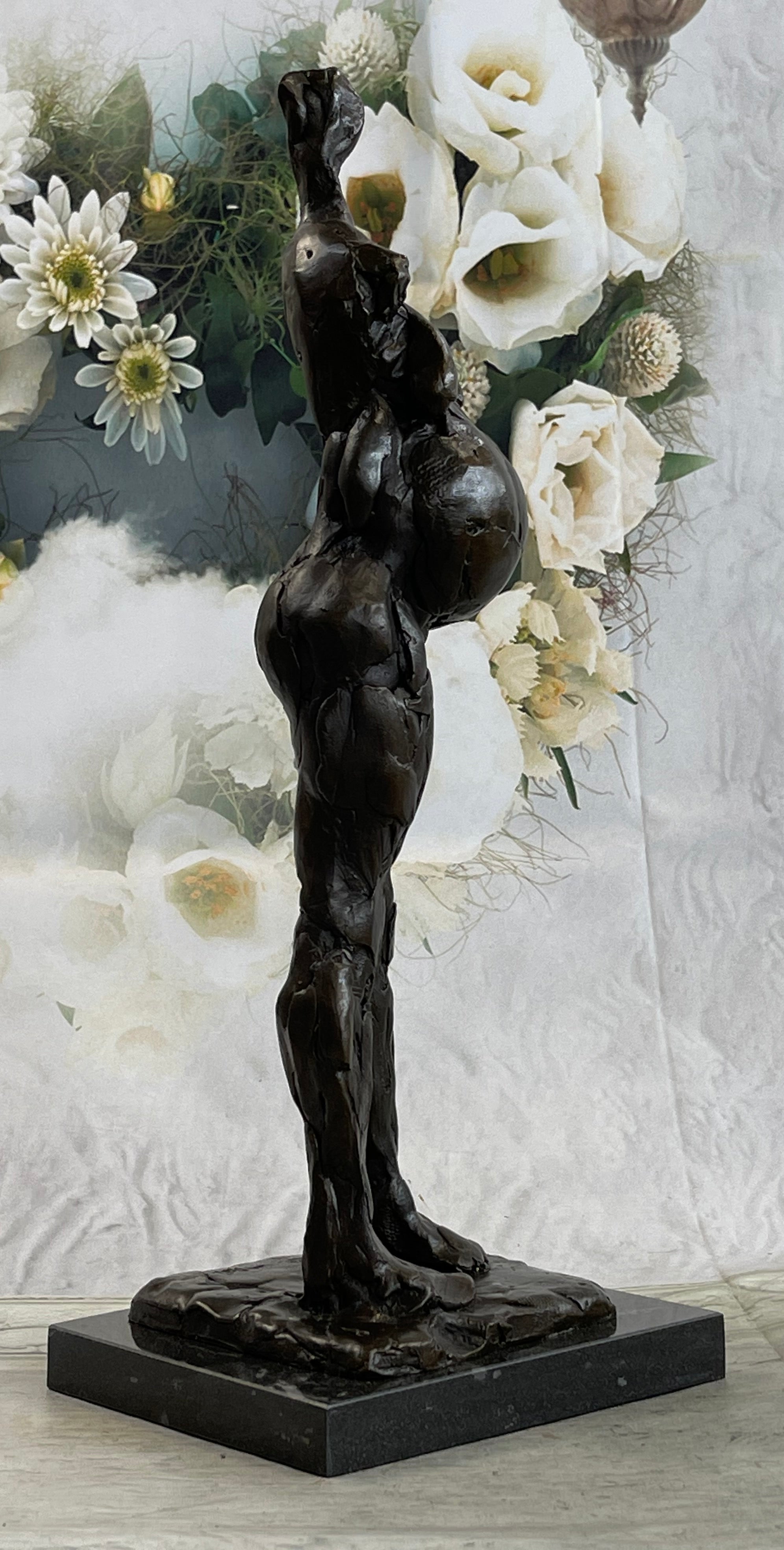 This abstract is a very odd and creative one, I guarantee you that you will have people talking about it. You can tell its a figure of a pregnant woman, but the conversation on it will be mostly about how strange art its working its way through. She has an really big torso and her legs seem to be muscular, as that was the artist intentions. She does not come with arms and the rest of her body is made of different little shapes to imagine what your body actually looks like under skin. The sculpture was cast using the ancient old "Lost Wax Method" stained in brown patina. 100% handmade and 100% bronze, mounted atop a black marble base and signed Dali.Bronze Dimensions with Marble Base: Height 16.5" X Width 6"