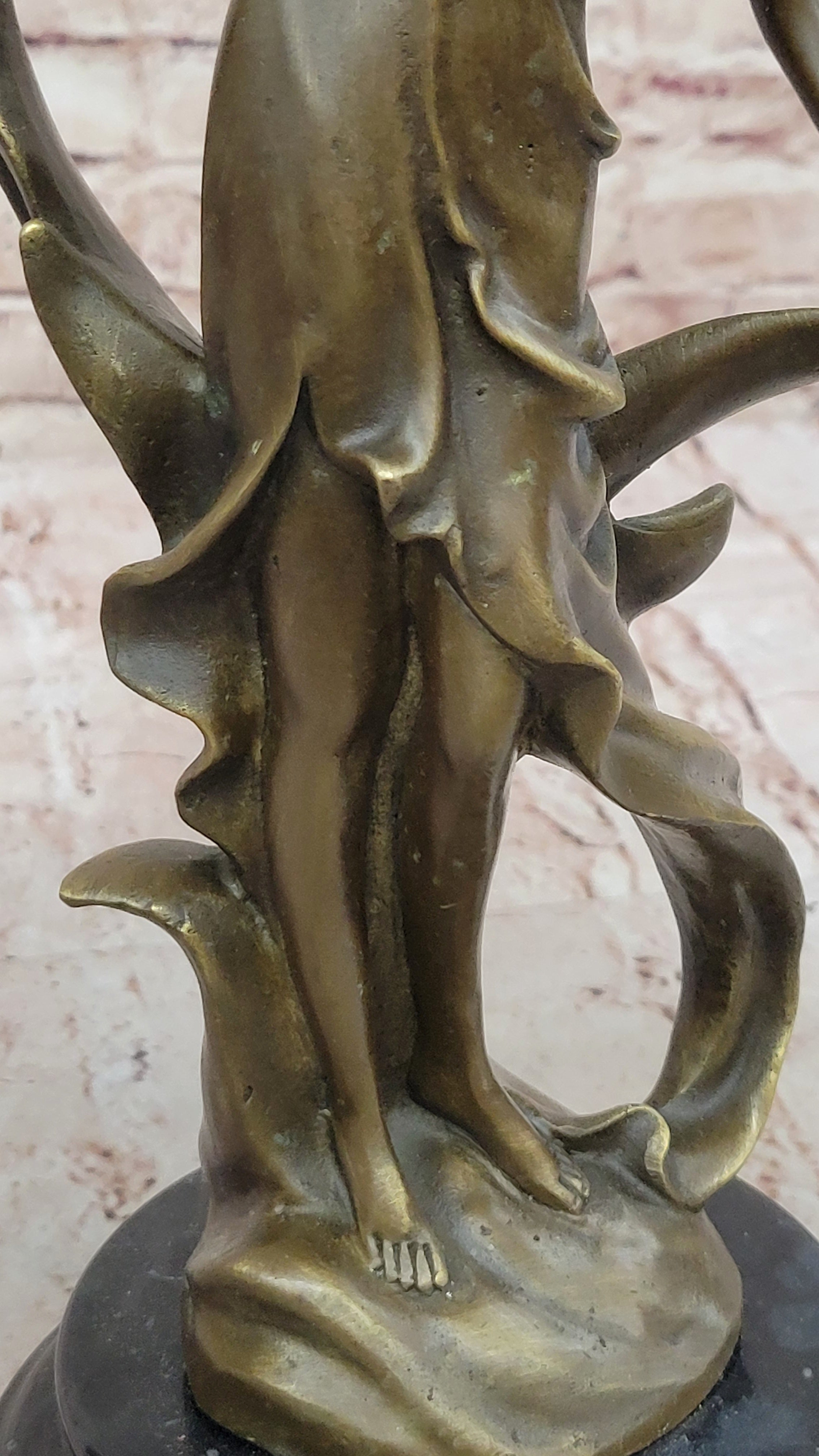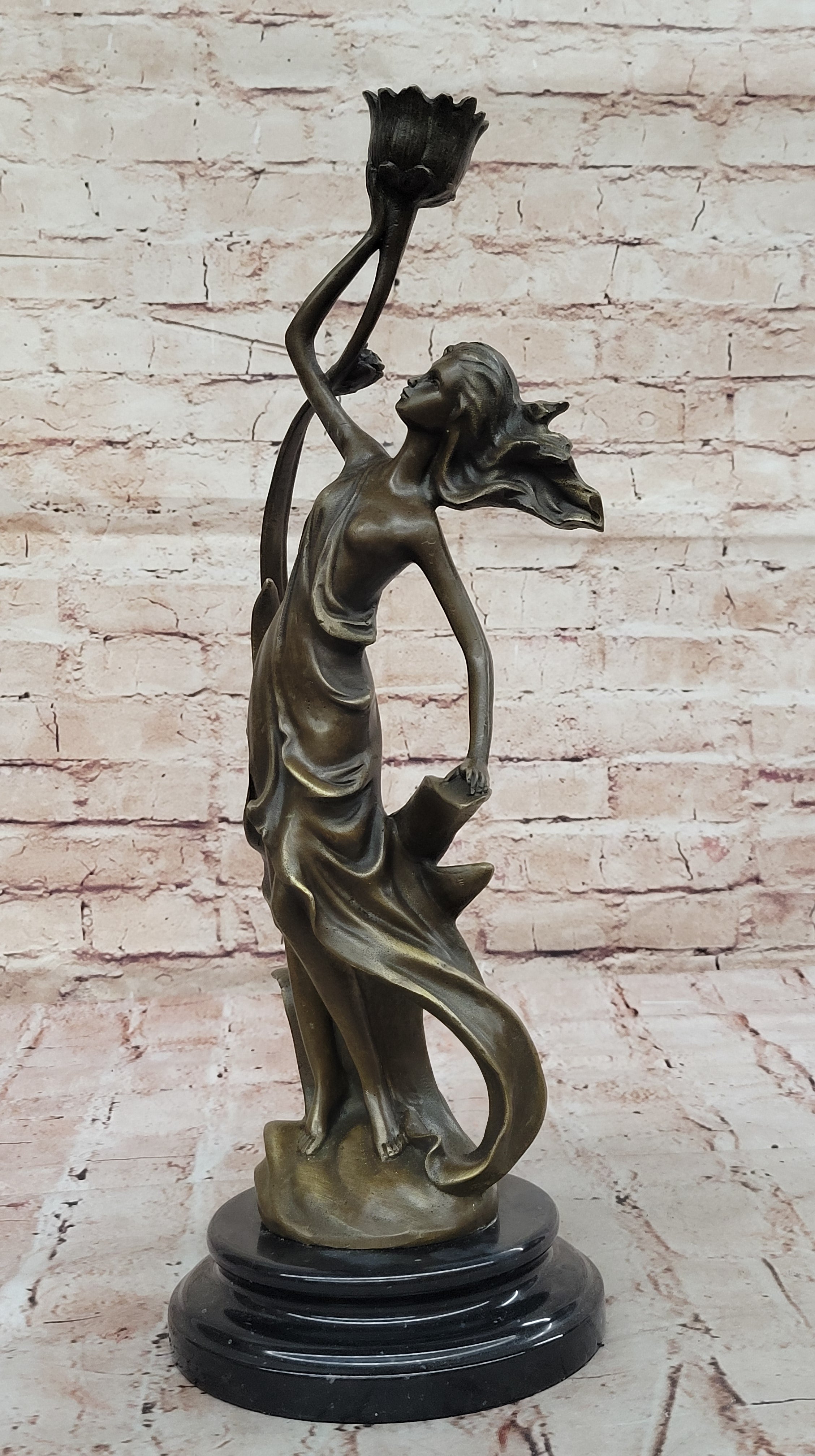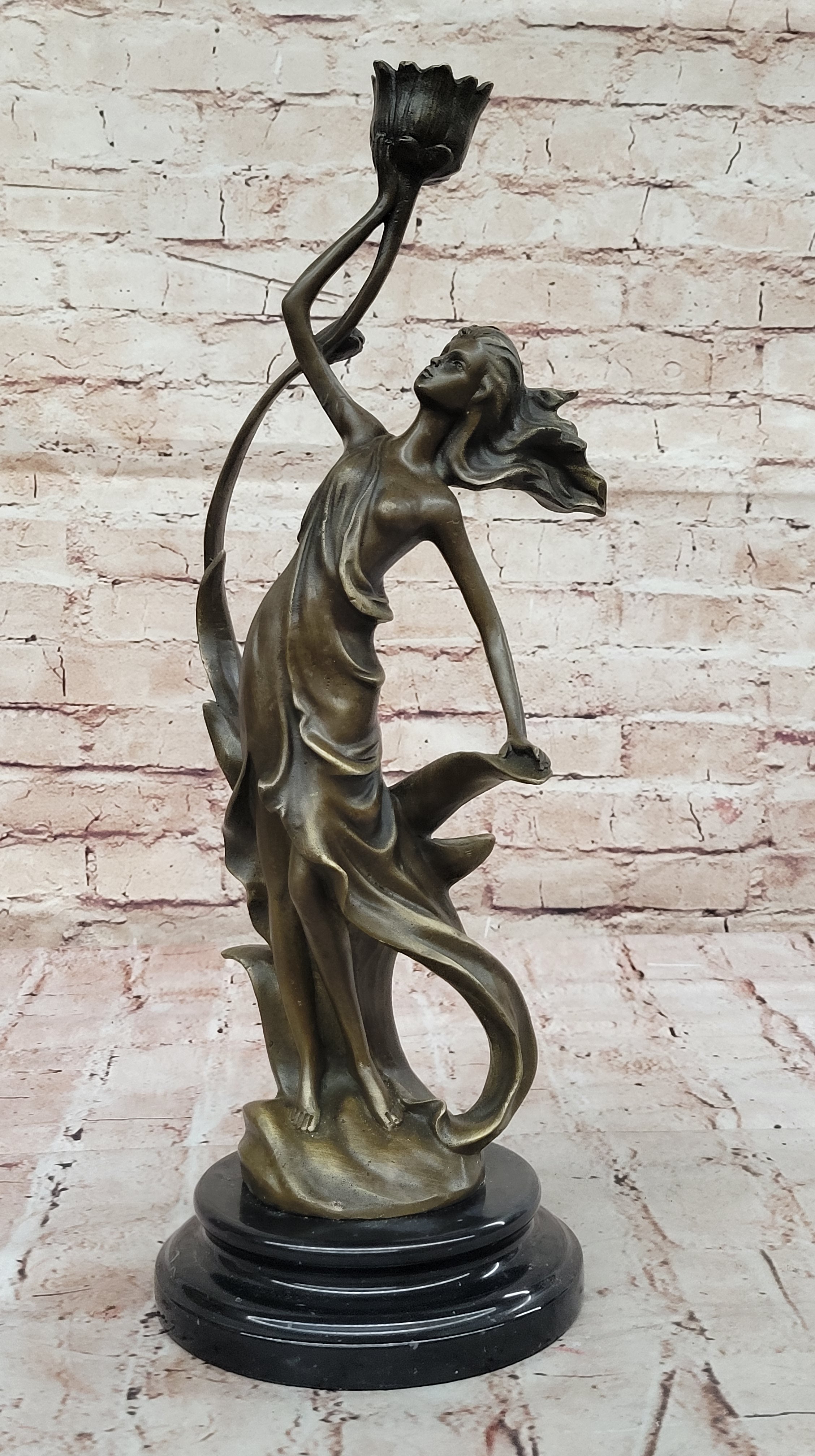 Art Nouveau Bronze Candle Holder Sculpture – Elegant Woman with Flowing Dress on Marble Base