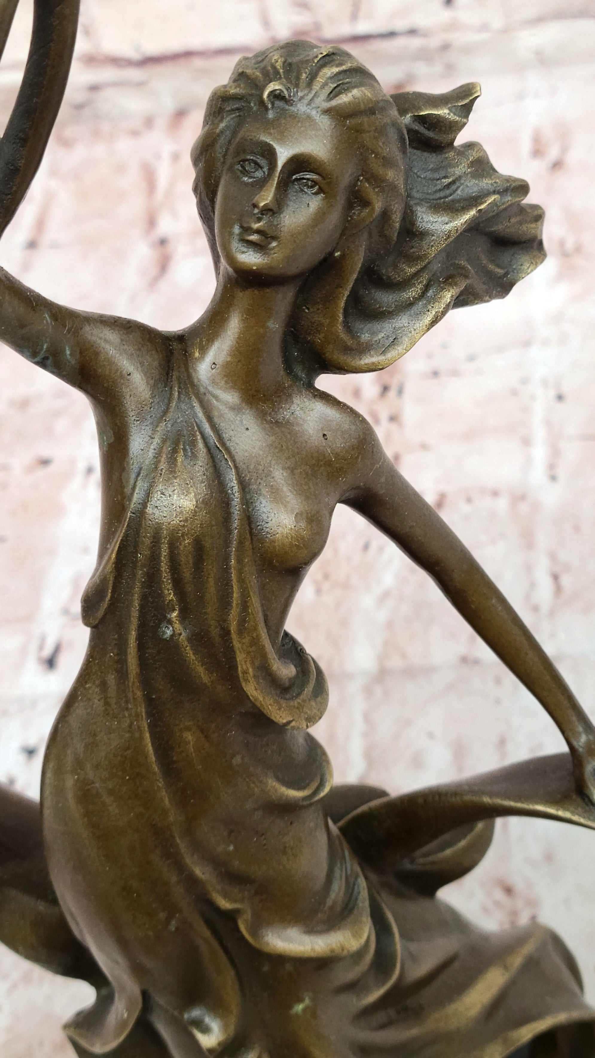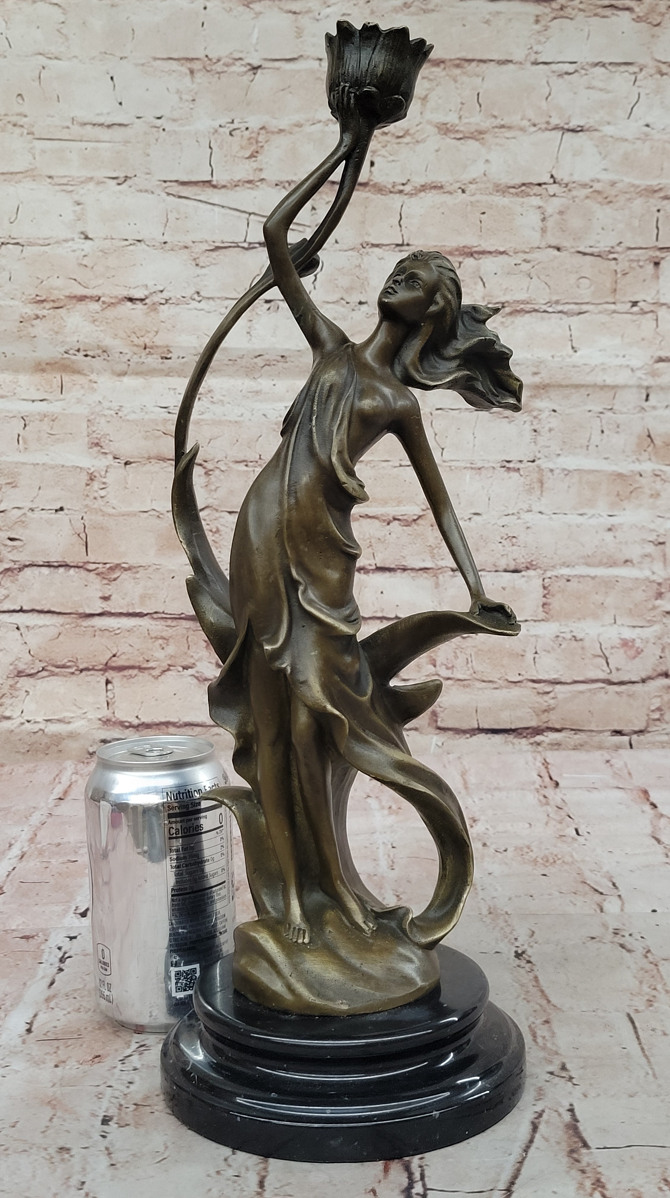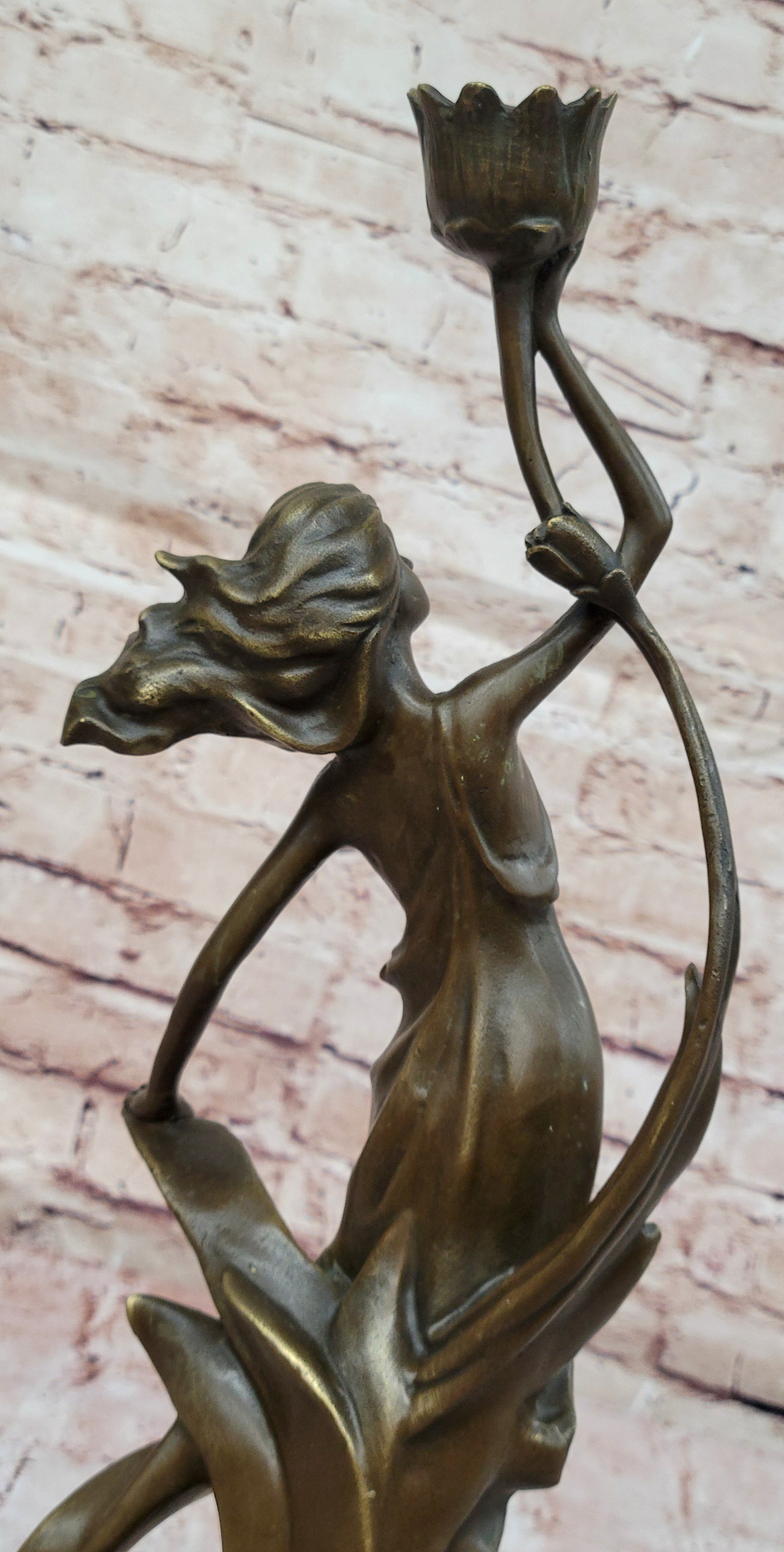 Art Nouveau Bronze Candle Holder Sculpture – Elegant Woman with Flowing Dress on Marble Base