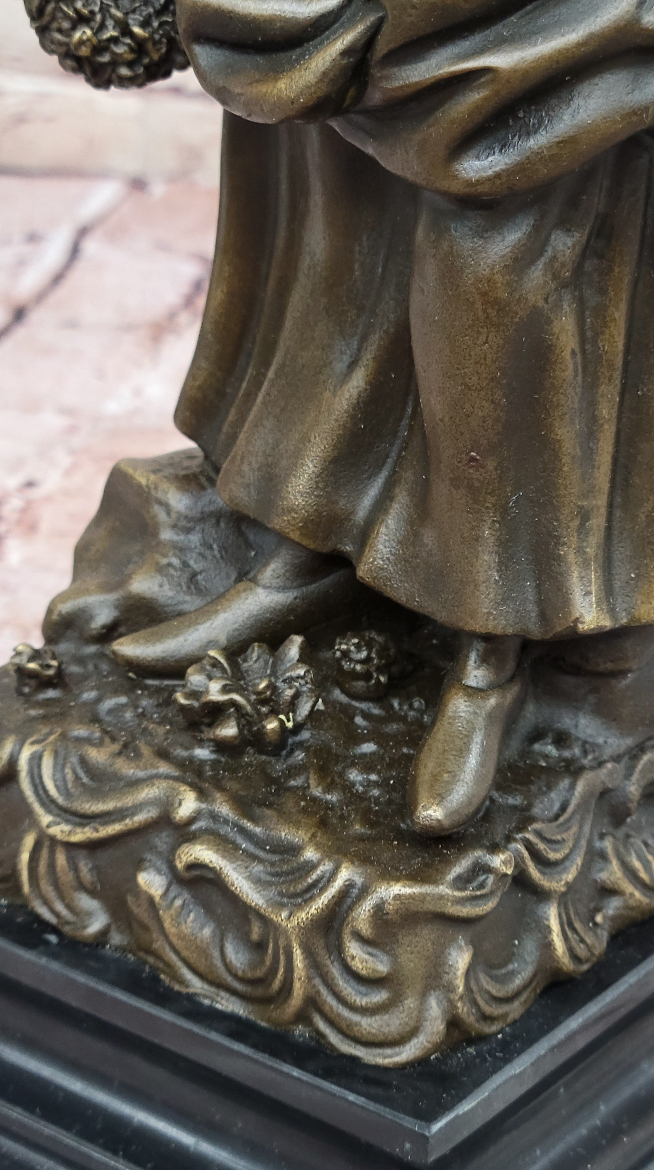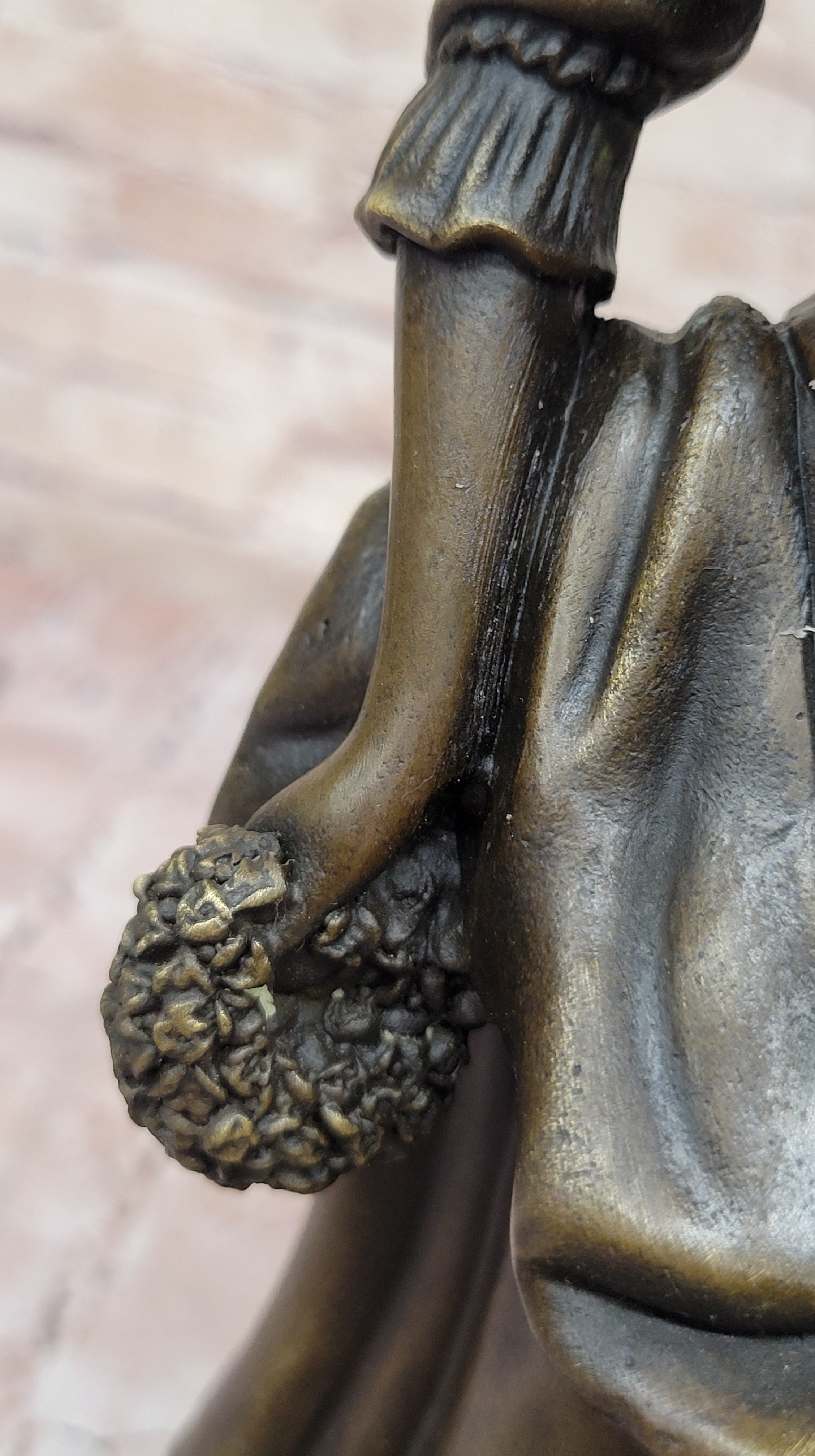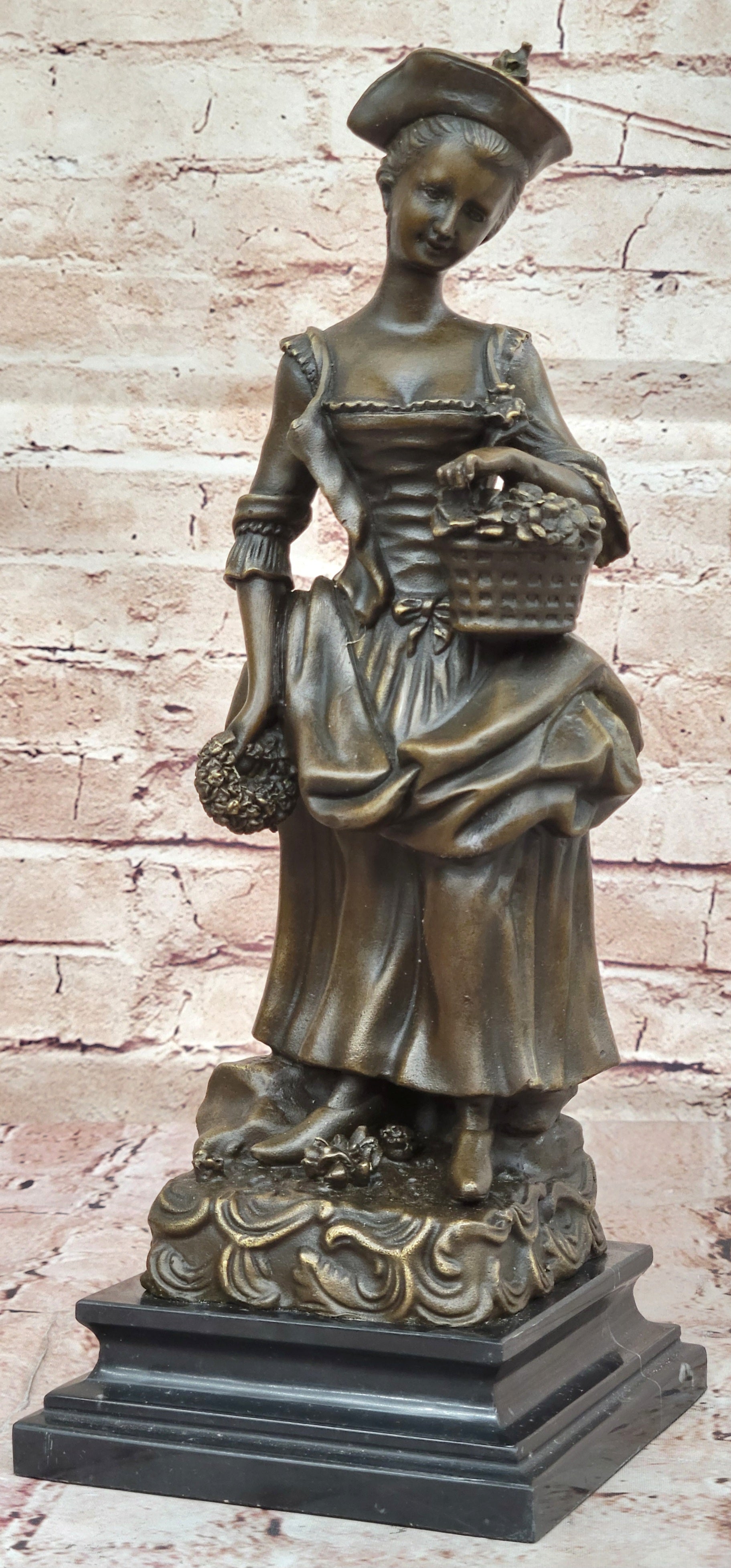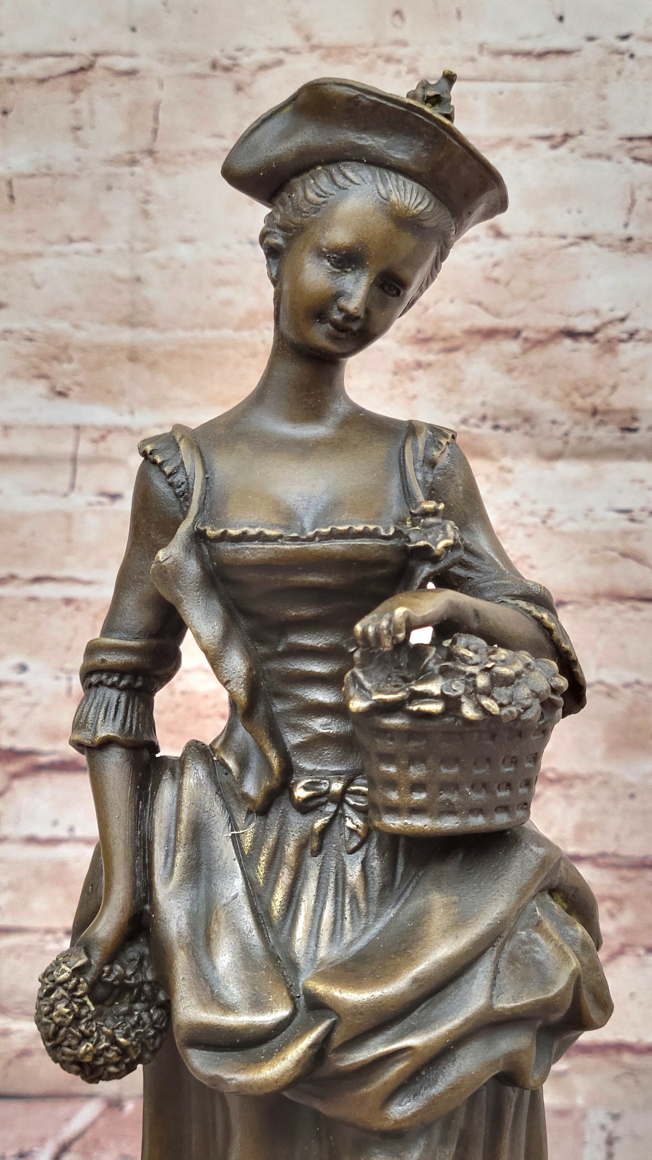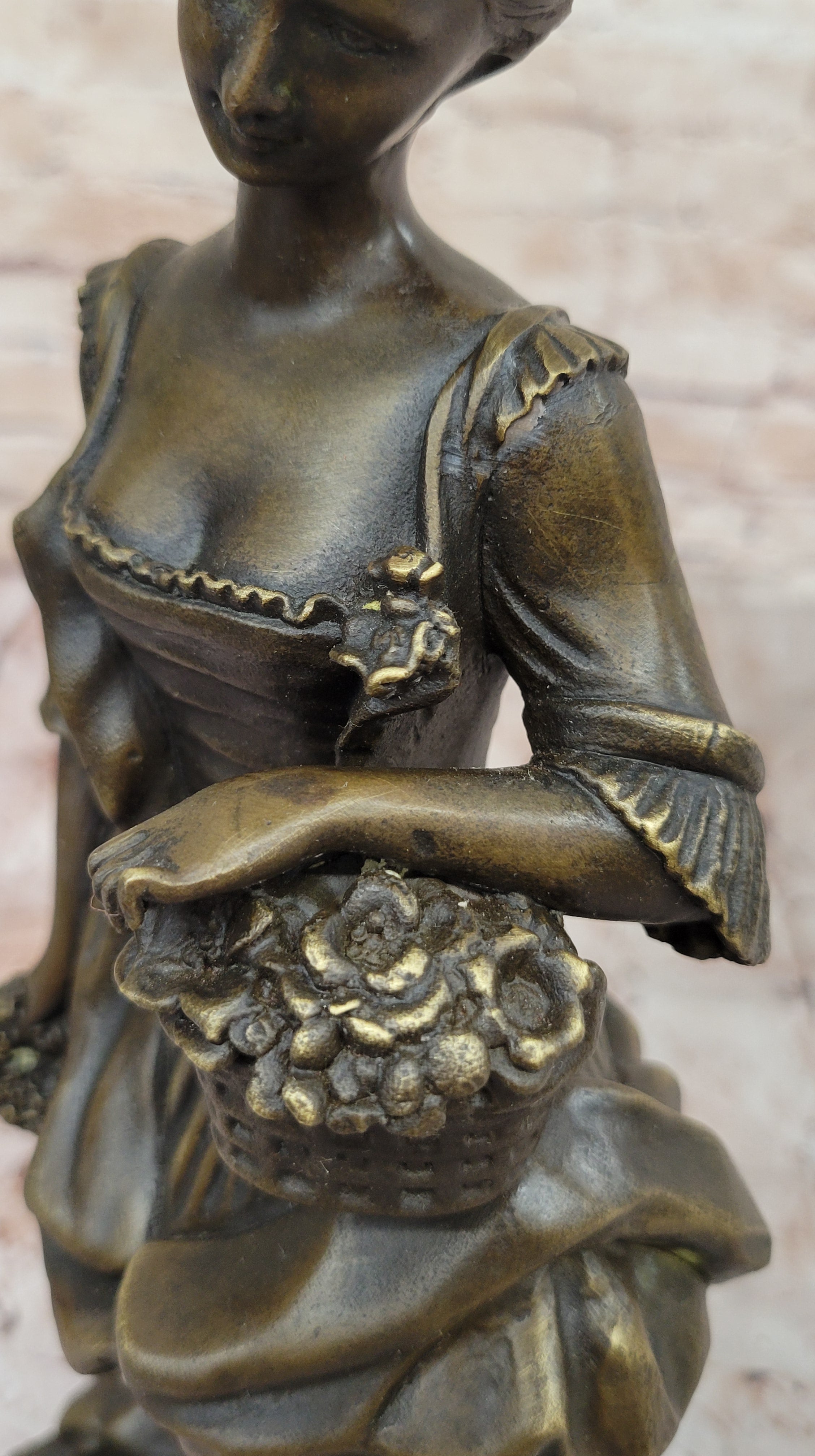 Bronze Sculpture of Woman in Traditional Dress Holding Basket of Flowers - Rustic Country Lady Statue
