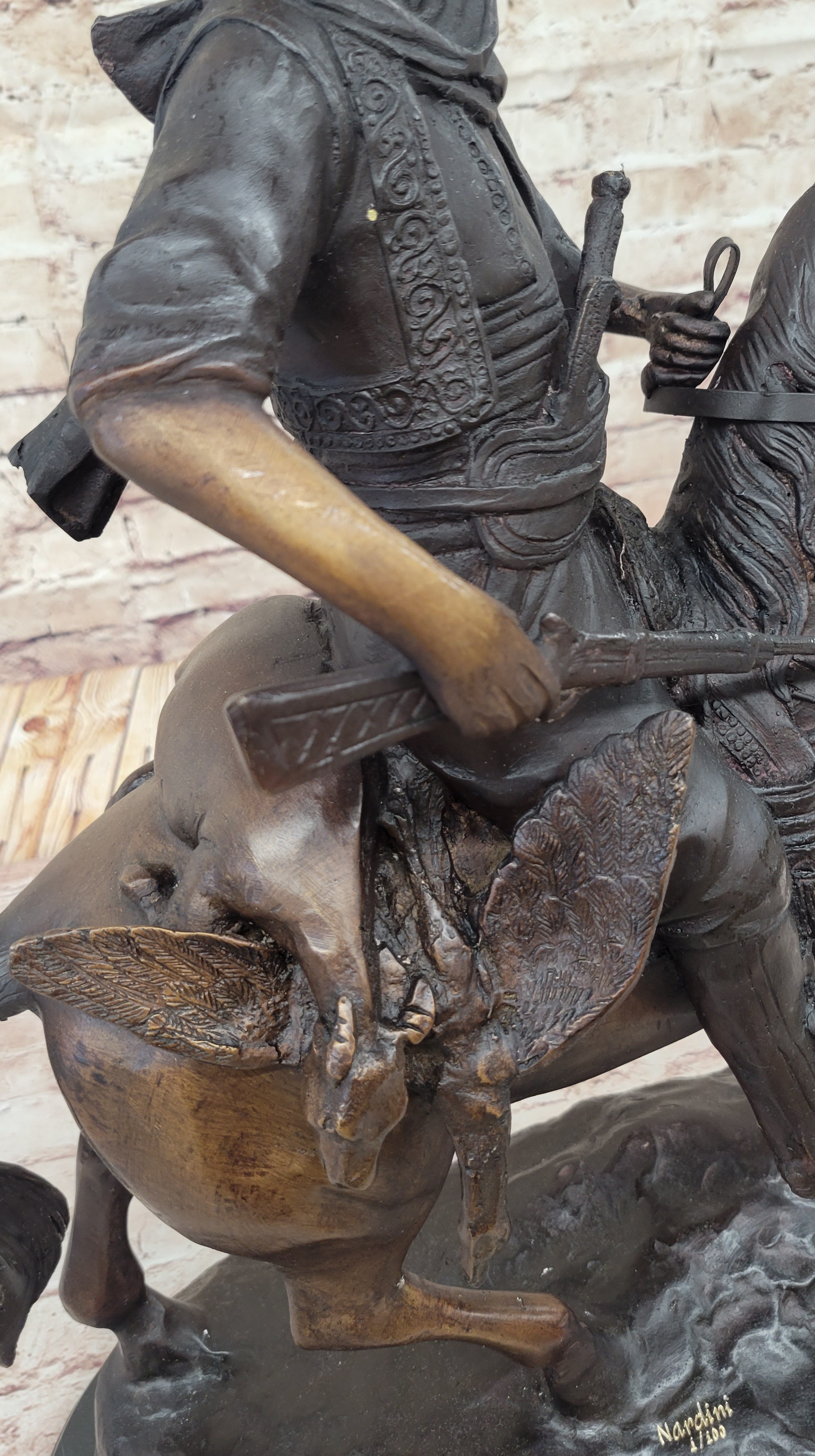 This exquisite bronze sculpture, titled "Limited Edition by Nardini Arab Warrior with Gun on Horse," captures the essence of a powerful and dynamic scene. The skillfully crafted portrayal of the Arab warrior, mounted on a horse and armed with a gun, exudes an aura of strength and valor. The intricate details of the sculpture, from the warrior's attire to the horse's majestic form, reflect the meticulous artistry involved in its creation.