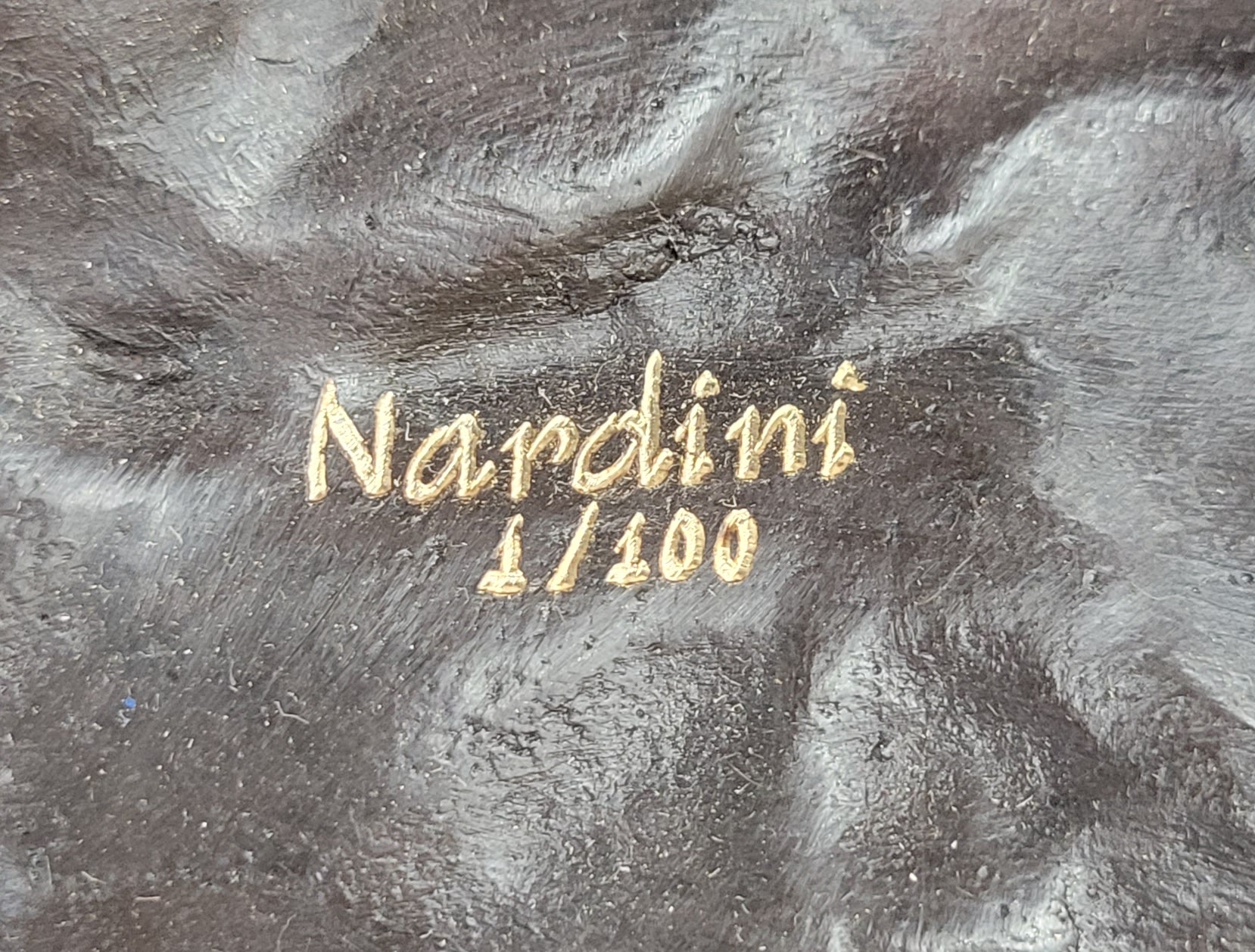 This limited edition bronze sculpture is not only a remarkable work of art but also a collectible masterpiece. Each piece is signed and numbered by the renowned artist Nardini, ensuring its authenticity and value. With its captivating depiction and meticulous craftsmanship, this sculpture serves as a captivating addition to any art collection, inviting viewers to immerse themselves in the rich history and culture it represents.Bronze Dimensions with Marble Base: Height 23.5" X Width 18.5"