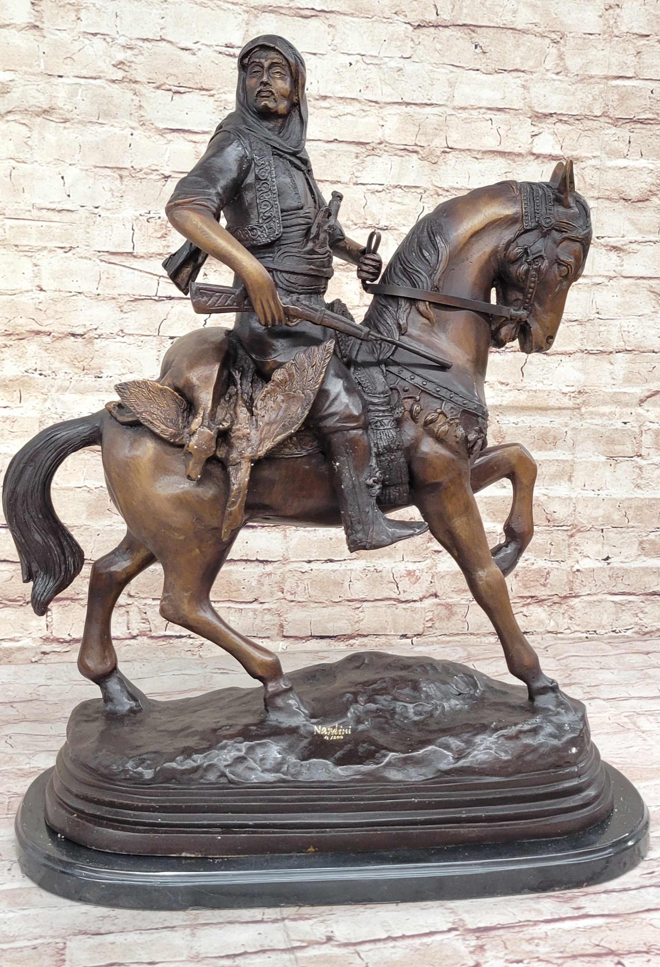 Meticulously handcrafted using the lost wax method, this sculpture is a true testament to the artist's dedication to precision and artistry. The stunning two-tone brown patina finish adds depth and character to the piece, accentuating the intricate details and textures. Resting on a sleek black marble base, the sculpture stands as a striking symbol of bravery and resilience, encapsulating the spirit of the Arab warrior's legacy.