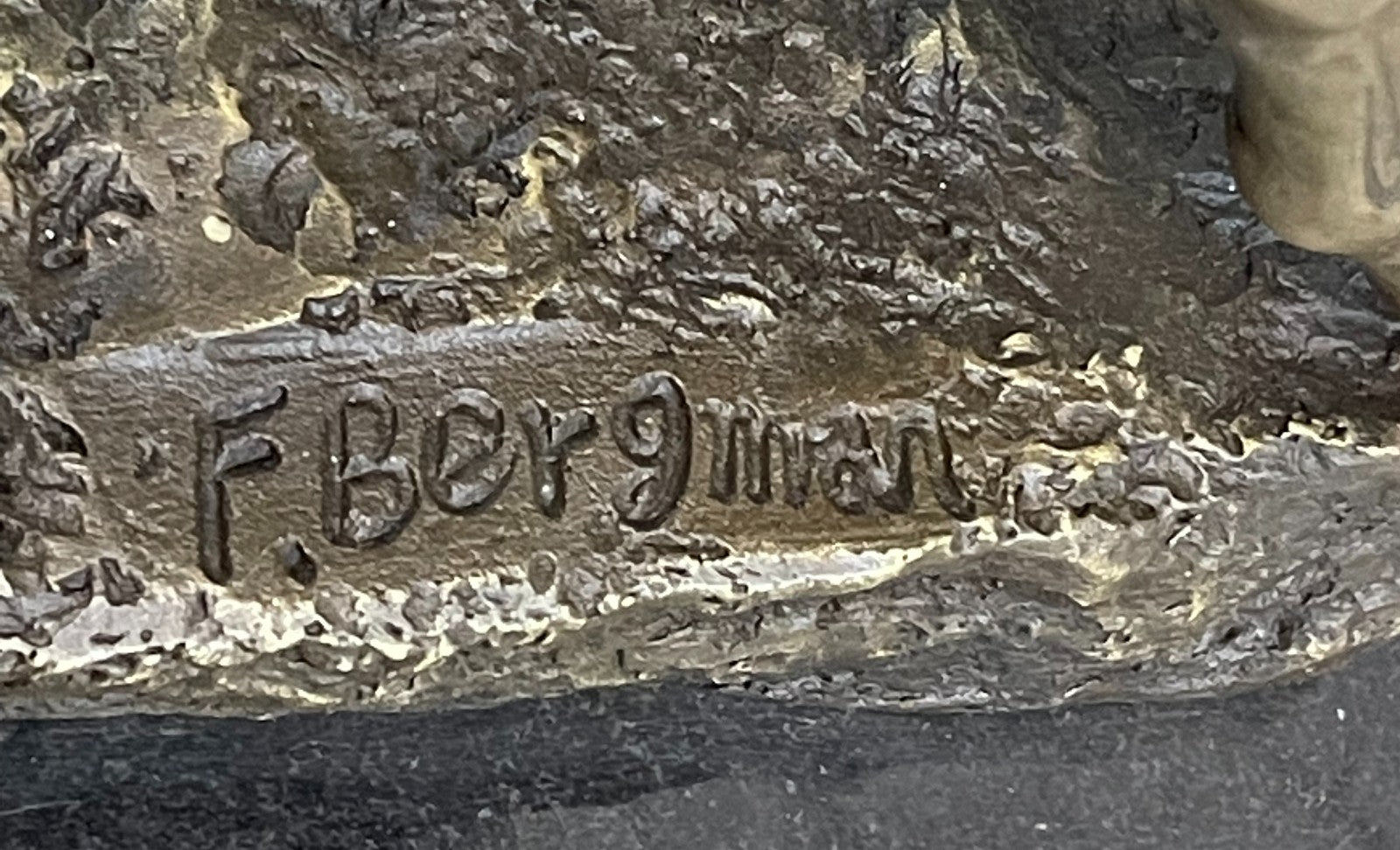 Franz Bergman, an Austrian entrepreneur born in 1861 in Vienna, is renowned for his Viennese foundry, which became synonymous with the production of exquisite bronze sculptures. While often mistaken as a sculptor himself, Bergman's genius lay in his ability to conceptualize and commission works of art, rather than physically crafting them. He employed numerous anonymous sculptors to bring his visions to life, covering a diverse array of subjects ranging from erotic figures and animals to Orientalist scenes and mythological creatures. Notably, Bergman adopted the pseudonym Nam Greb when signing many of the erotic works produced by his foundry. This practice served to shield his identity from authorities and evade potential penalties for the perceived immorality of such artworks during the era. Despite the controversy surrounding some of his pieces, Bergman's dedication to craftsmanship and innovation solidified his legacy as a pioneering figure in the world of bronze sculpture. Bergman's foundry gained widespread acclaim for its mastery of patina- and cold-painted bronze techniques, which lent an exquisite finish to each sculpture. His contributions to the art world extended beyond mere production; his entrepreneurial spirit and commitment to pushing boundaries left an indelible mark on the Viennese art scene of the late 19th and early 20th centuries. Franz Bergman passed away in 1936, leaving behind a legacy of artistic excellence and ingenuity that continues to be celebrated by collectors and enthusiasts worldwide.