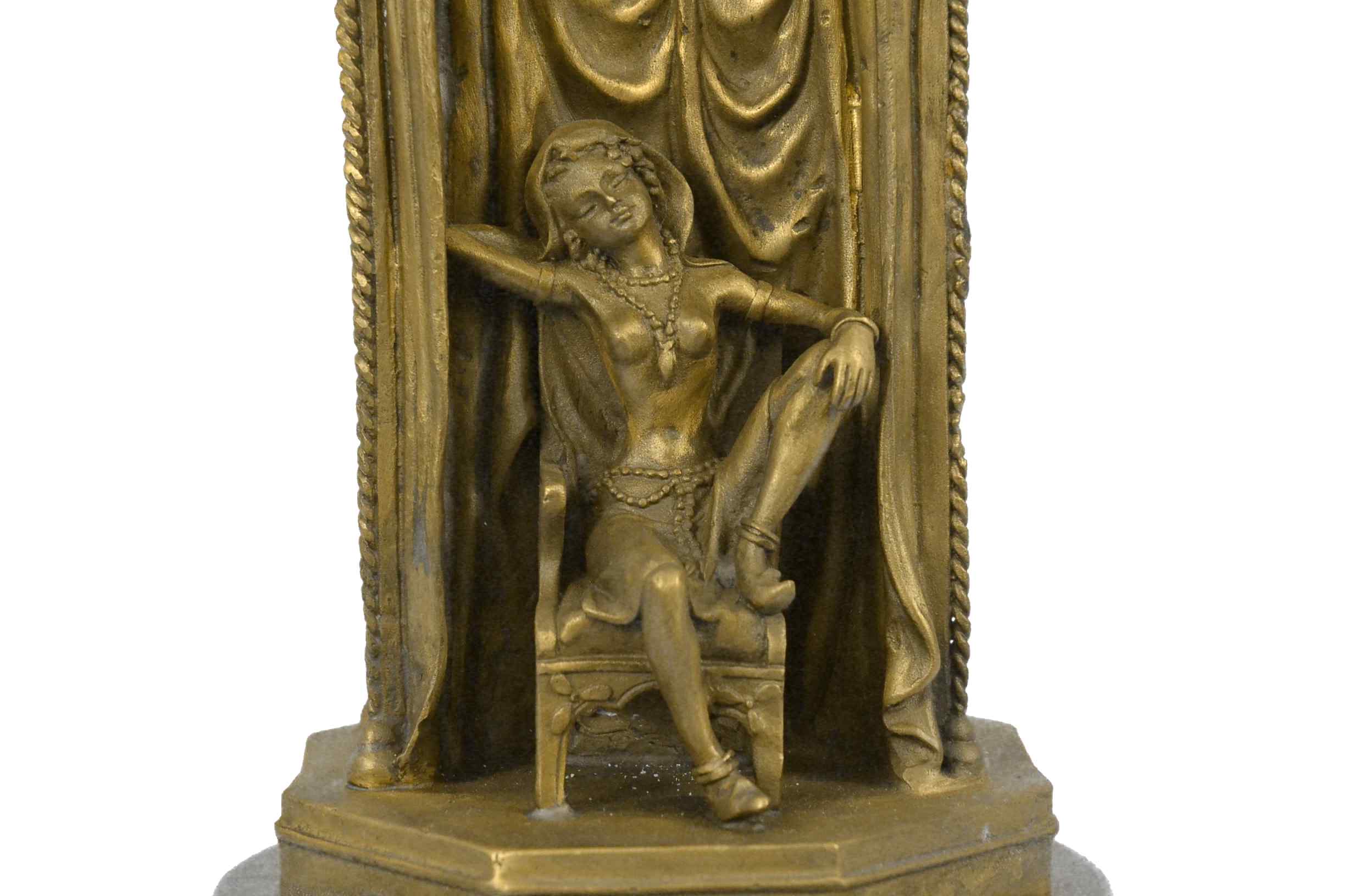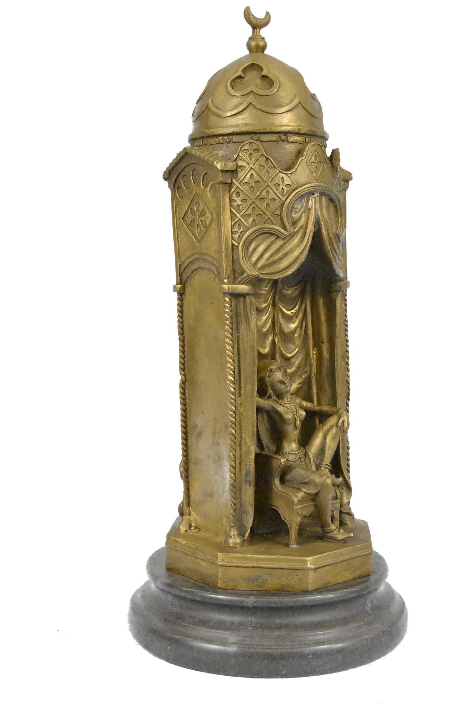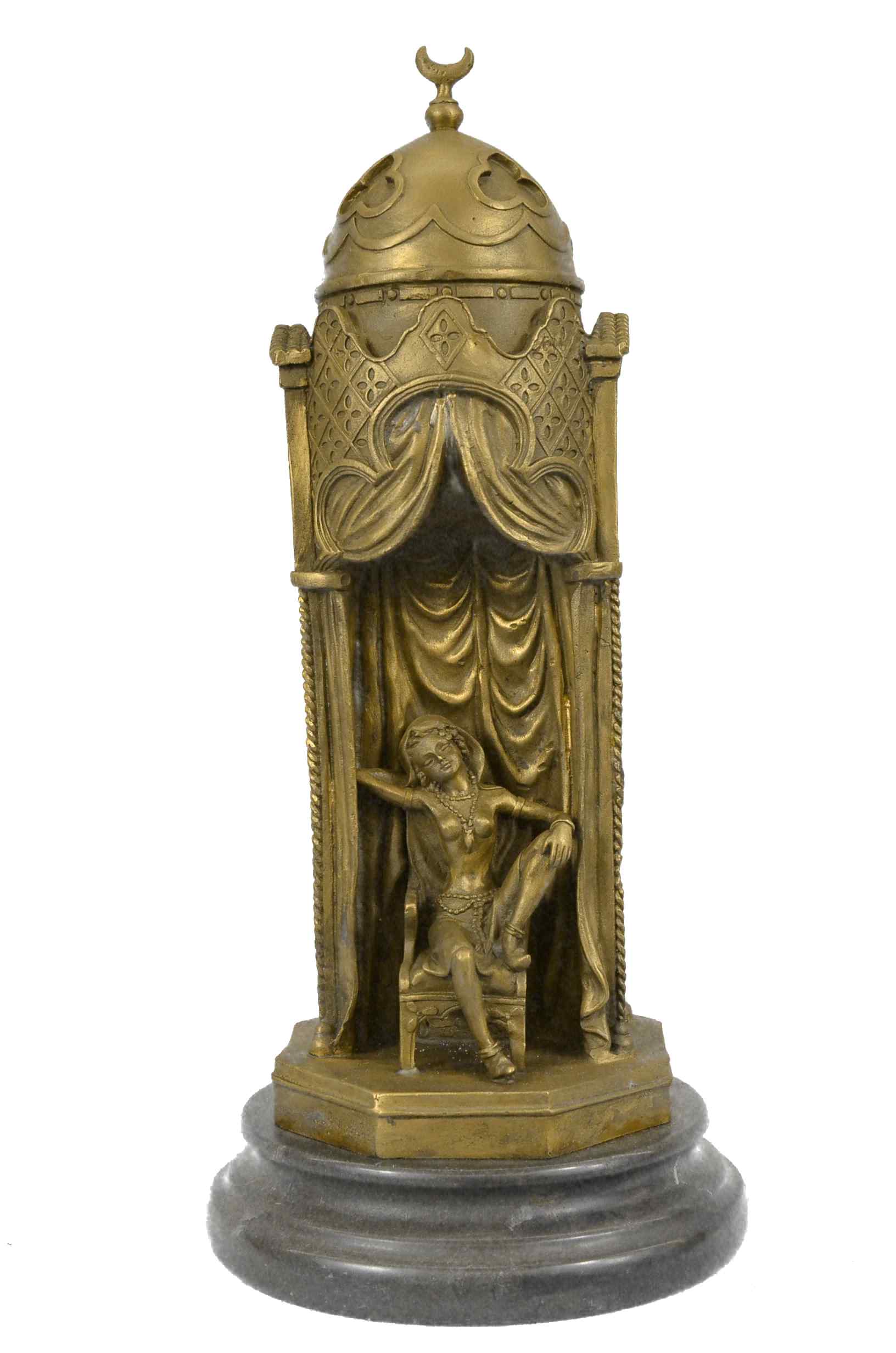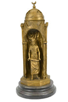 Here is a beautiful large bronze reproduction sculpture by Nam Greb (Franz Bergman). This beautiful and very well done bronze reproduction measures 14" high sitting on a black marble base. Features a Guard protection a slave young lady in the harem. Signed Nam Greb for the 19th Century artist Franz Bergman who spelled his name backwards on his erotic bronzes. It is in great condition with no flaws and ready for display.Bronze Dimensions with Marble Base:Height 14" x Width 6"