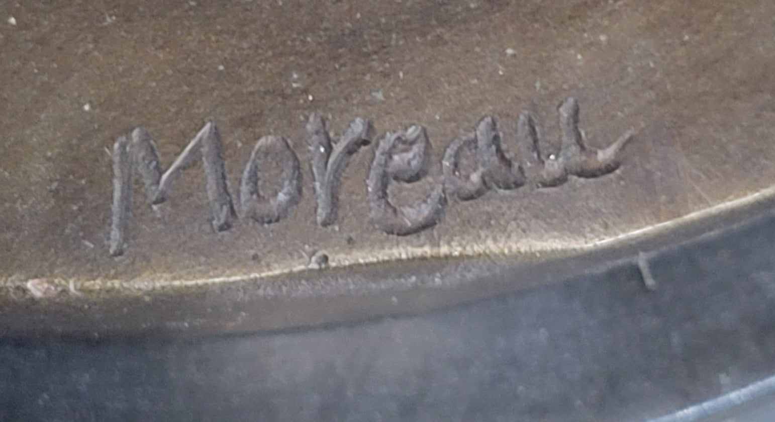 The sculpture captures the Hellenic deity, Artemis, goddess of the hunt, wild animals, wilderness, childbirth, virginity and young girls, bringing and relieving disease in women. She can be envisioned standing among the dust that drifts like gold particles in the eternal sun of an enchanted forest. She hunts a bird in flight as we witness her release; her arm hanging gracefully in the air while the bow is held high, marking the direction of the arrow. A heavy robe twines about her form as one of her hunting dogs yaps at her feet. The handmade bronze sculpture was molded using the ancient method of lost-wax casting and stained with a brown patina finish for preservation. It is mounted upon a black marble base with the artist A. Moreau`s signature.Bronze Dimensions with Marble Base: Height 33" x Width 13"