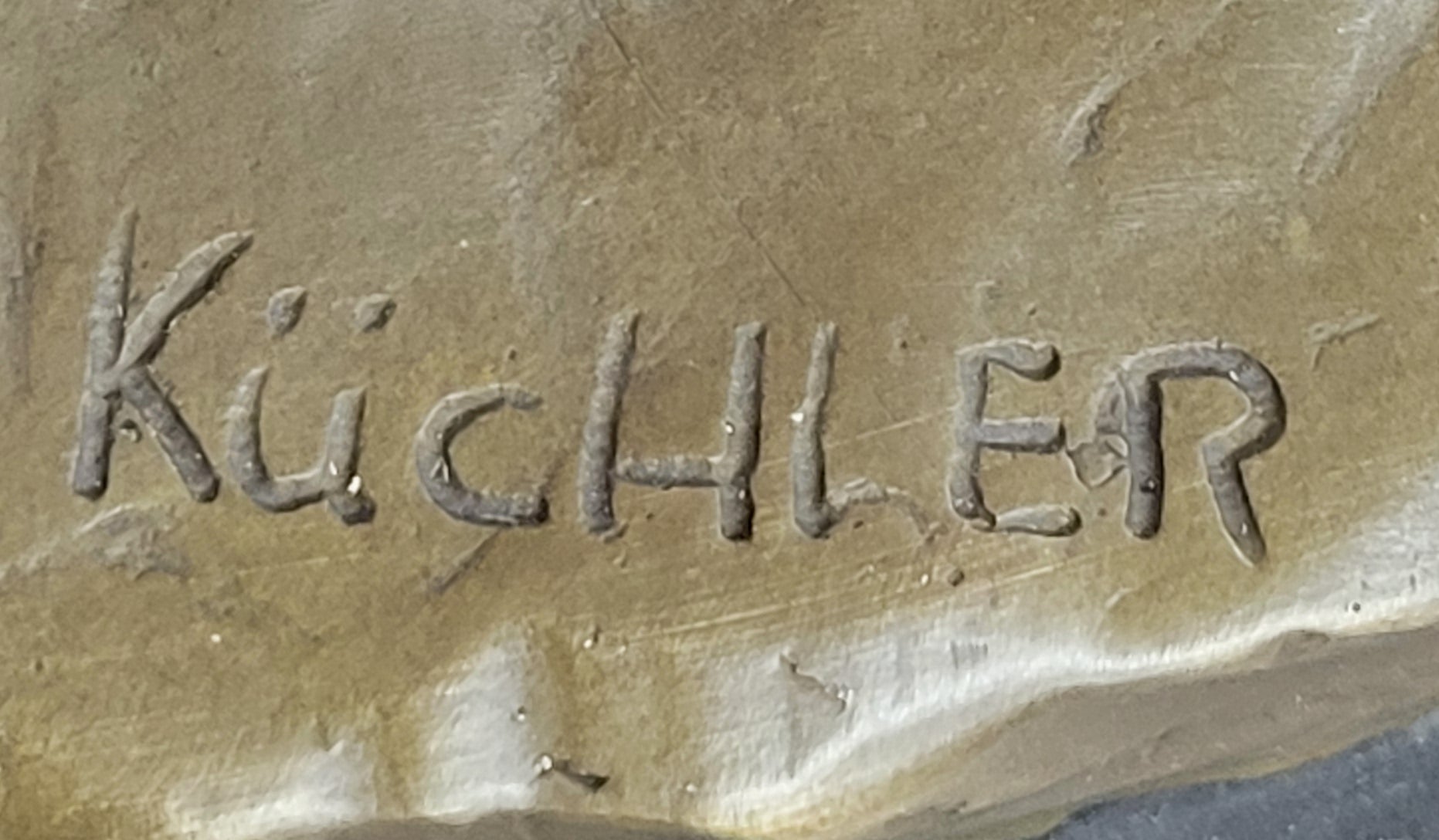 With its large and heavy design, this bronze sculpture becomes a commanding presence, making it a striking focal point in any art collection or space. The combination of Kuchler's signature, the Art Deco style, and the meticulous craftsmanship makes this piece a valuable and collectible work of art.Bronze Dimensions with Marble Base: Height 29" X Width 16"