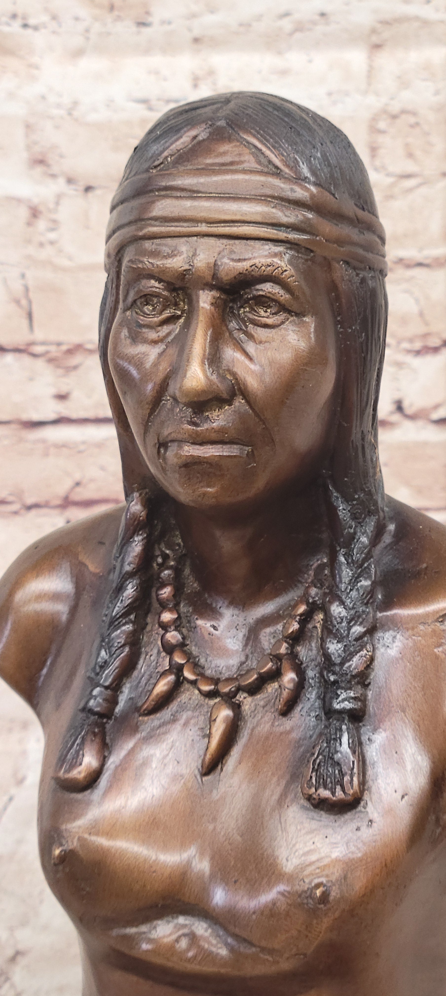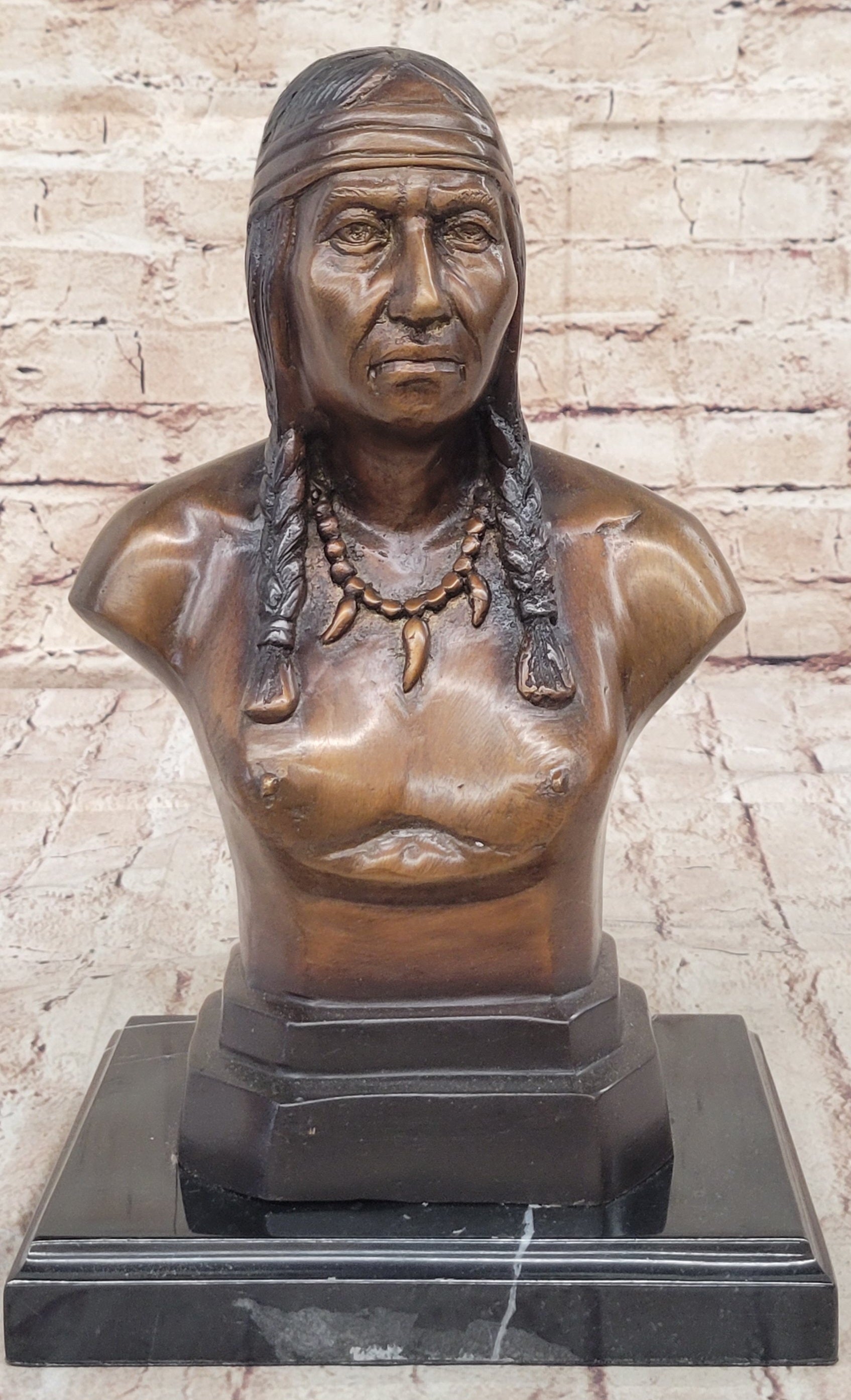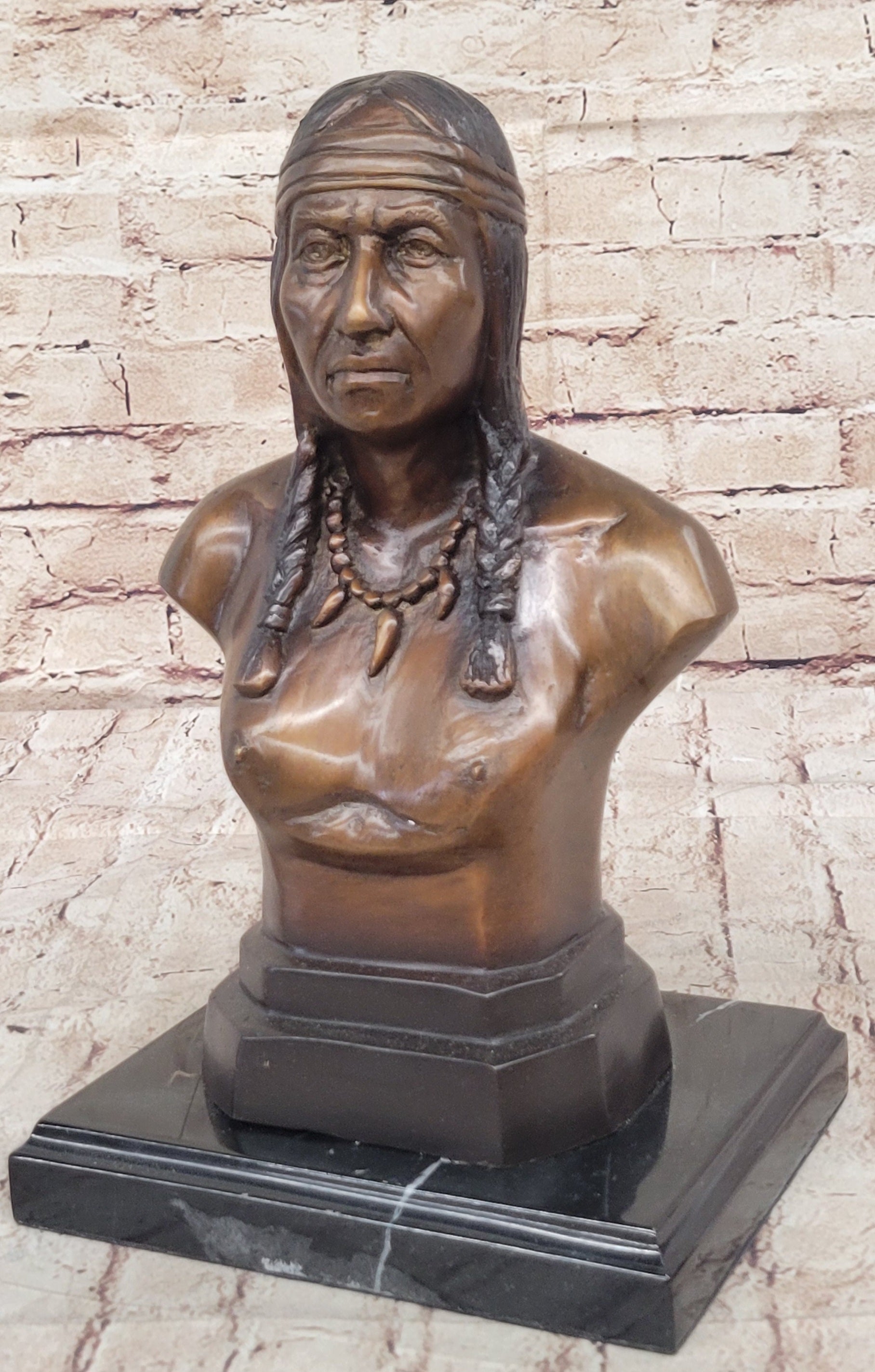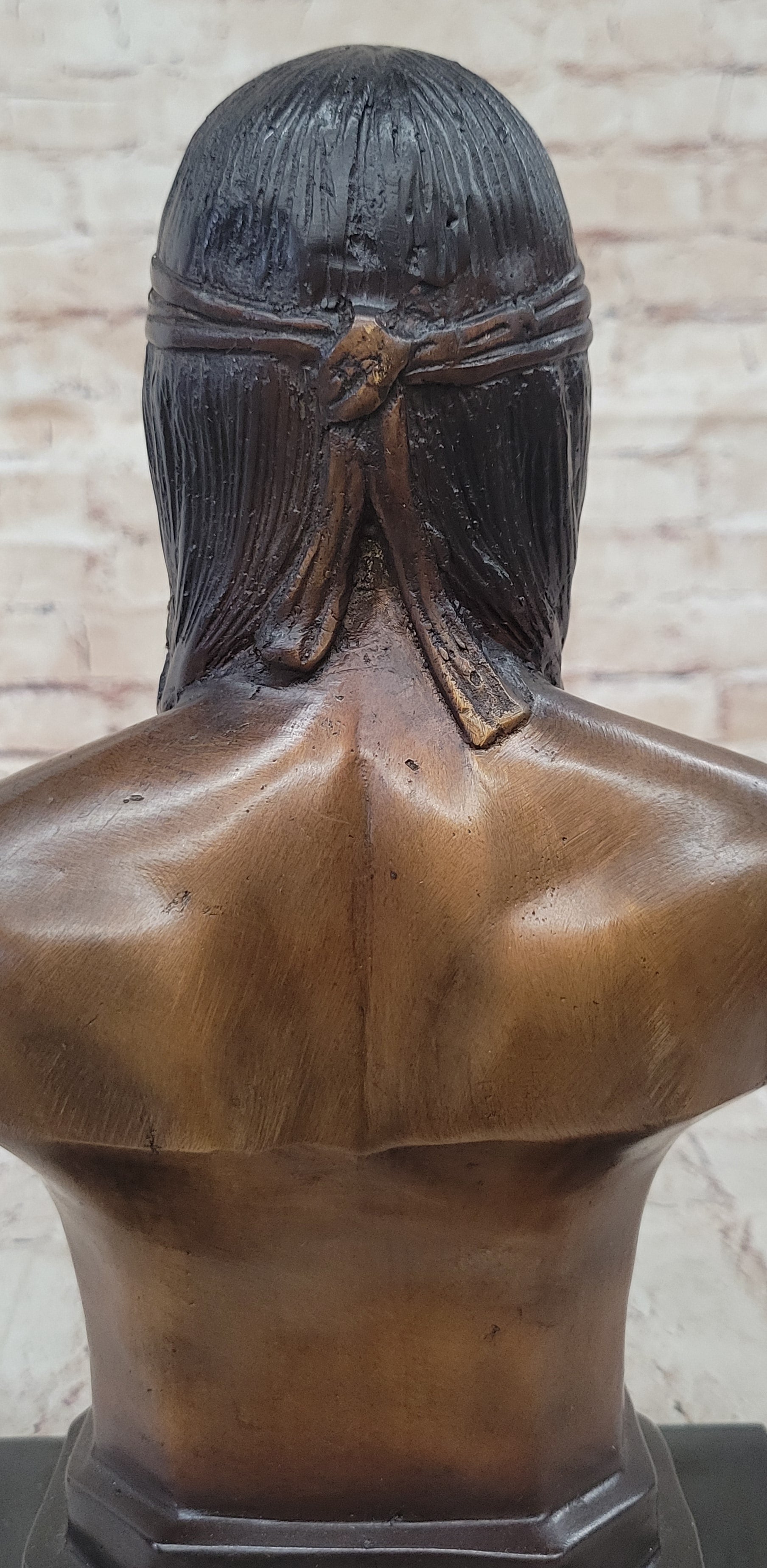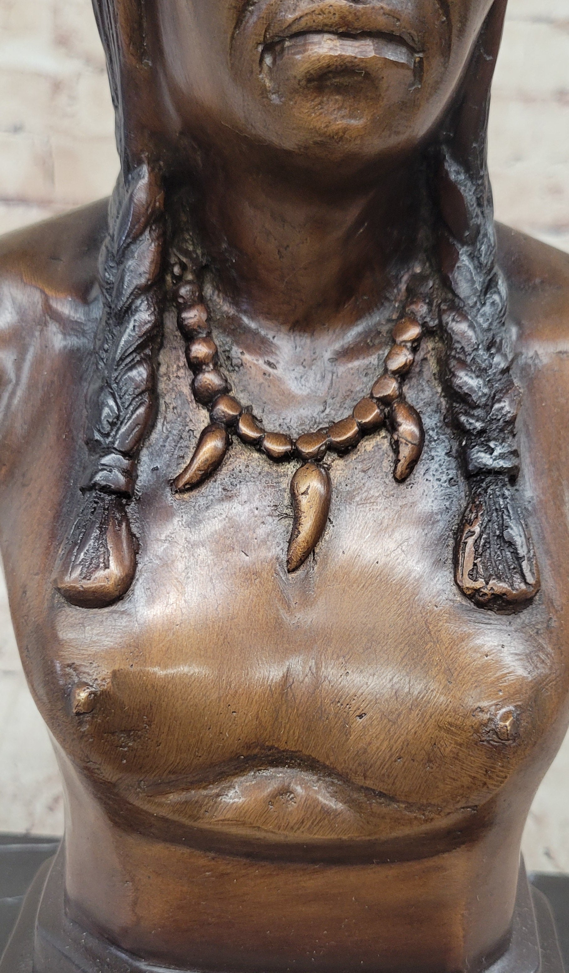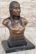 Bronze Bust Native American Indian w/ Braided Hair Statue on Marble Base 12" x 7"