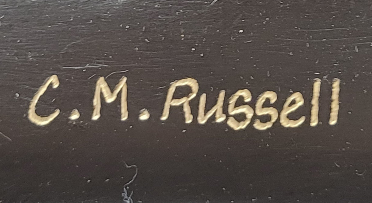 Molded using the archaic method of lost-wax casting, this sculpture achieves a level of detail that brings the warrior chief to life. The skin tones are finished in a brown patina stain, contributing to the overall lifelike appearance and providing a sense of permanence. The bust is skillfully mounted upon a black marble base, creating a visually striking and stable presentation. The signature of C.M. Russell, the artist behind this remarkable piece, adds quality and recognition to the sculpture, showcasing the dedication and expertise involved in its creation.