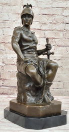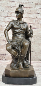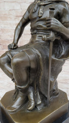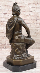 This captivating bronze sculpture captures the essence of a Roman legionnaire, seated with an air of strength and unwavering valor. Clad in full soldier's regalia, the legionnaire's stoic expression and powerful stance embody the dutiful spirit of a warrior committed to the protection of his empire and homeland. His presence is commanding, a true representation of the bravery and discipline that defined the Roman military.